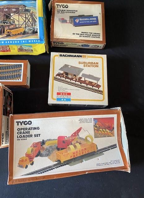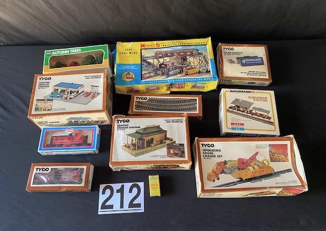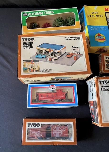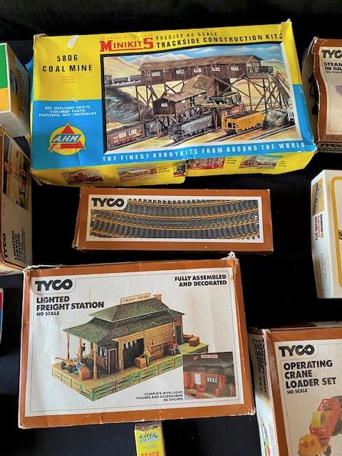 Includes: train cars, building, track & more. Estimated weight of lot: 5lbs. Measurement: 17" x 14" x 12"