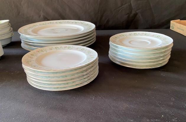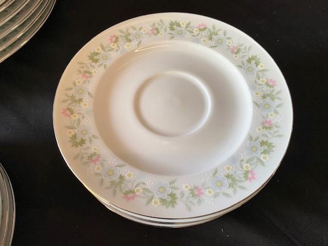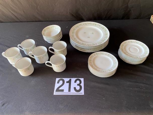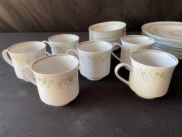 Includes: cups, saucers, dinner plate, bred plate, fruit bowl.