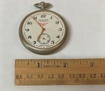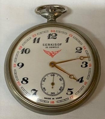 18 jewels embossed on reversed. Made in Russia. Working at time of cataloging. Measurements: 2" diameter.
