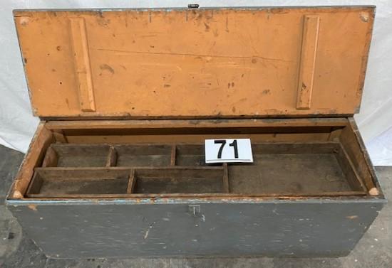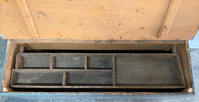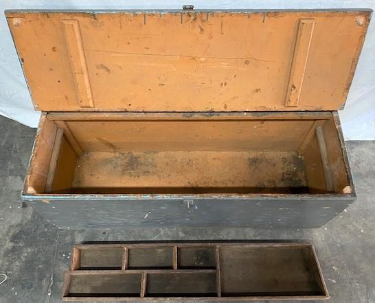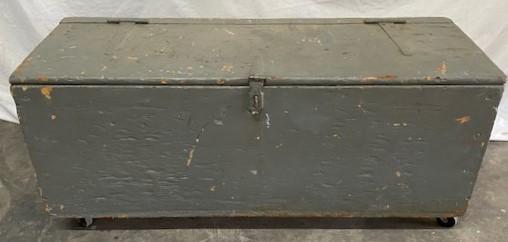 Believed to be handmade. Painted gray. Hasp on it & tray insert. On Wheels. Measurements: 40"L x 18"H x 14"D (with wheels).