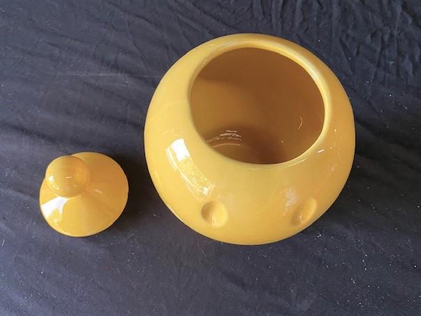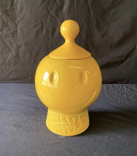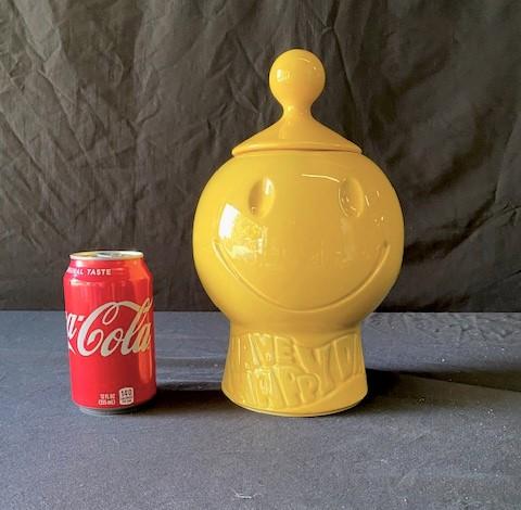 "Have a Happy Day". Hairline crack in the glaze. Measurement: 11"H x 7"diameter (with lid)