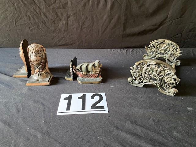 Owls are solid copper. Signed and/or numbered. Believed to be Turn-of-the Century. Minimal paint loss on sailing ship book ends. Estimated weight of lot: 10lbs. Measurement: 10"L x 6 1/2"W x 4"D (largest item)
