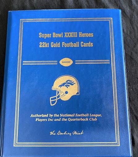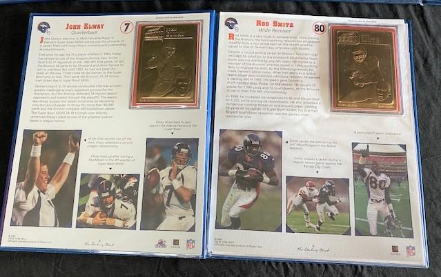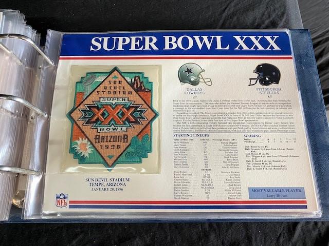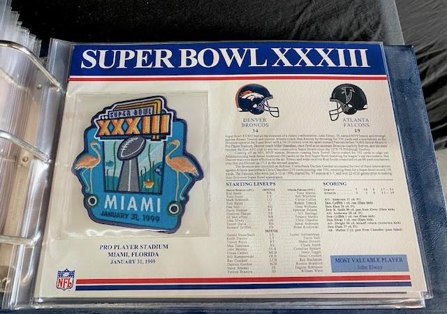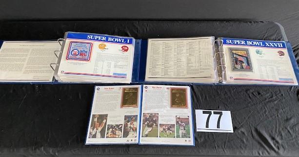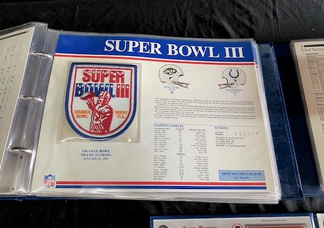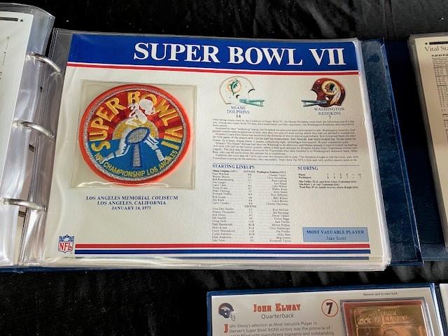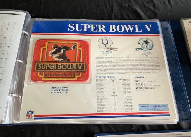 Includes: Replica Super Bowl Patches 1967-2000 & Denver Broncos 22K Gold Cards. Binders are Willabee & Ward. Estimated weight of lot: 10lbs. Measurement: 15 1/2" x 10" x 6"H(largest binder)