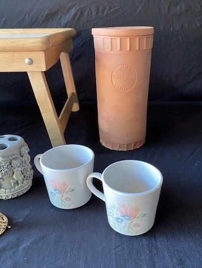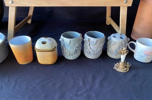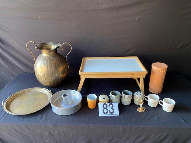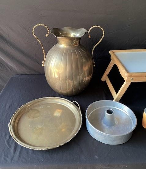 Includes terra cotta wine cooler, brass pieces, tray table, and more. Total of 13 pieces. Estimated weight of lot: lbs. Measurement: