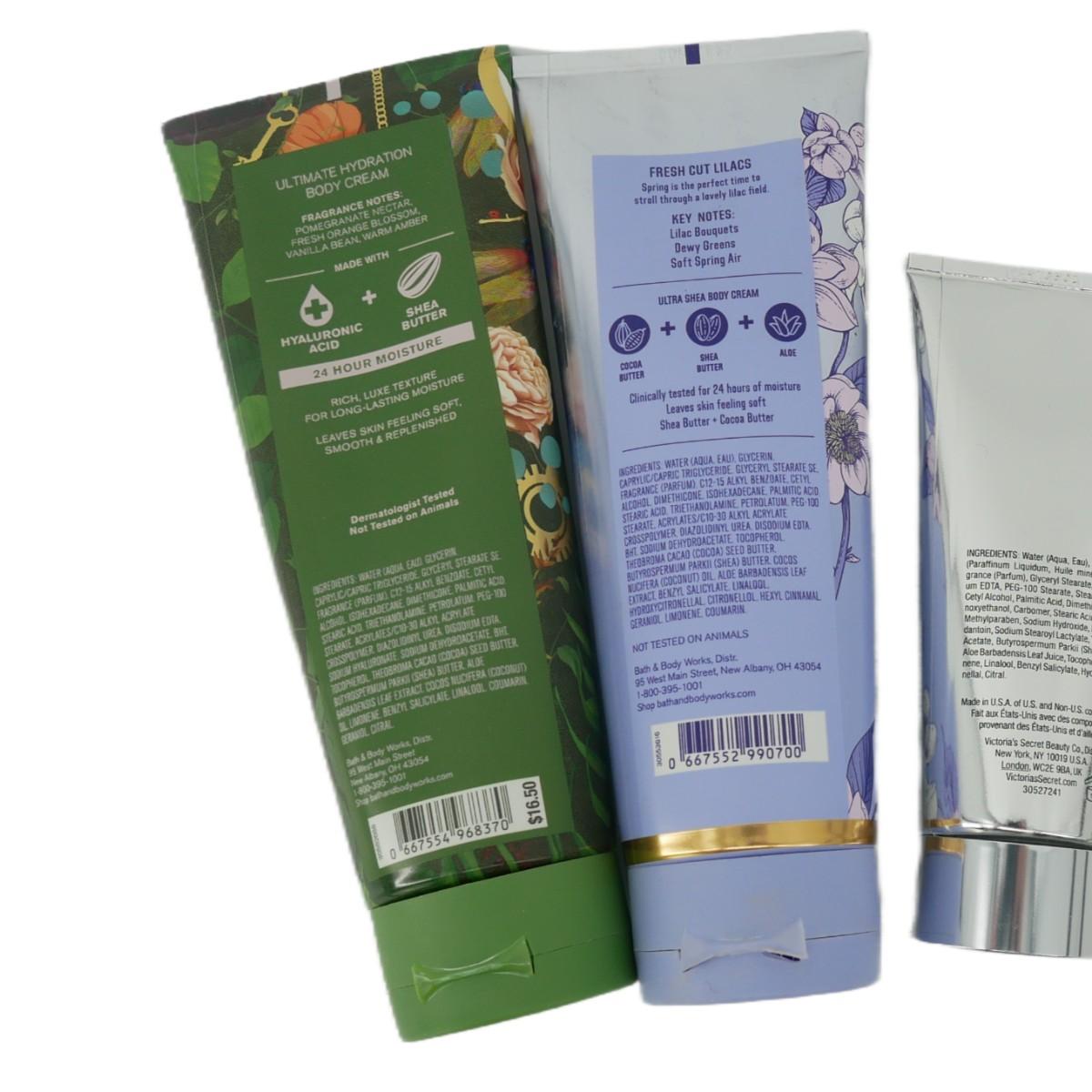 Four bottles of lotion, two bath and body works lotions are about half full and the smaller bottles are new and unused.