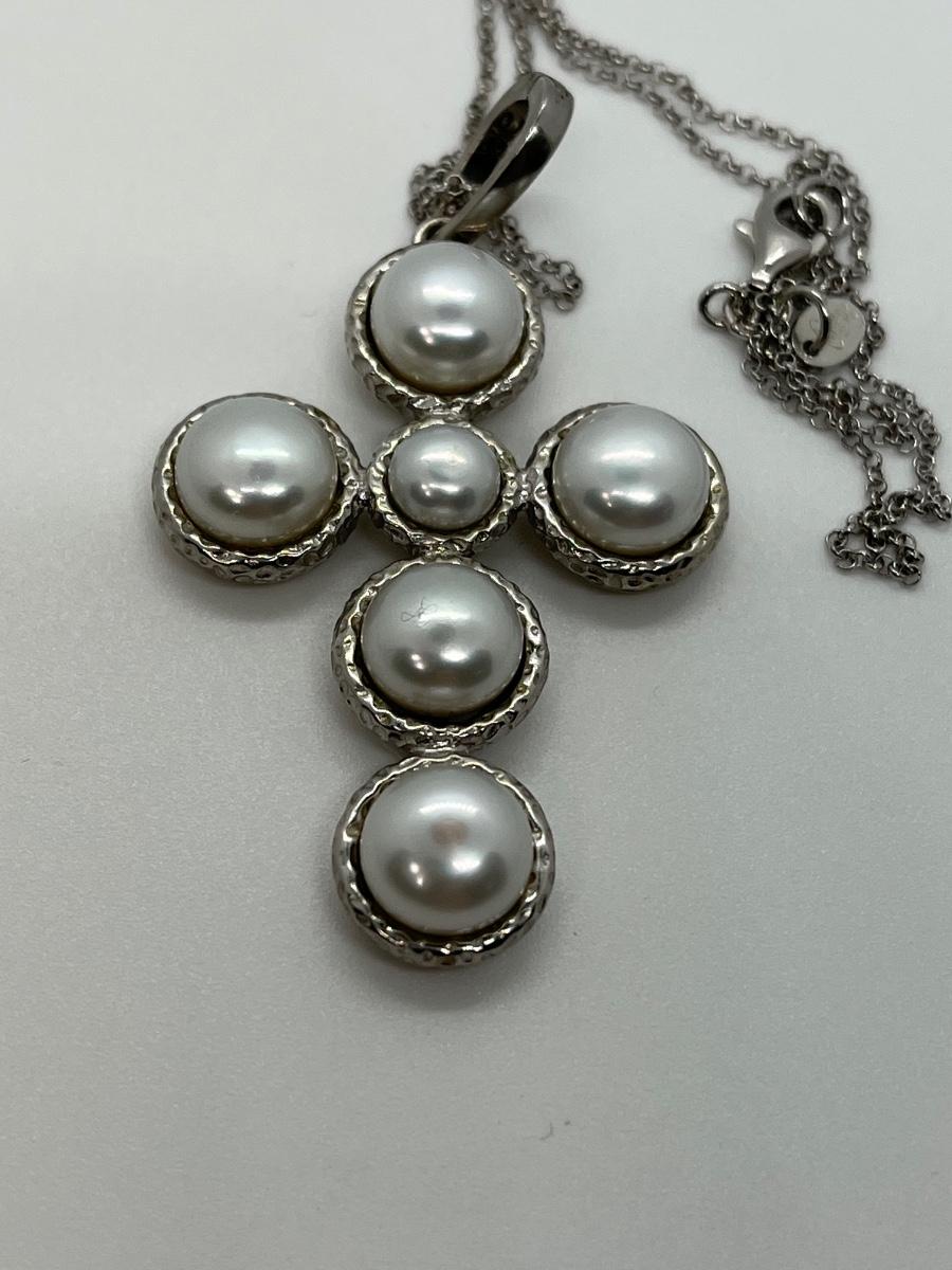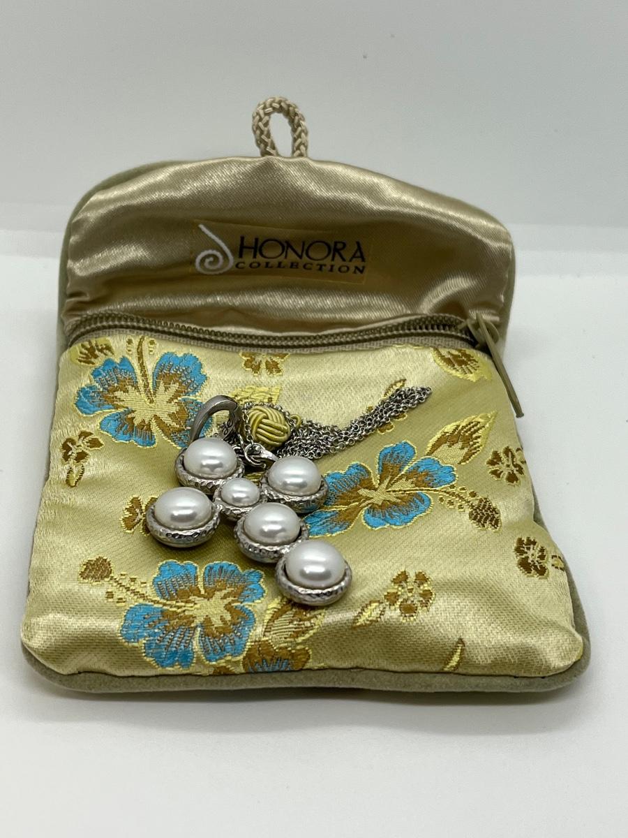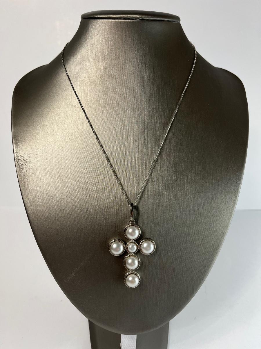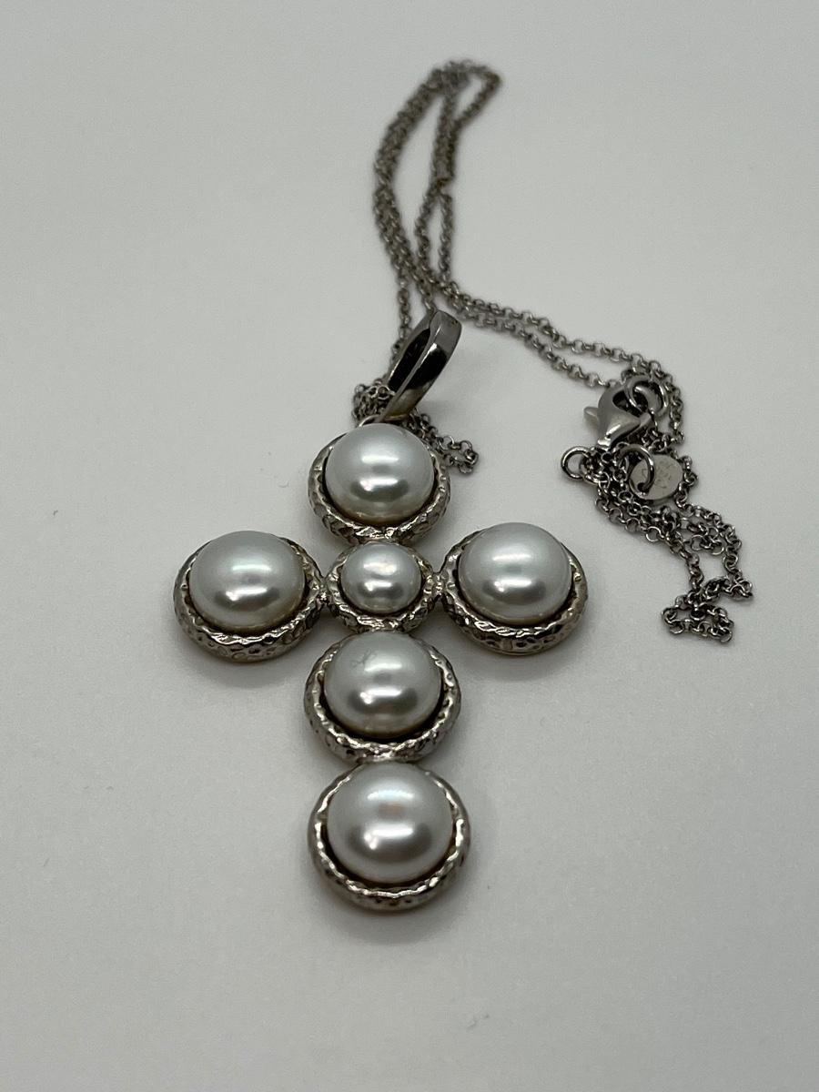 LOTJ52: New in box Honora Cultured White Pearl Cross Sterling Enhancer/Pendant and 18" Chain