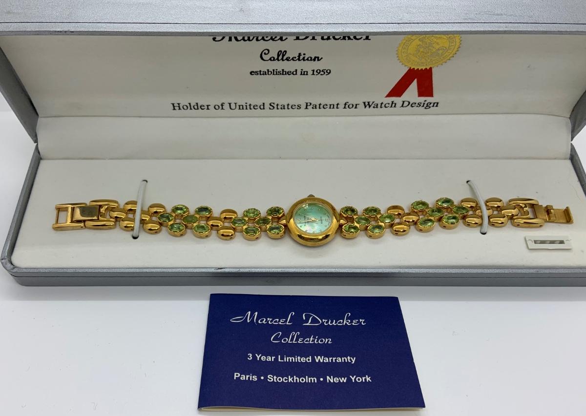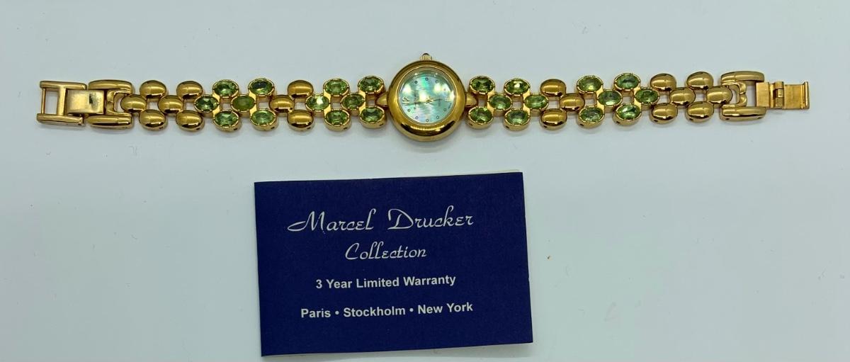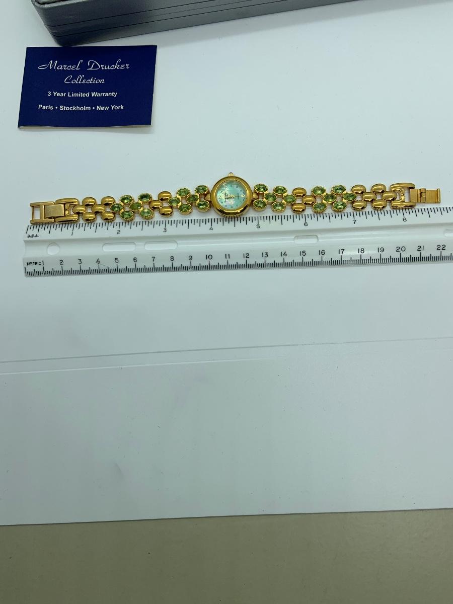 LOTJ82: New in Box Marcel Drucker Oval Peridot Gemstones  Goldtone Bracelet Watch 8" long NEEDS NEW BATTERY