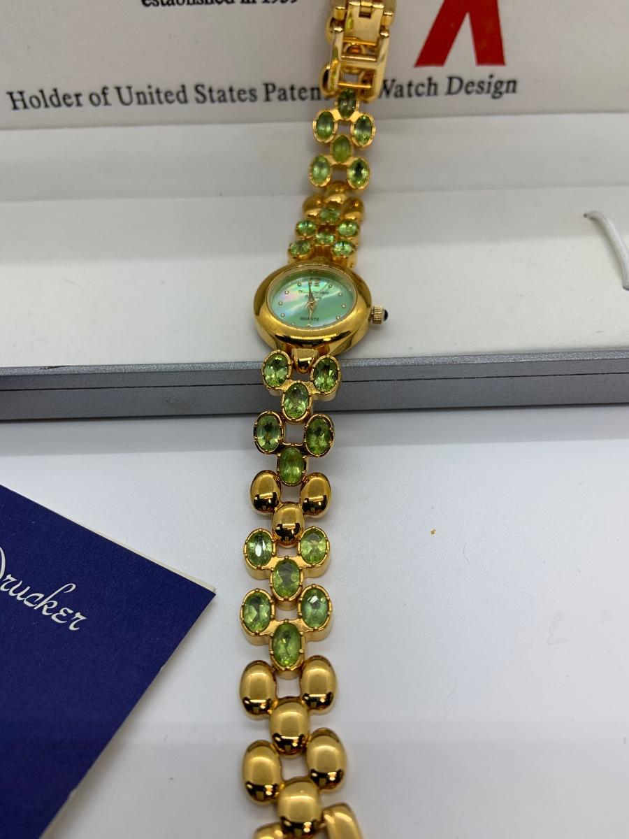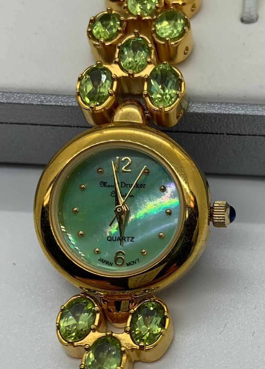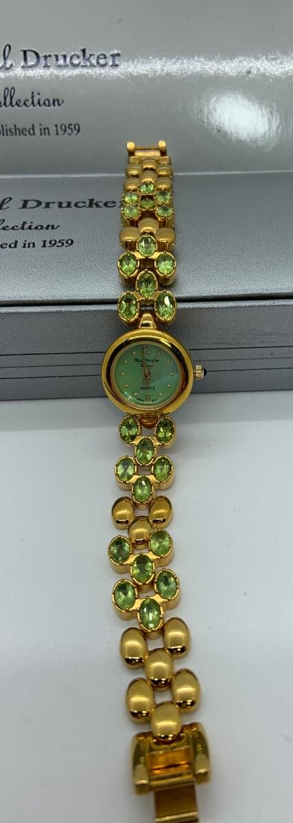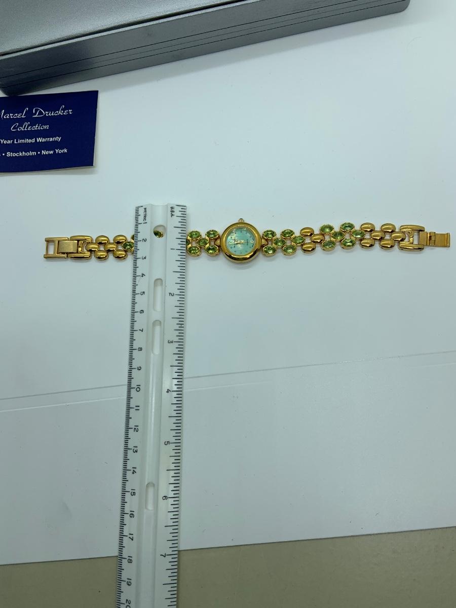 LOTJ82: New in Box Marcel Drucker Oval Peridot Gemstones Goldtone Bracelet Watch 8" long NEEDS NEW BATTERY