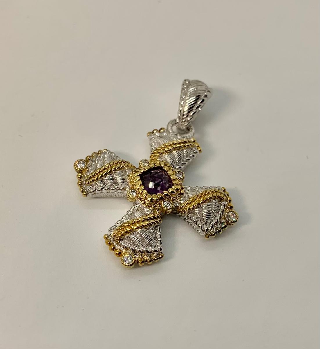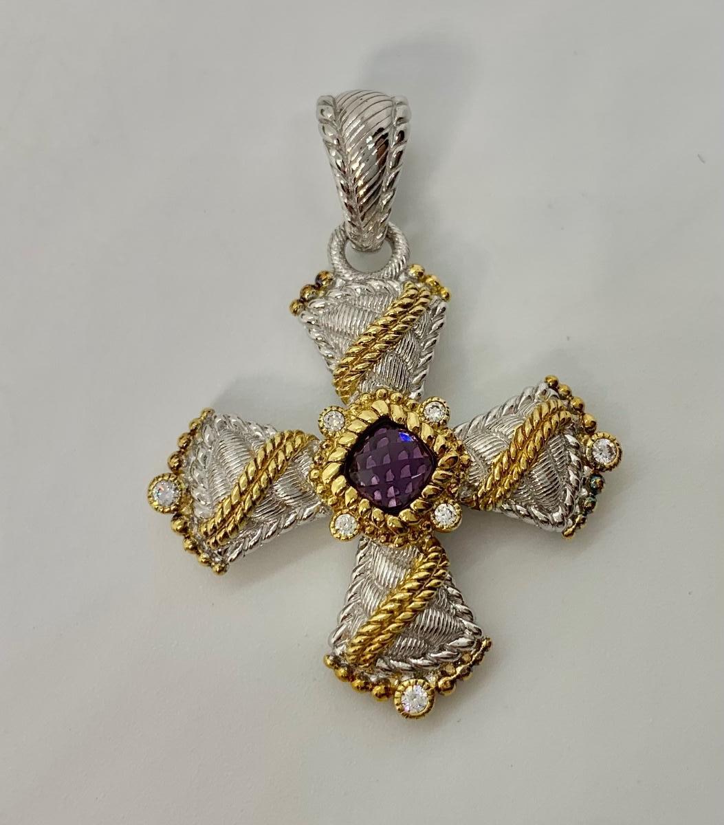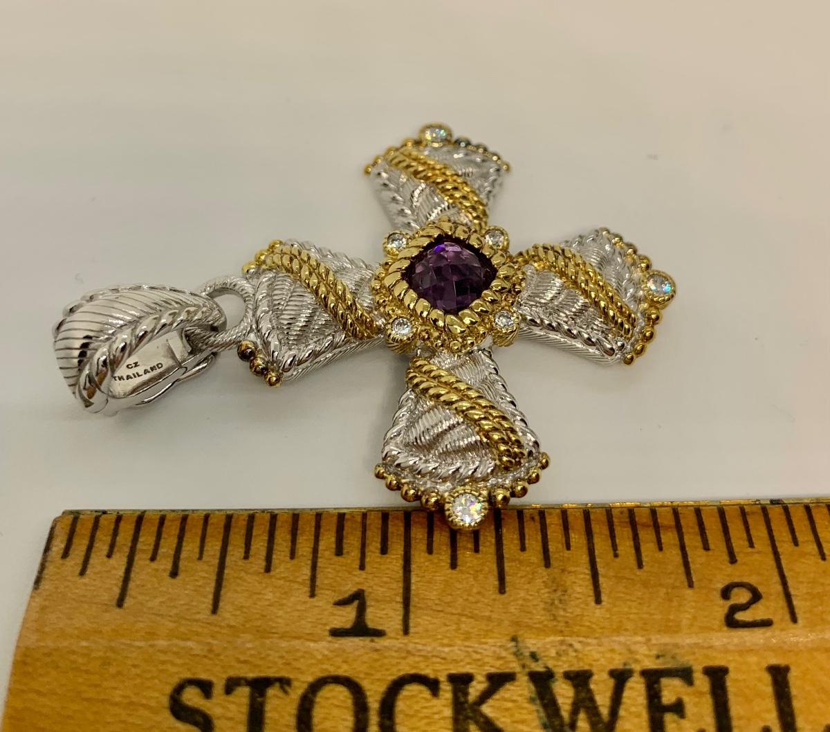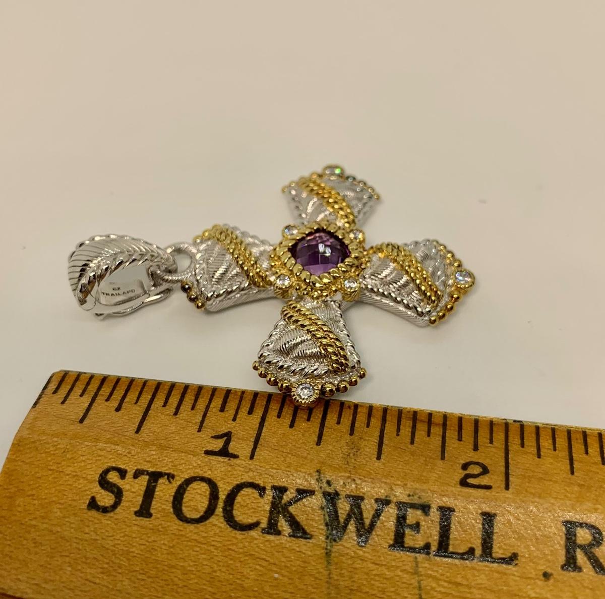 LOTJ131: New in box Judith Ripka Sterling 14k Clad Amethyst Cross Enhancer/ Pendant