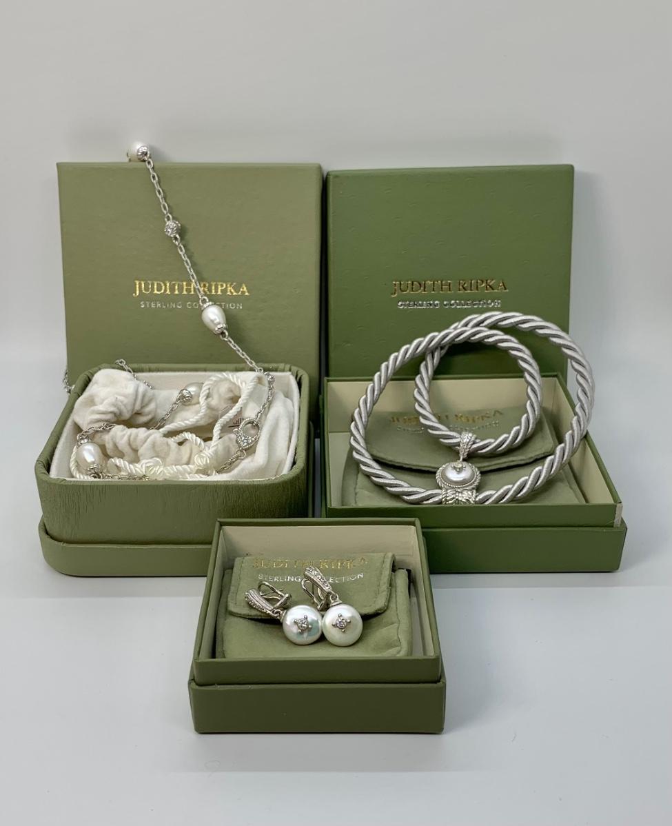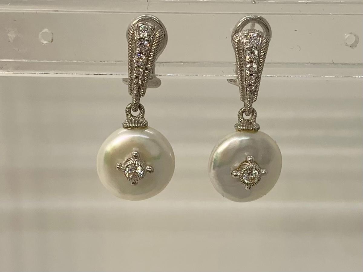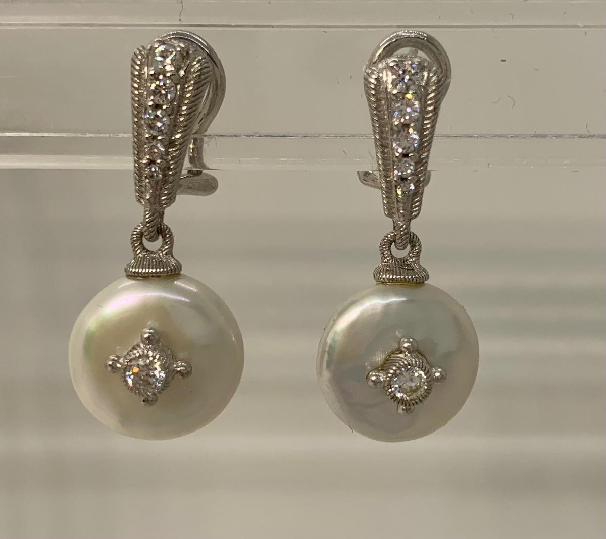LOTJ140: New in box Judith Ripka STERLING 22" Cultured fresh water pearl Chain, Cultured Pearl Coin Enhancer Necklace and Matching Pierced DropEarrings