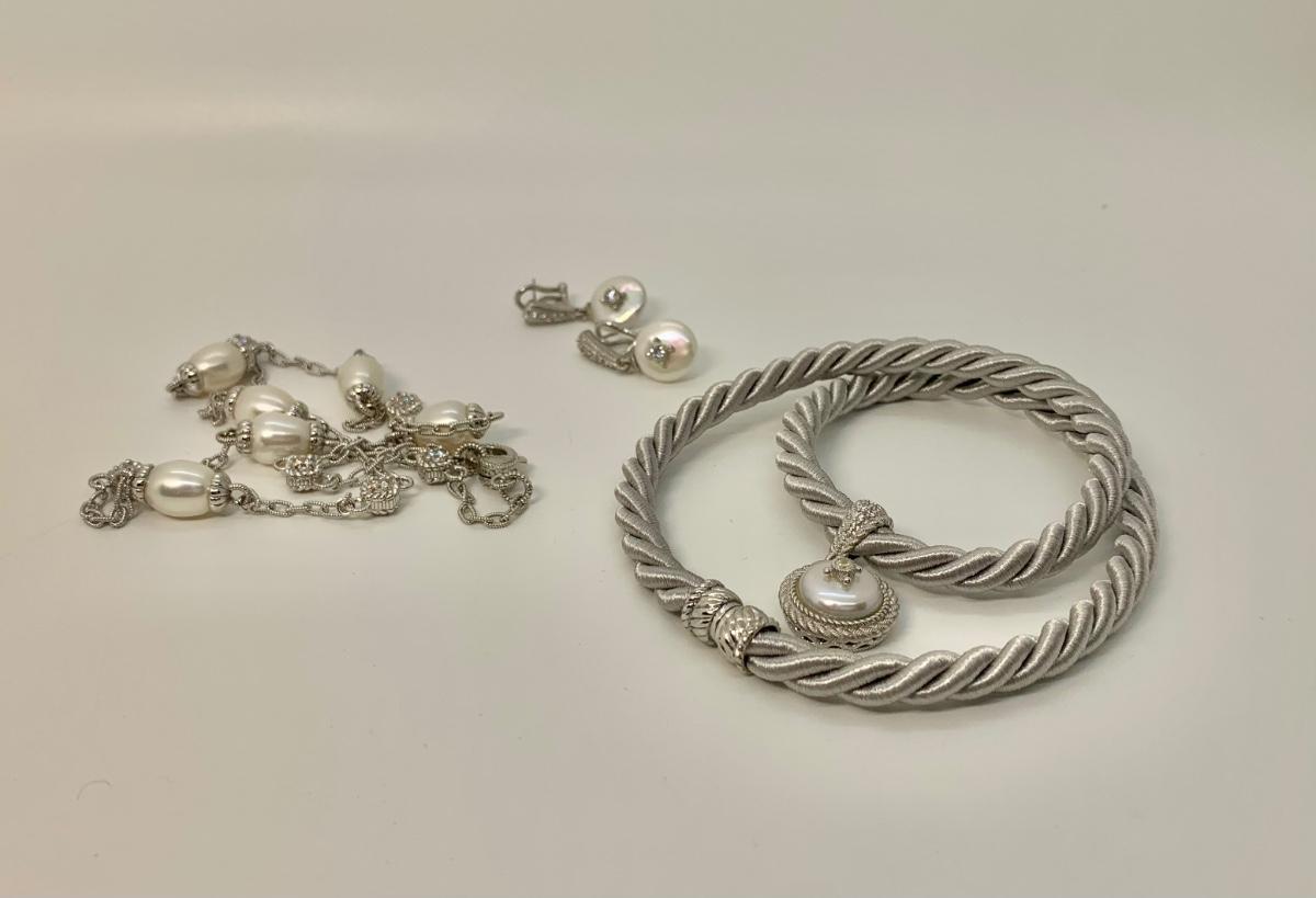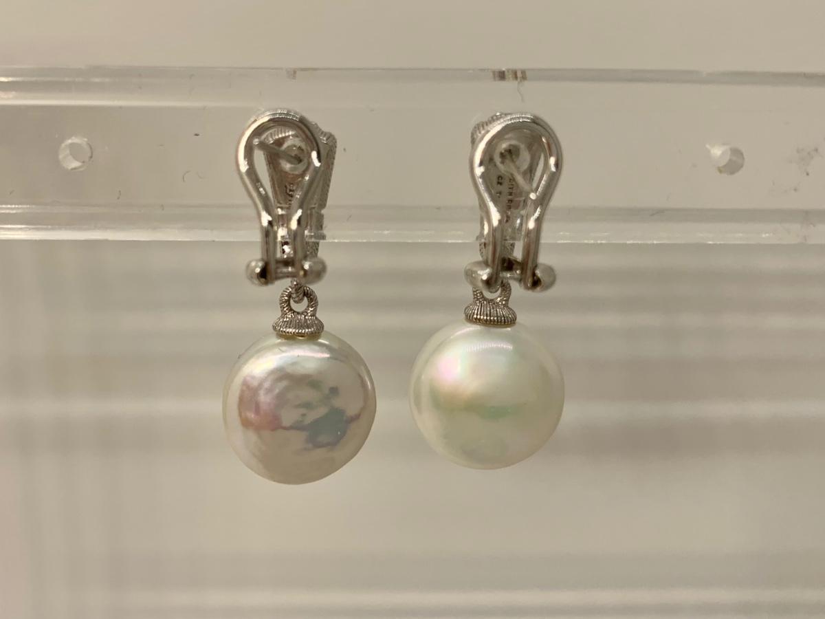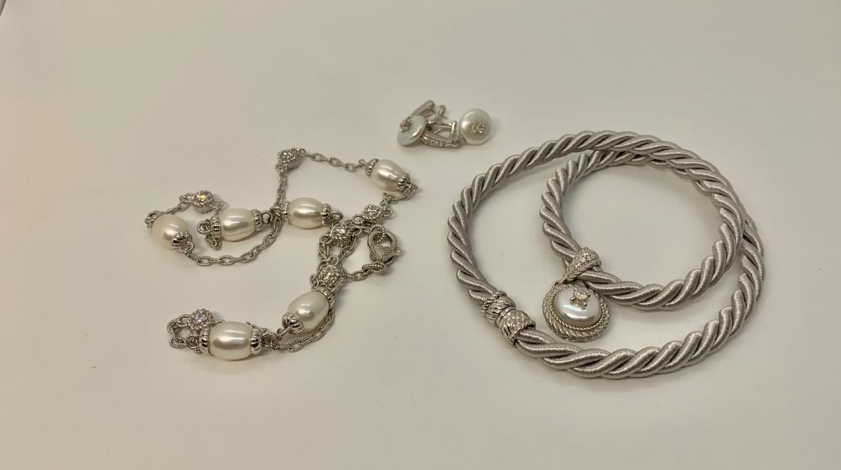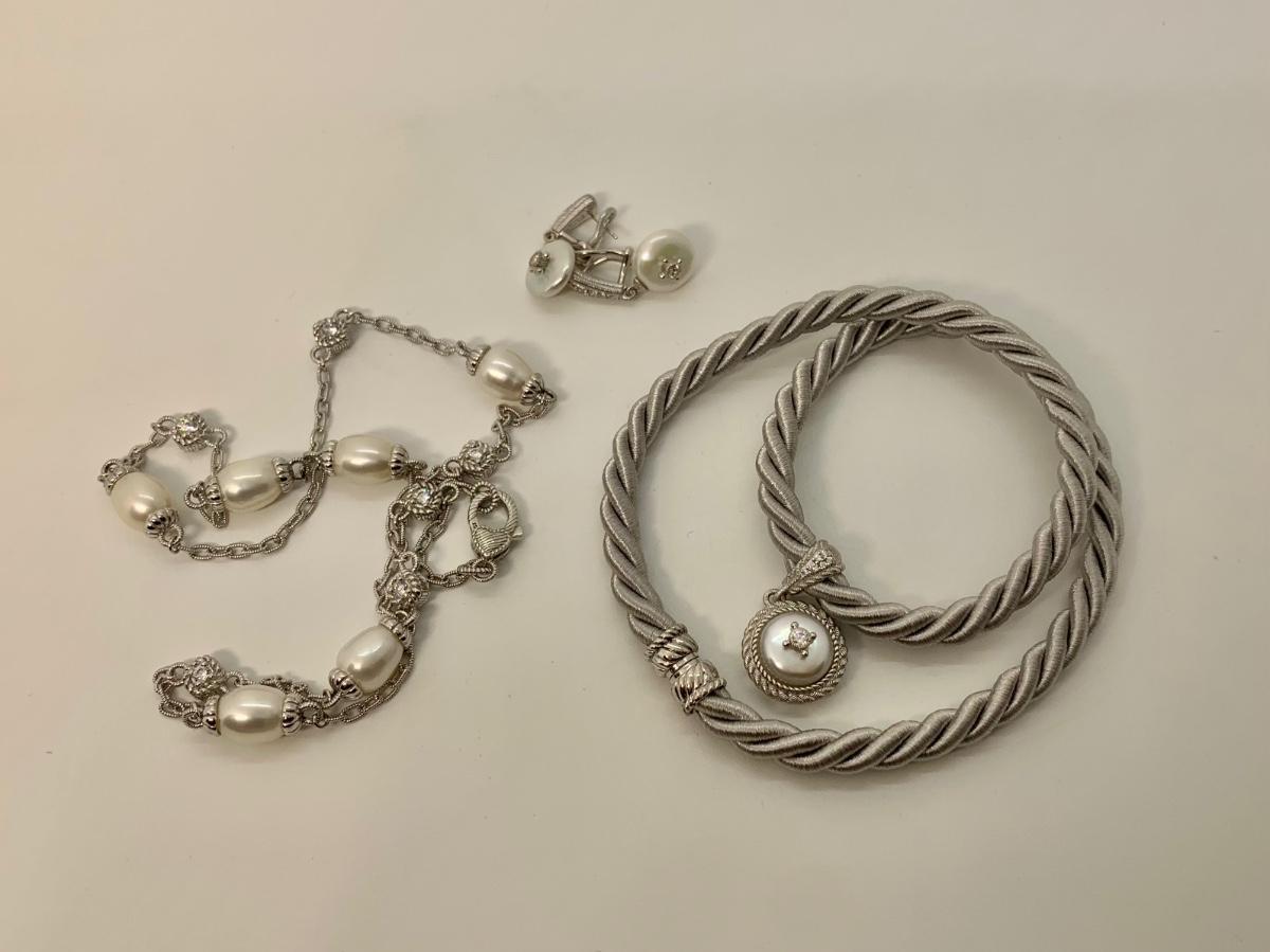 LOTJ140: New in box Judith Ripka STERLING 22" Cultured fresh water pearl Chain, Cultured Pearl Coin Enhancer Necklace and Matching Pierced DropEarrings