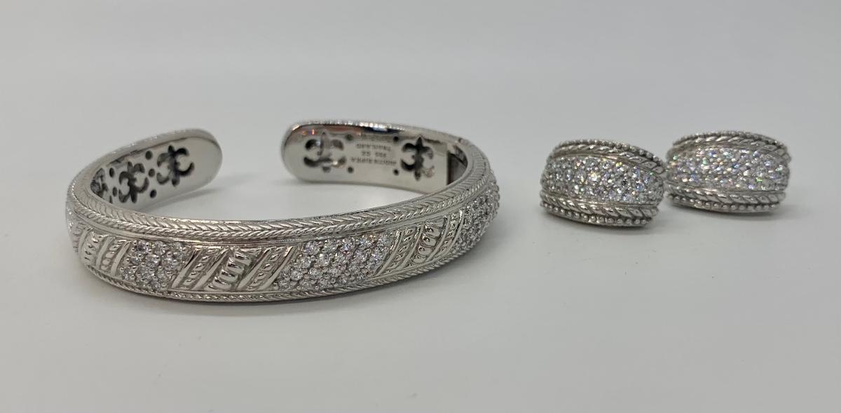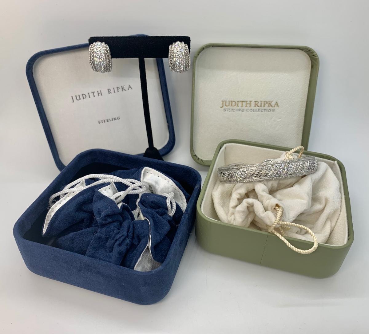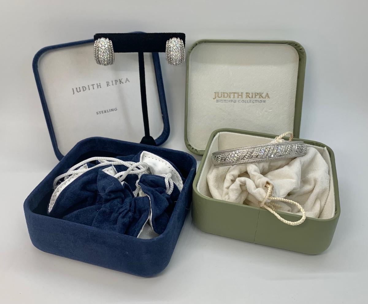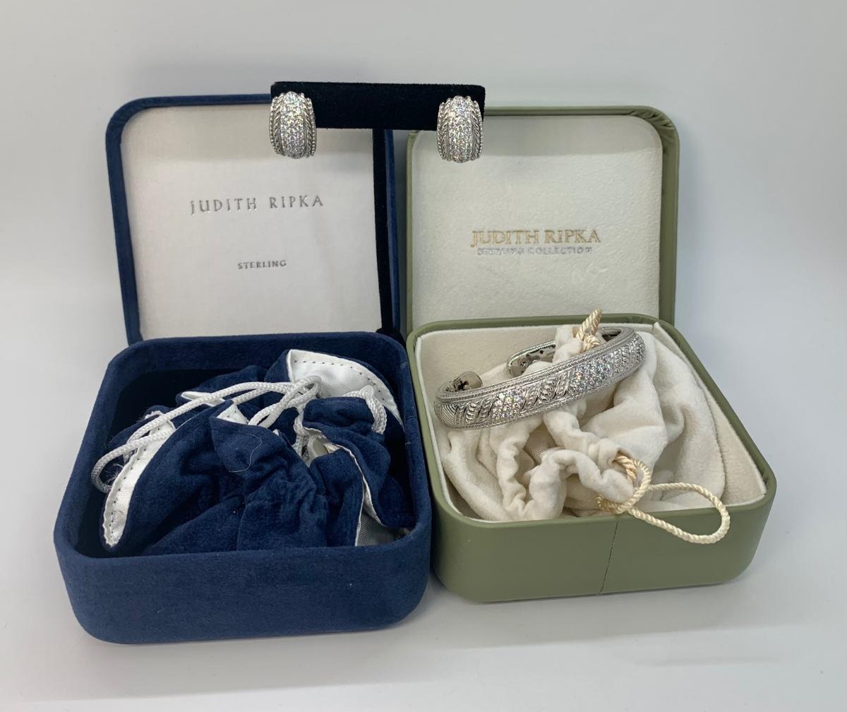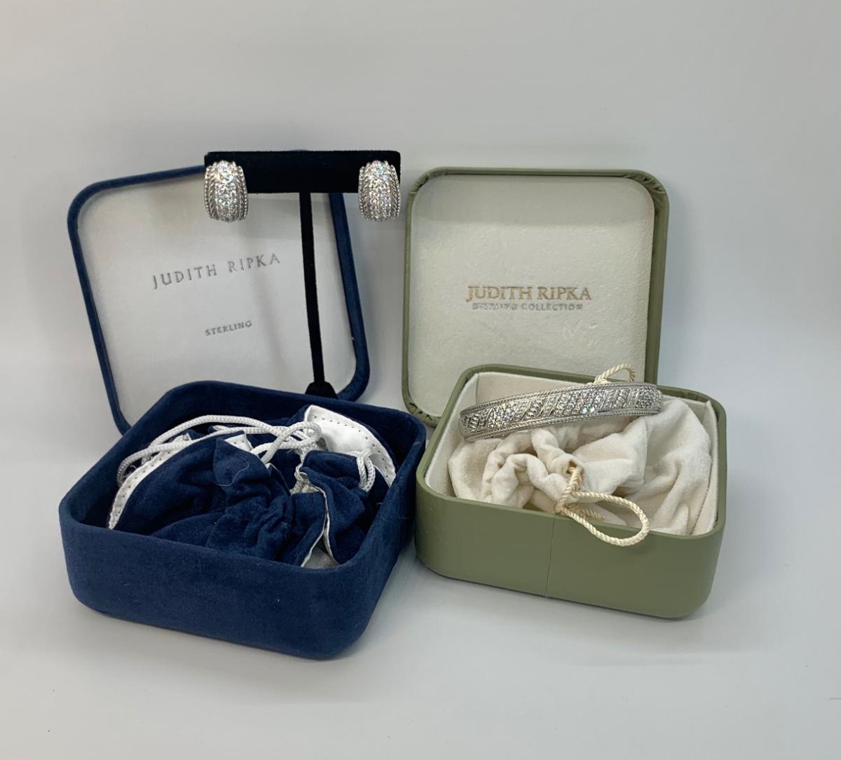 LOTJ144: New in box Judith Ripka and Diamonique Sterling Bangle Bracelet and Pierced Earring