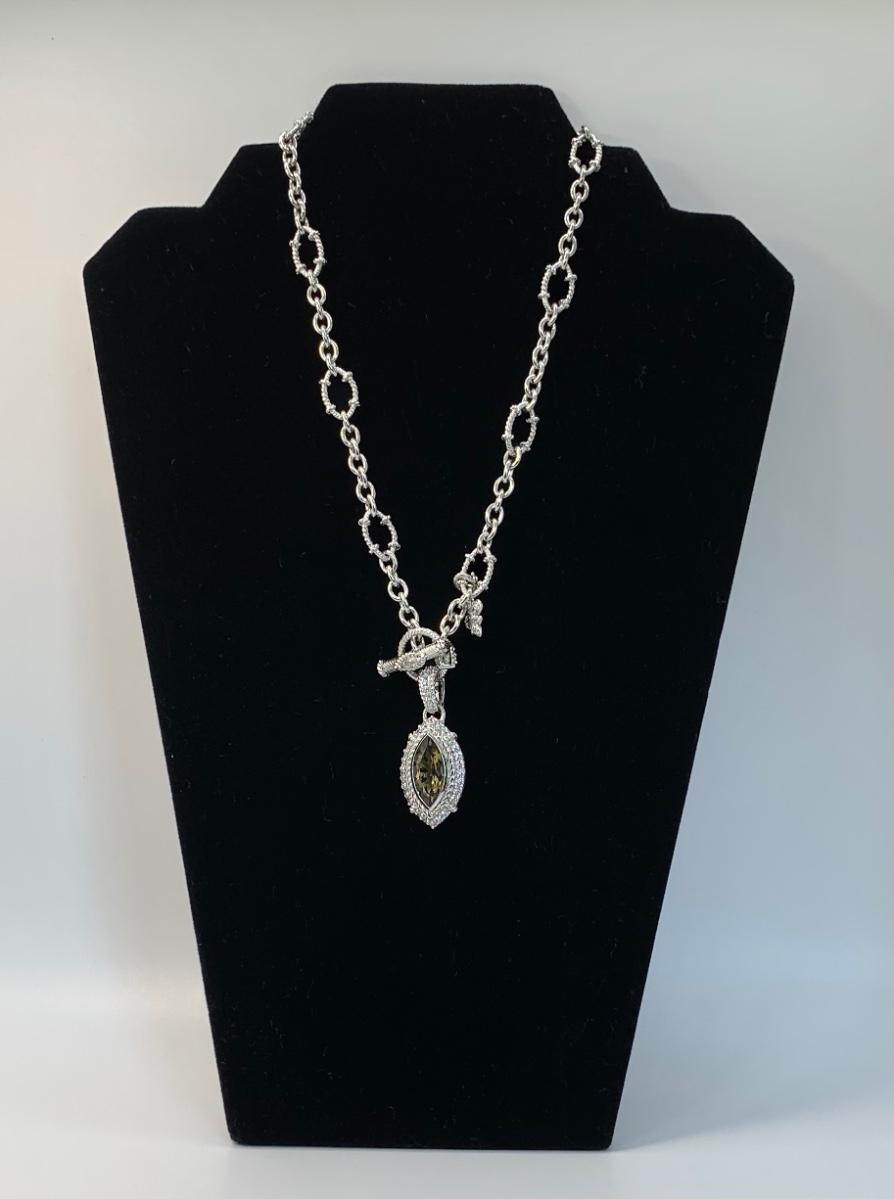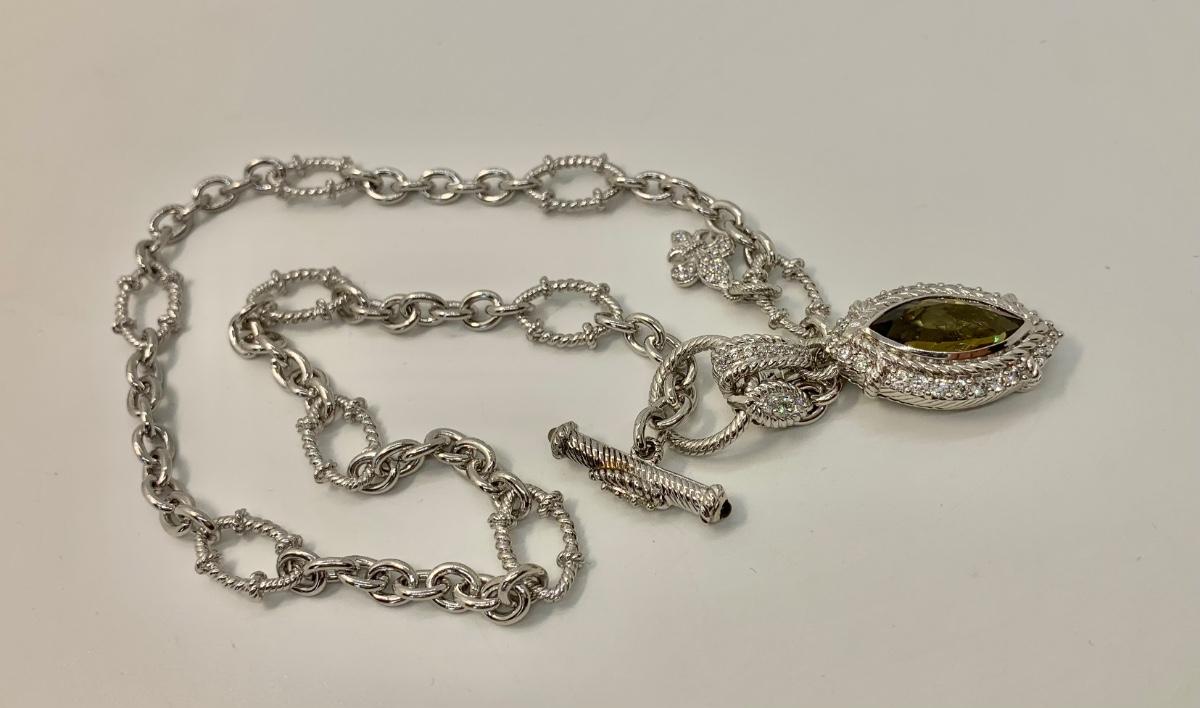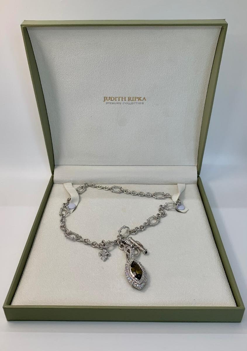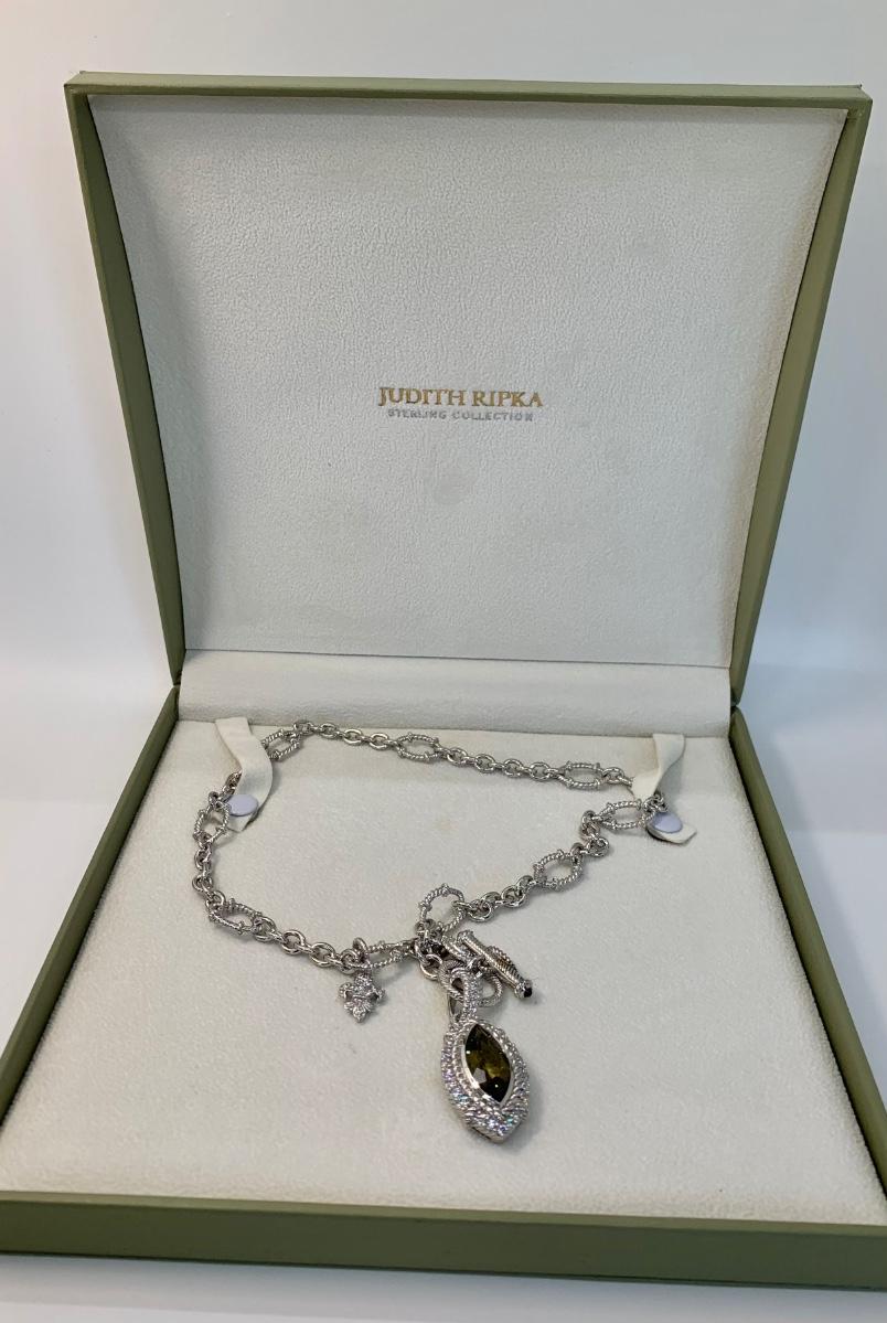 LOTJ149: New in Box Judith Ripka Diamonique Sterling Silver 17" L Necklace with Olive gem and charm