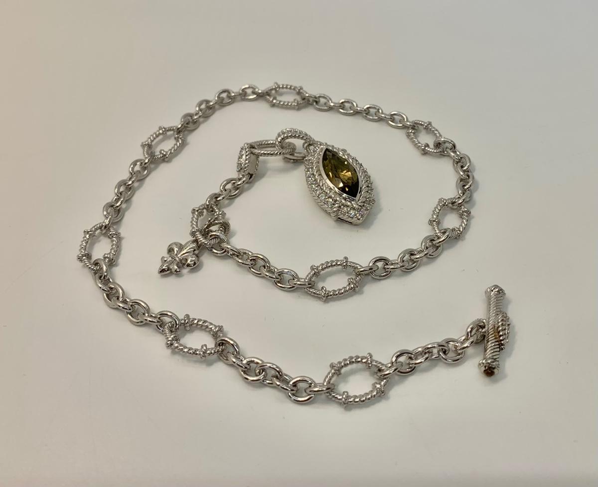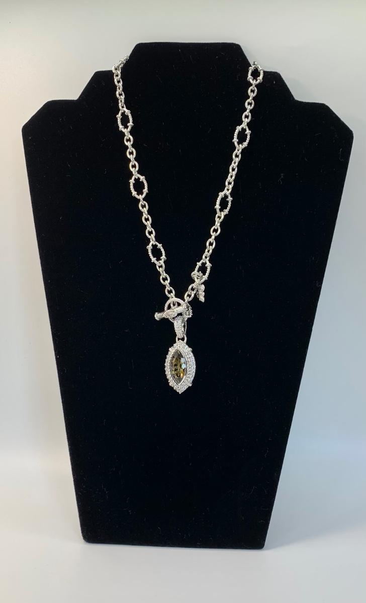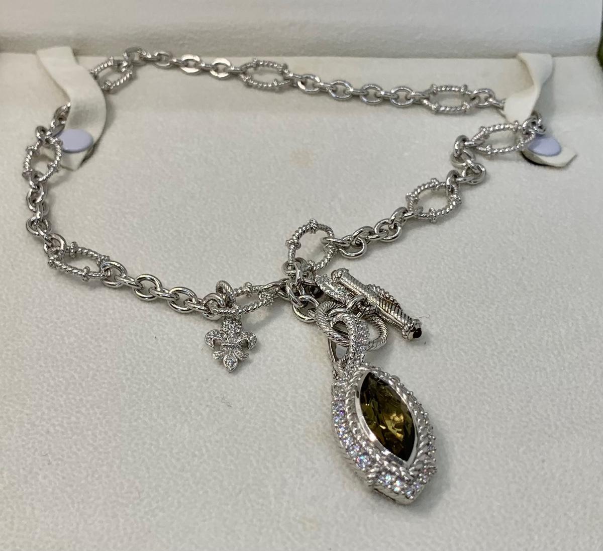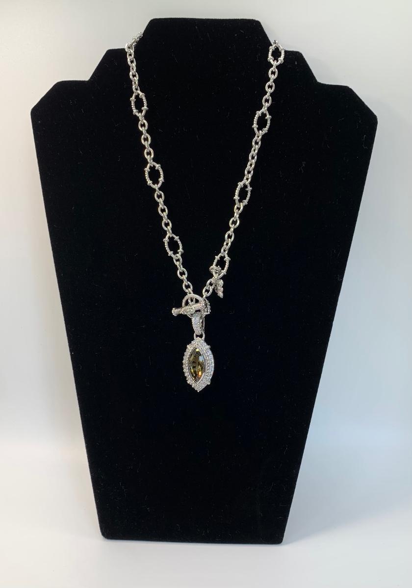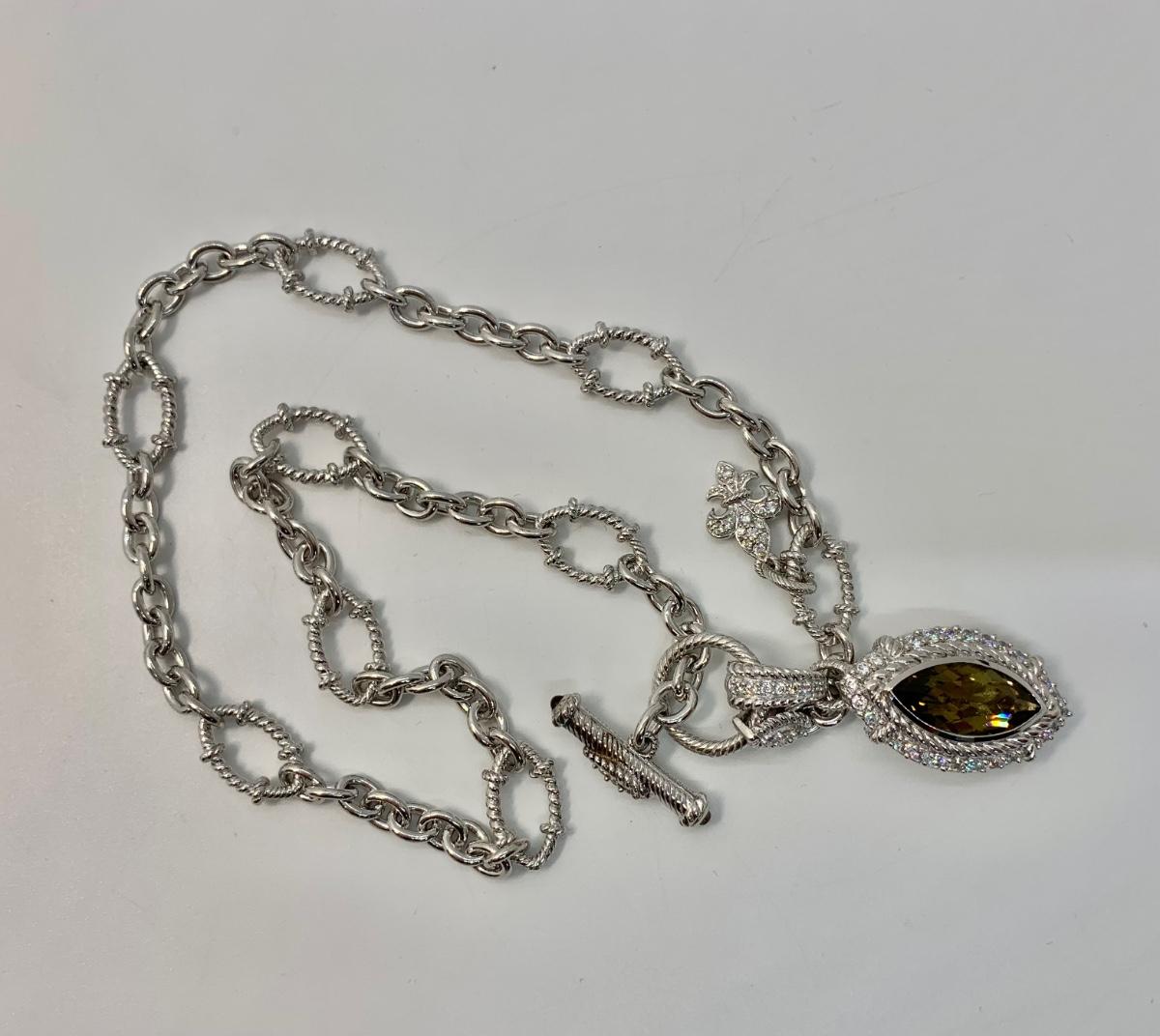 LOTJ149: New in Box Judith Ripka Diamonique Sterling Silver 17" L Necklace with Olive gem and charm