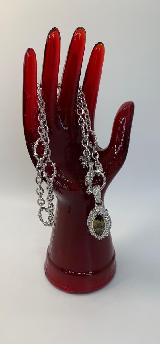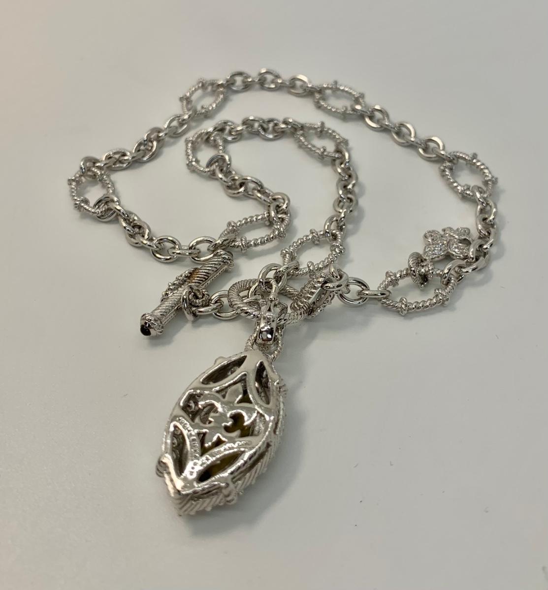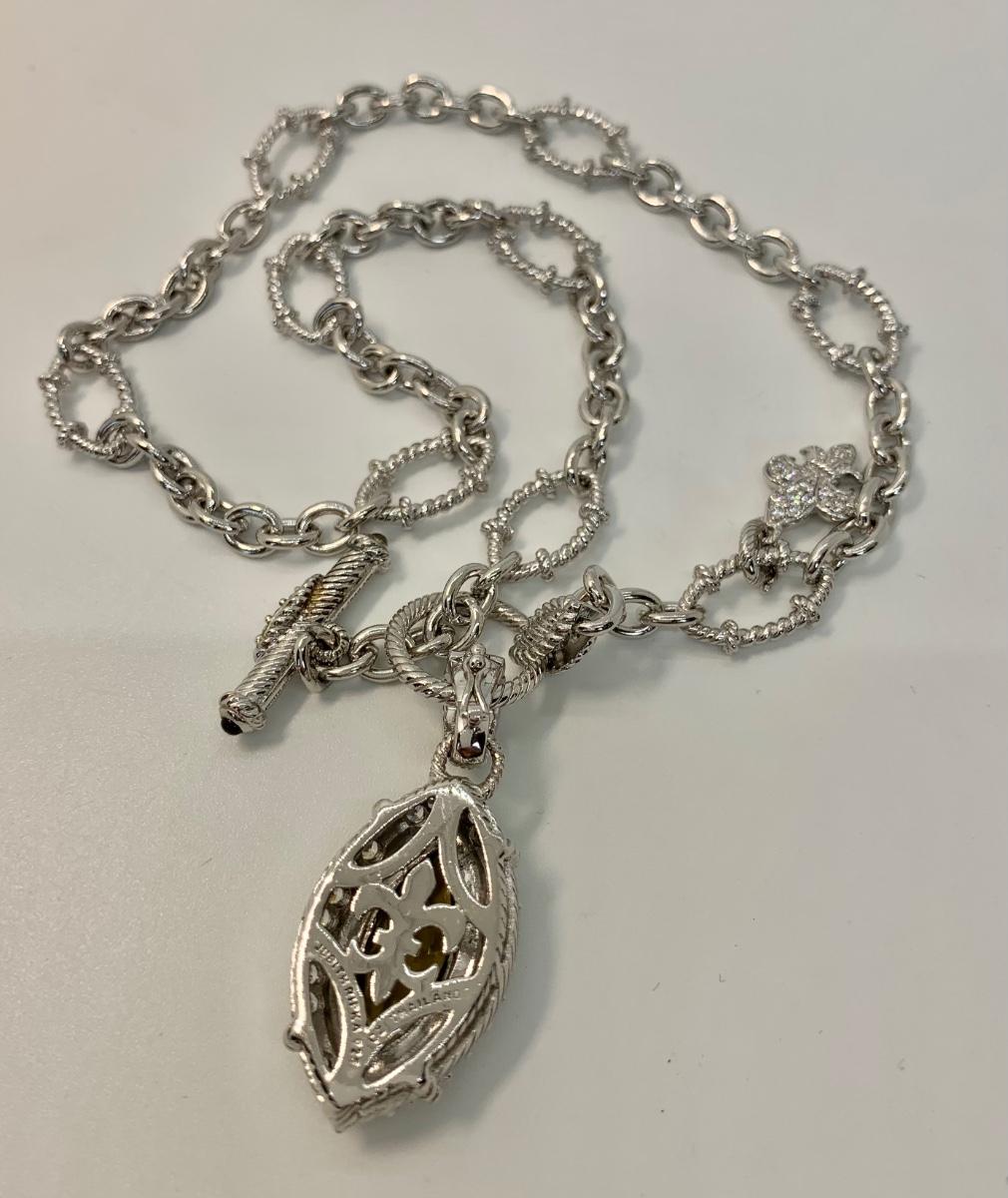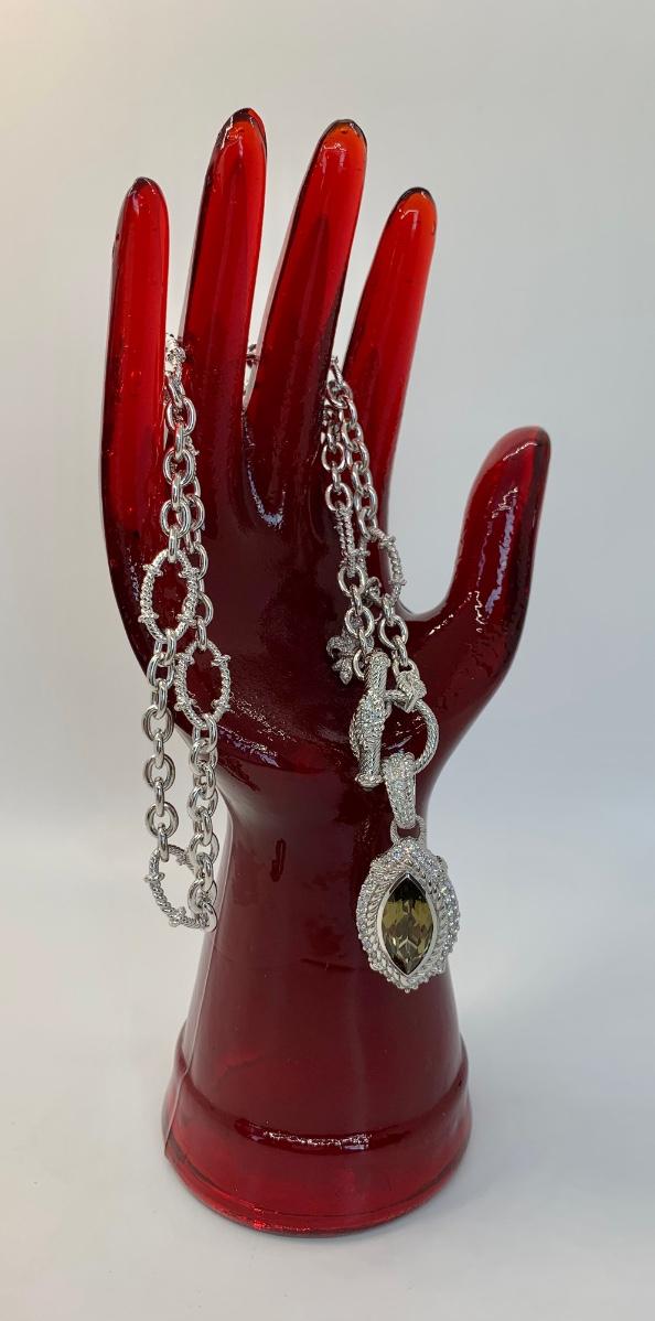 LOTJ149: New in Box Judith Ripka Diamonique Sterling Silver 17" L Necklace with Olive gem and charm