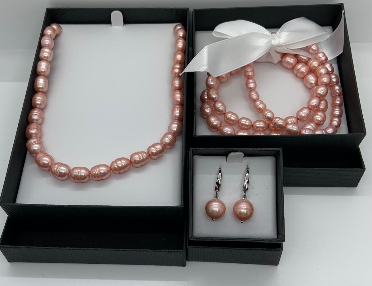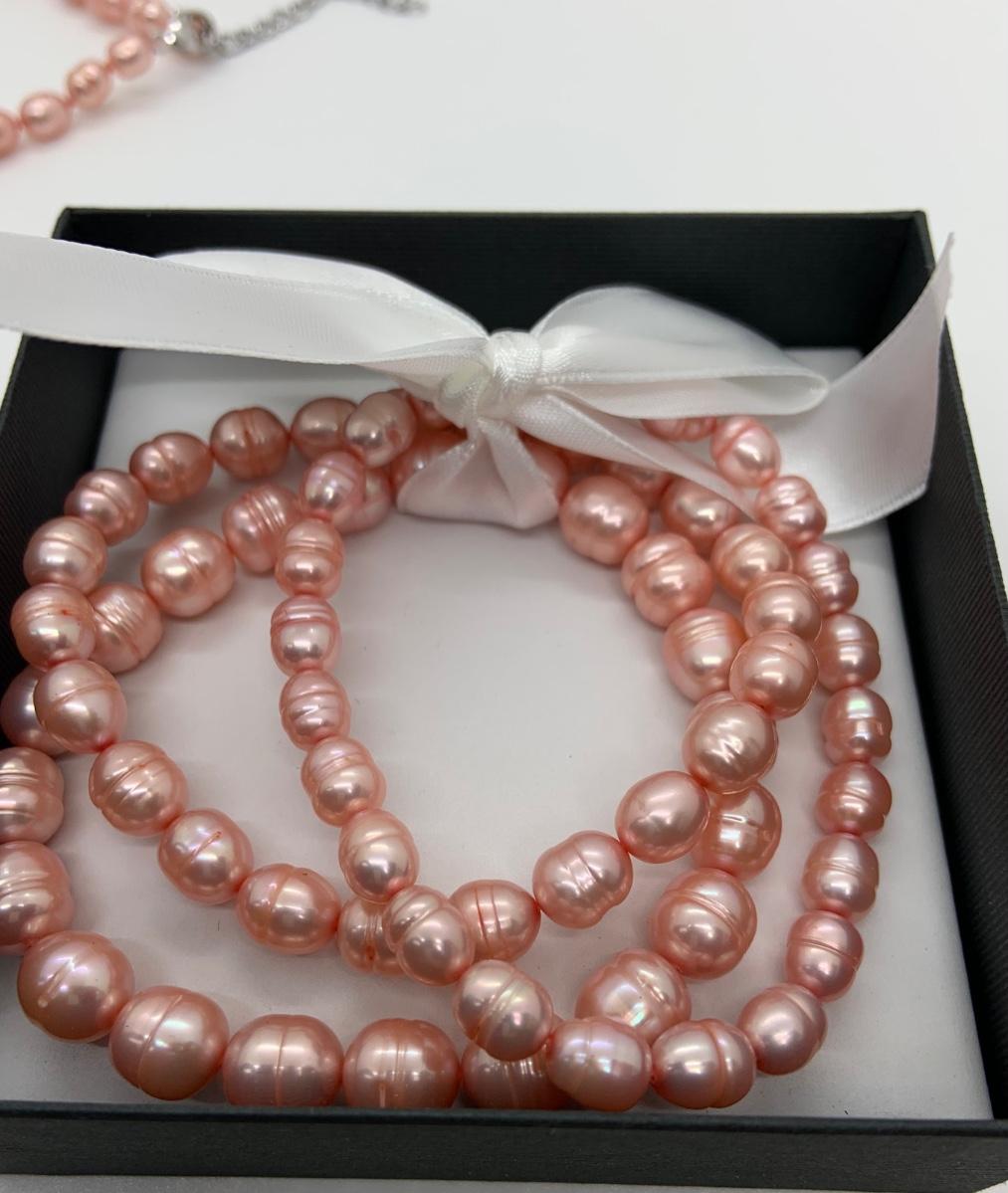 LOTJ1: New in Box Honora Large Pink Cultured Pearl 18” Necklace, pierced earrings and 3 stretch bracelets Set