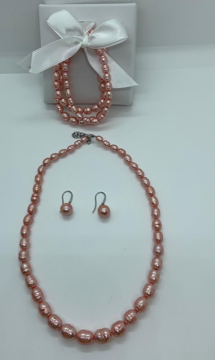 LOTJ1:  New in Box Honora Large Pink Cultured Pearl 18” Necklace,  pierced earrings and 3 stretch bracelets Set