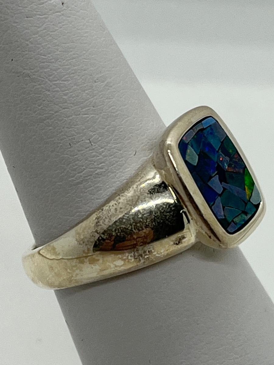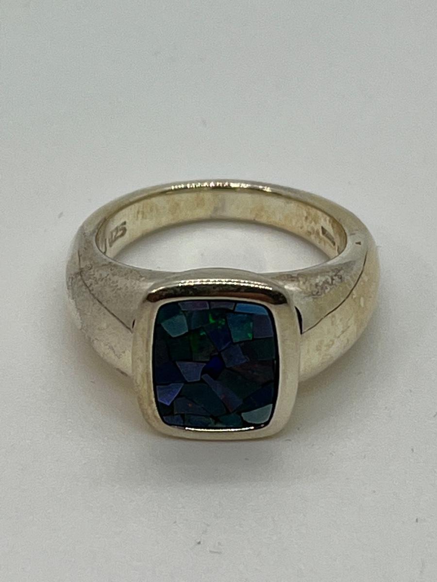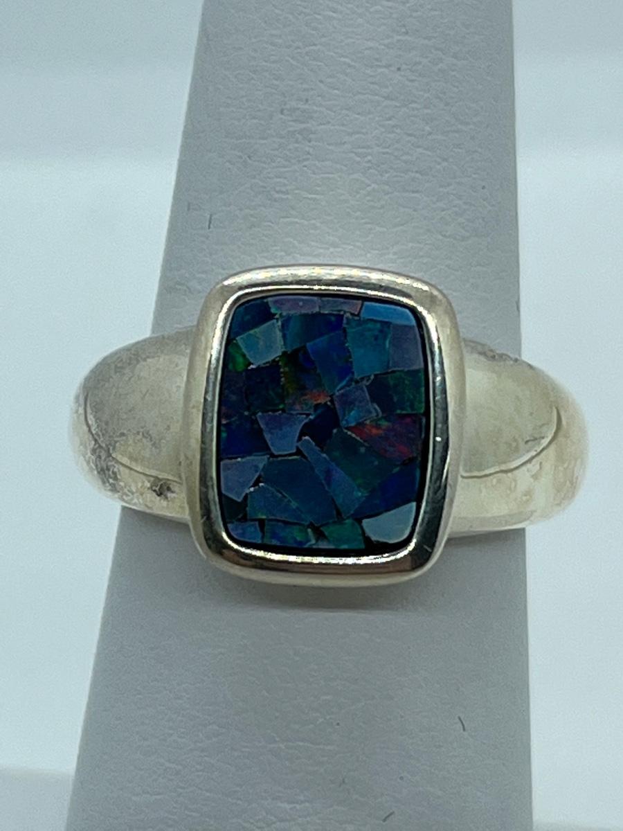 LOTJ115: Sterling Australian Opal Mosaic Doublet Cushion Ring sz. 6