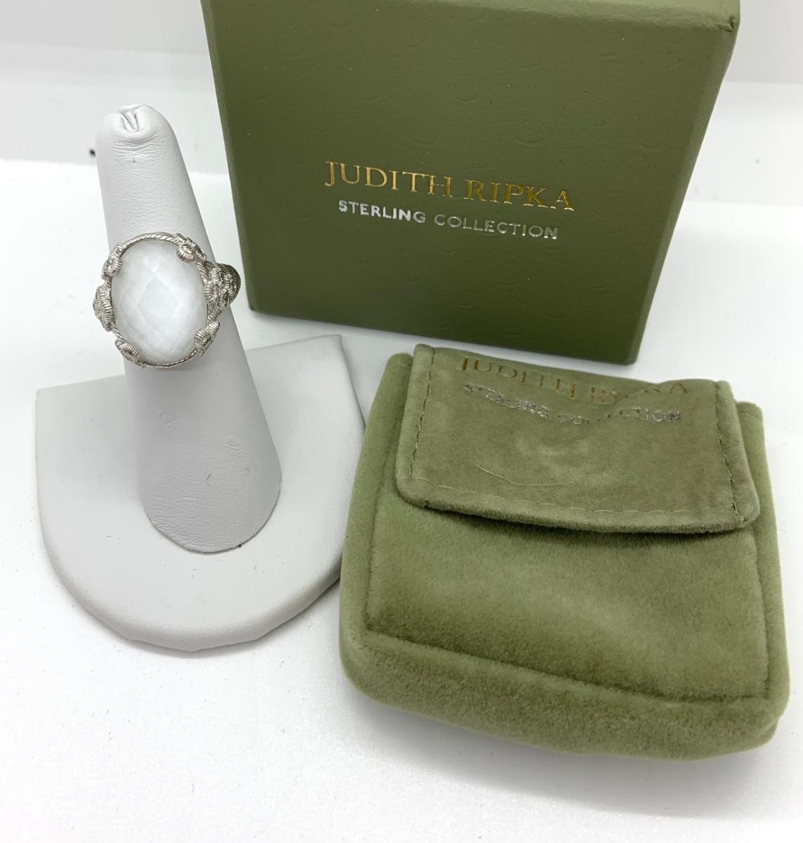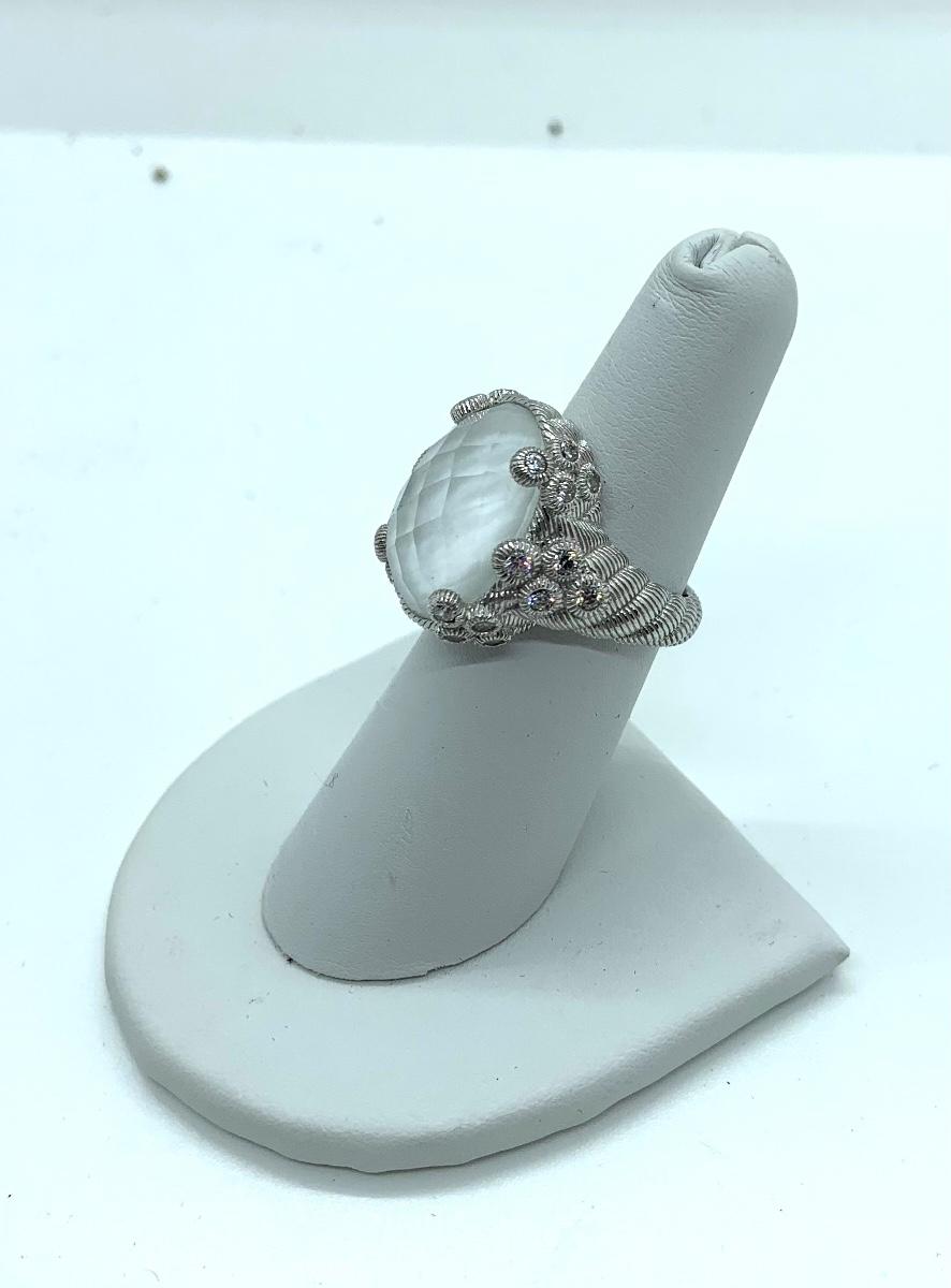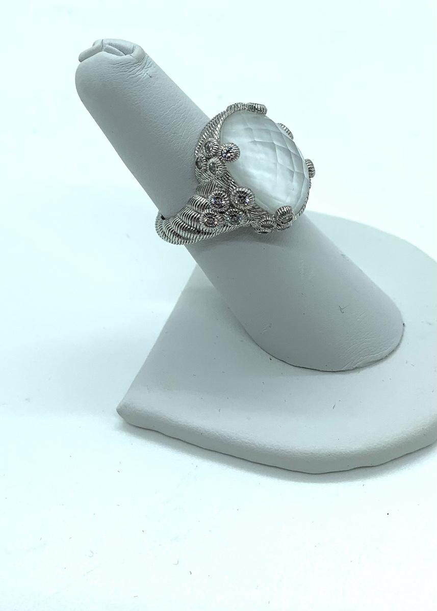 LOTJ138: New in box Judith Ripka Sterling Diamonique and White Agate Doublet Ring sz. 6