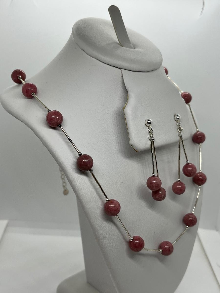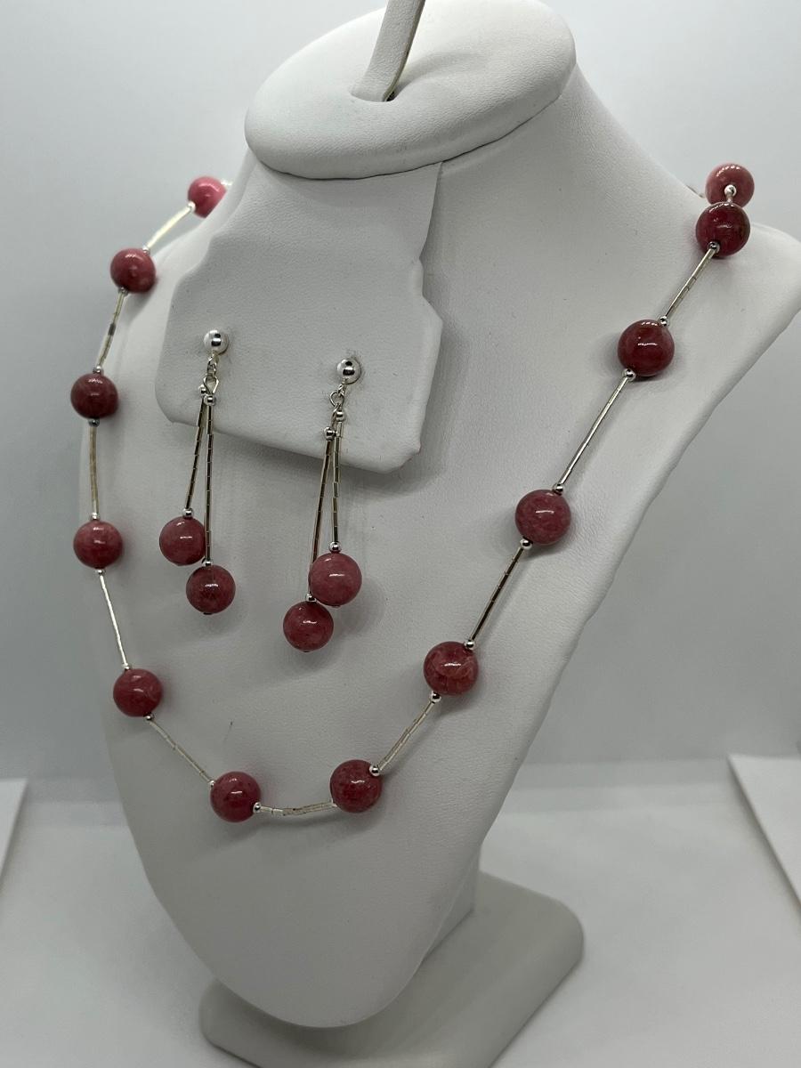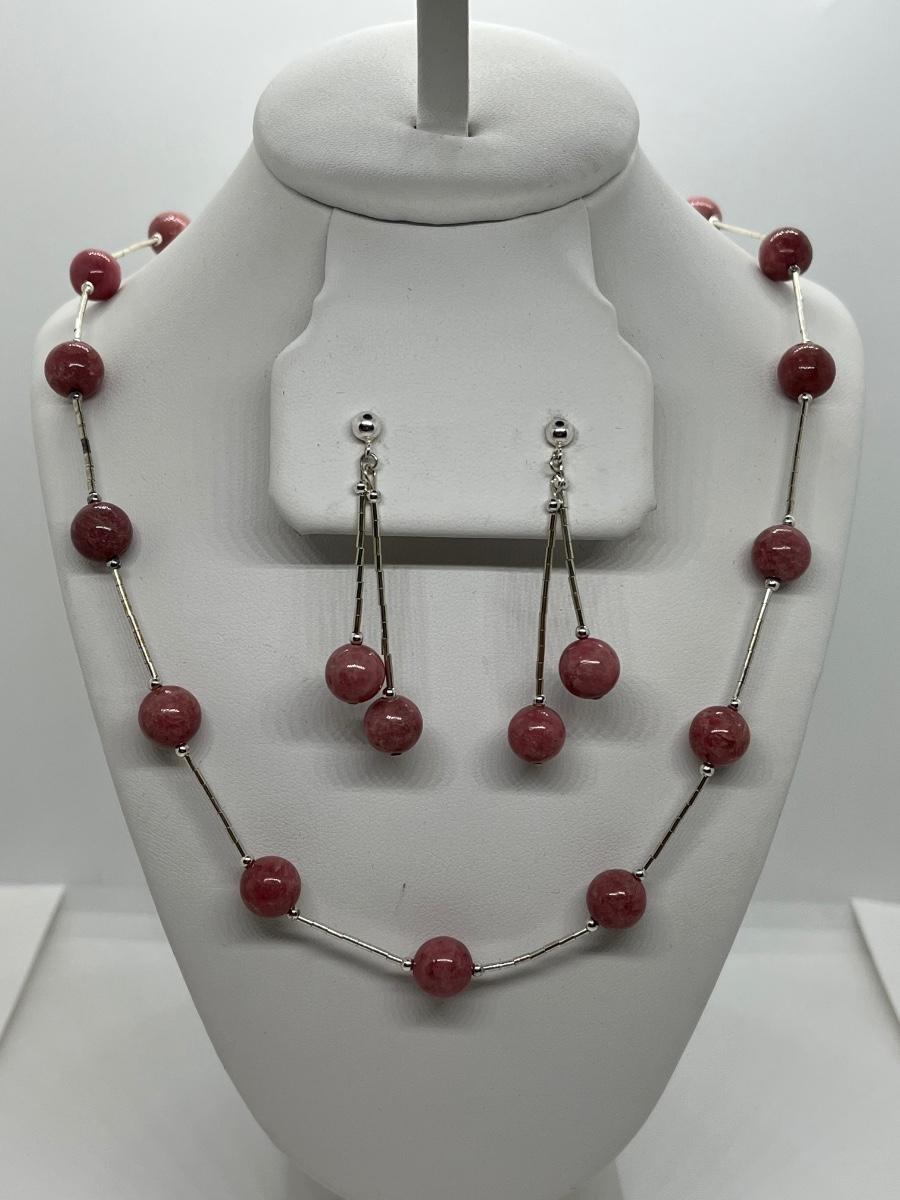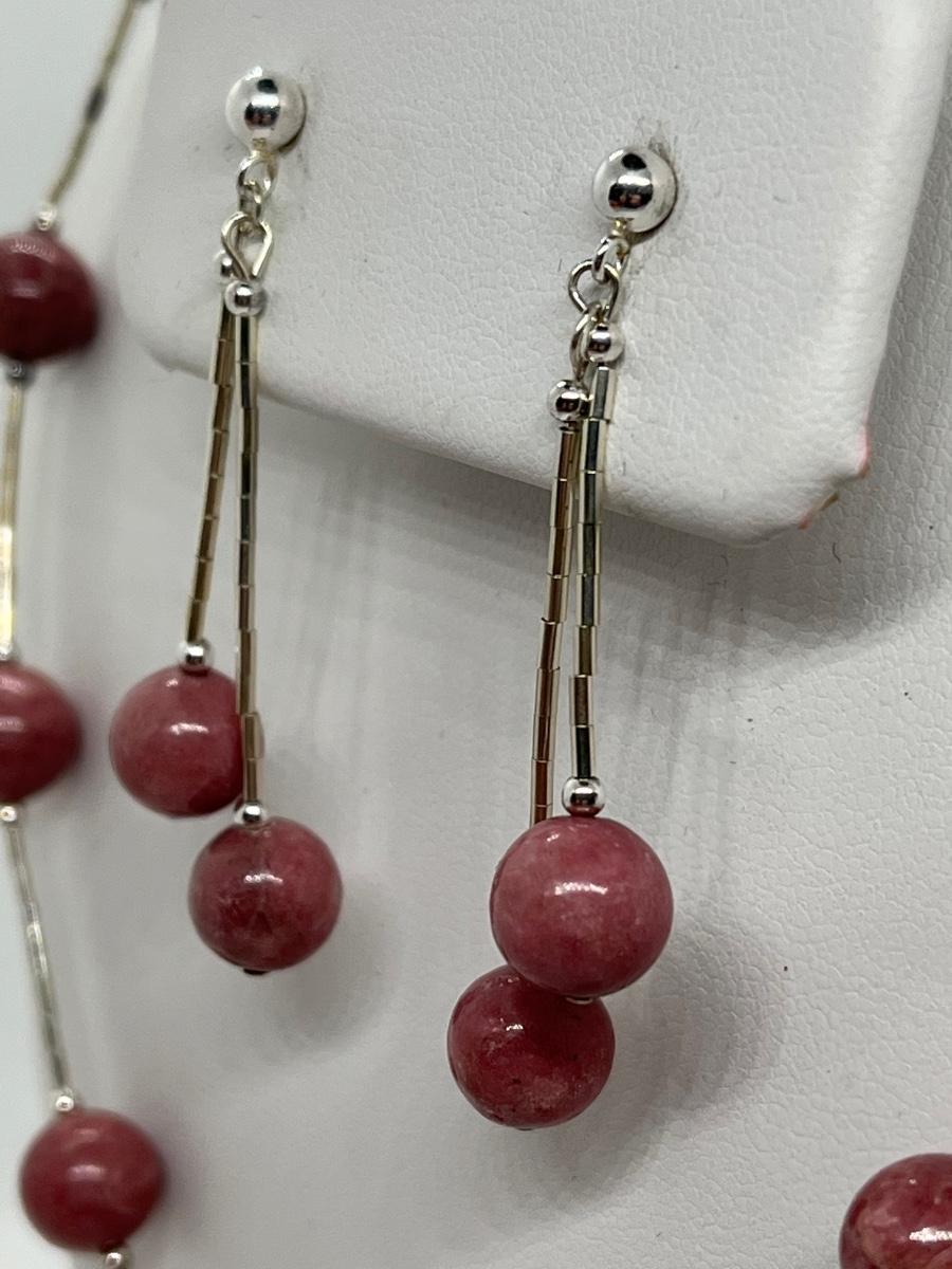 LOTJ143: New in box Southwestern Liquid silver and Rhodonite Gem Sterling Necklace(17"L w/3" extender) and Matching Pierced Earrings Set