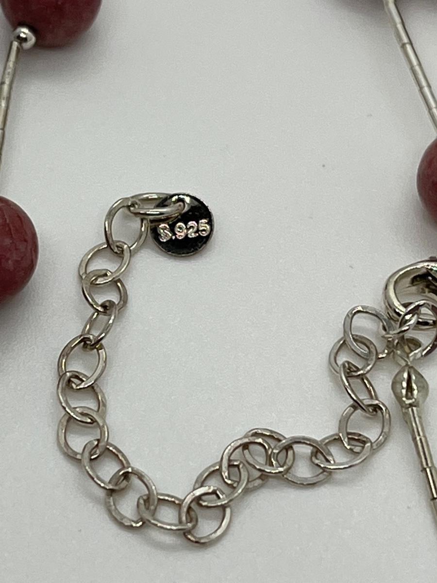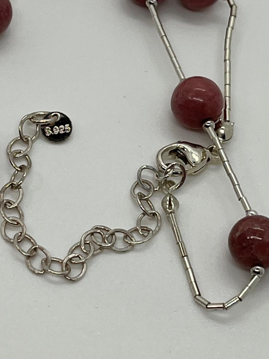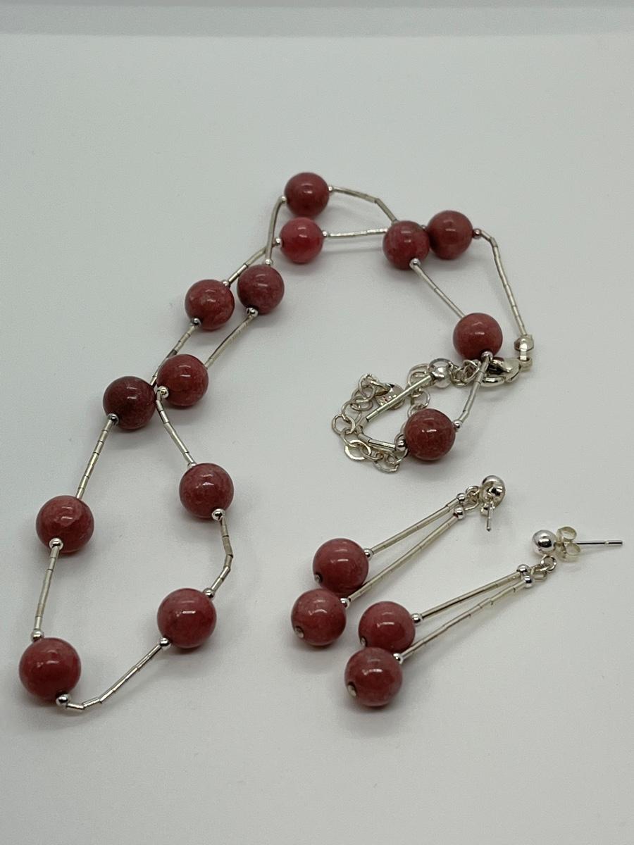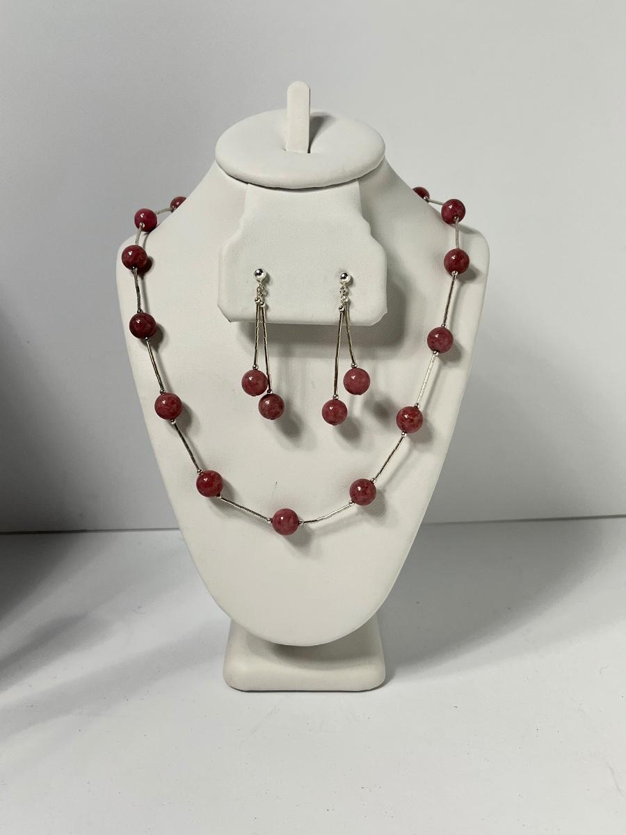 LOTJ143: New in box Southwestern Liquid silver and Rhodonite Gem Sterling Necklace(17"L w/3" extender) and Matching Pierced Earrings Set