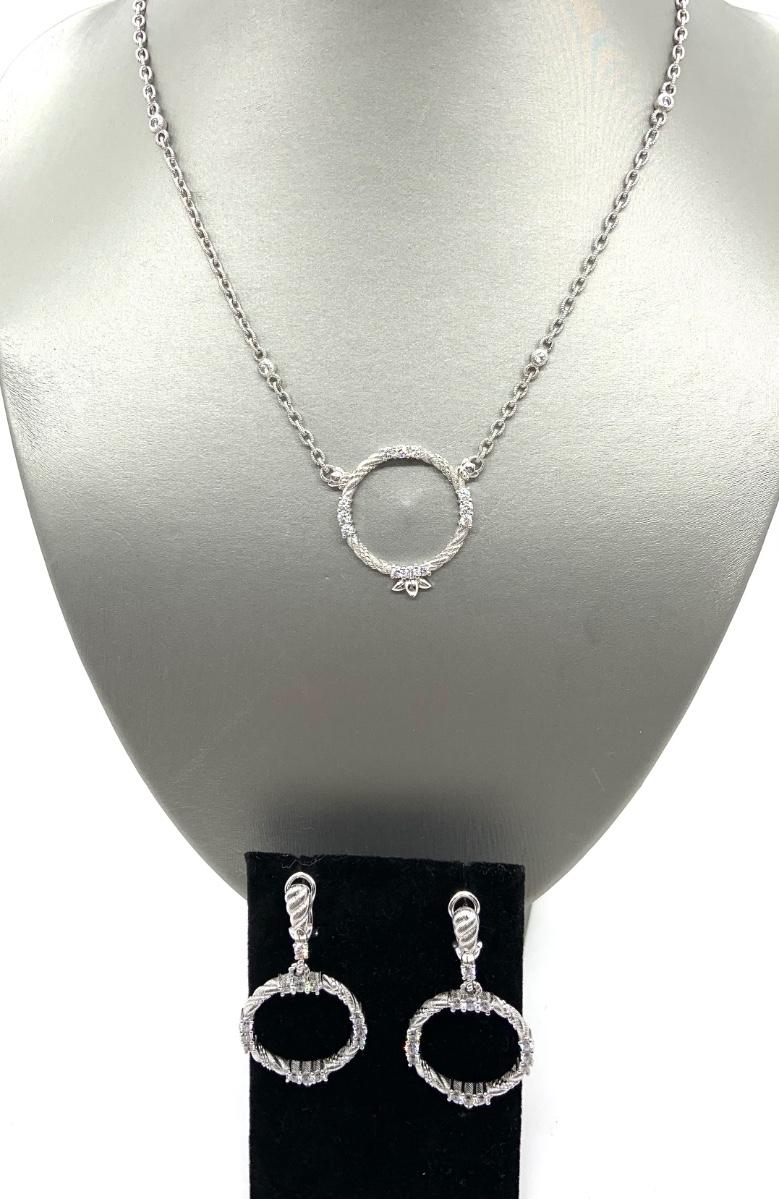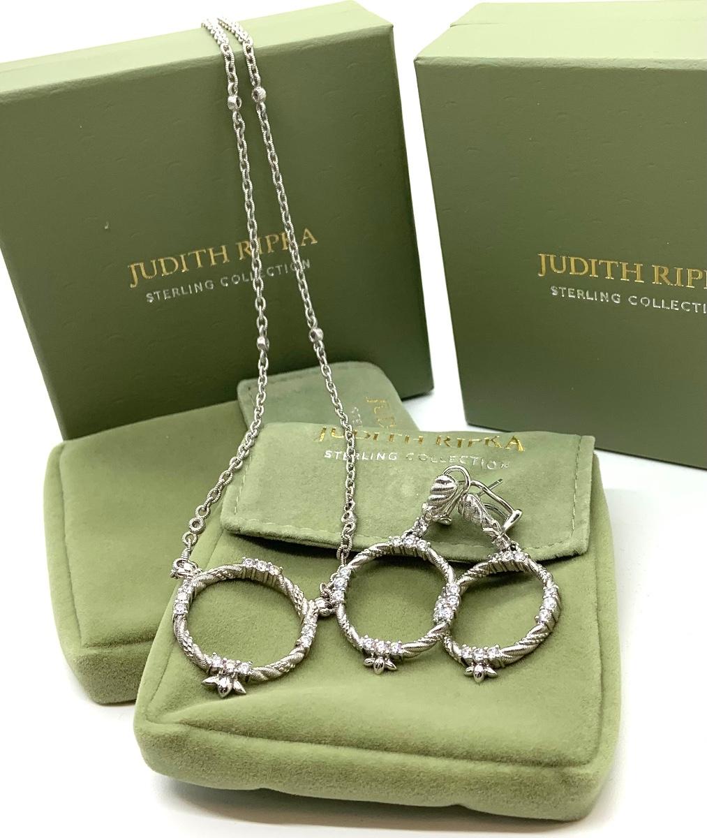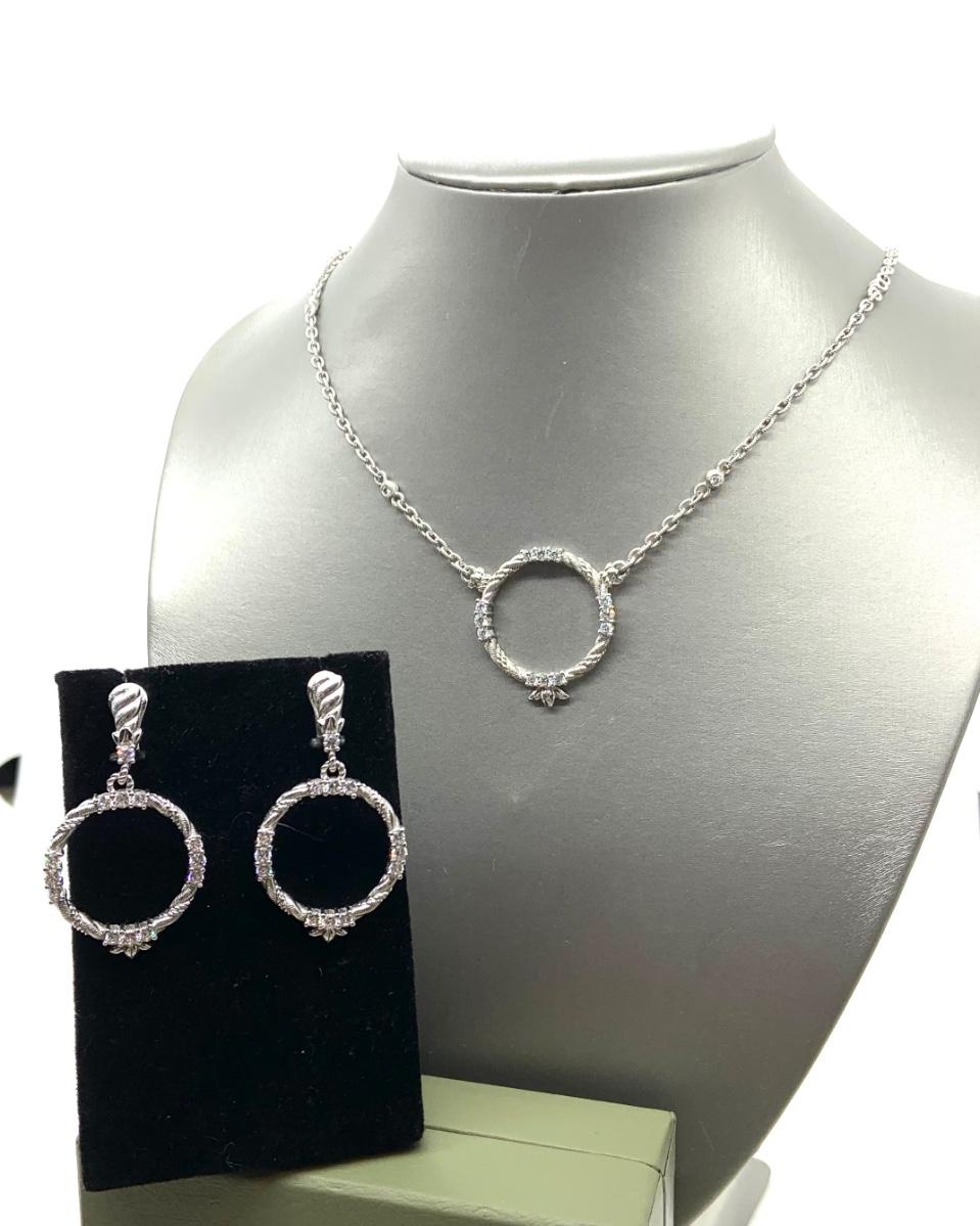LOTJ149: New in box Judith Ripka Diamonique Sterling Silver Circle Pendant Necklace 18"L and Matching Pierced Earrings