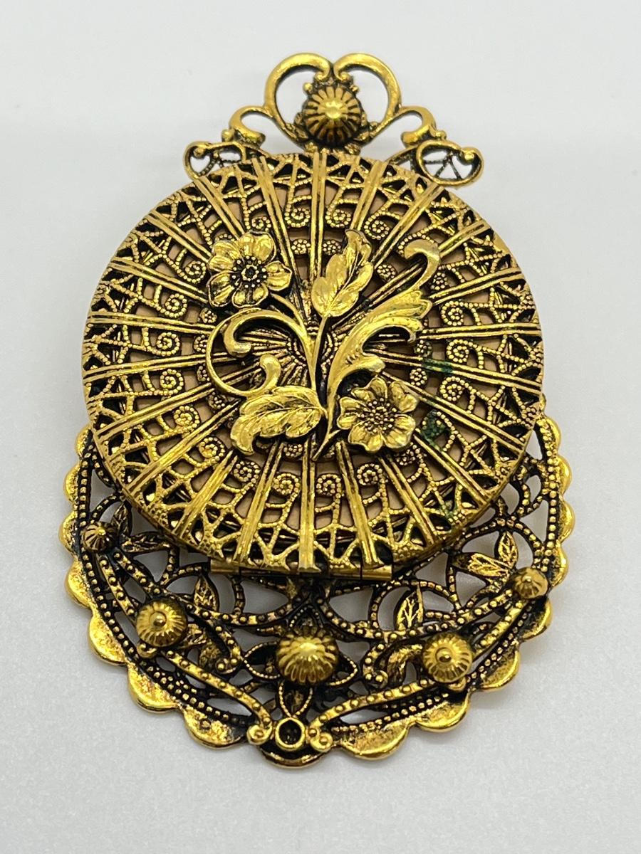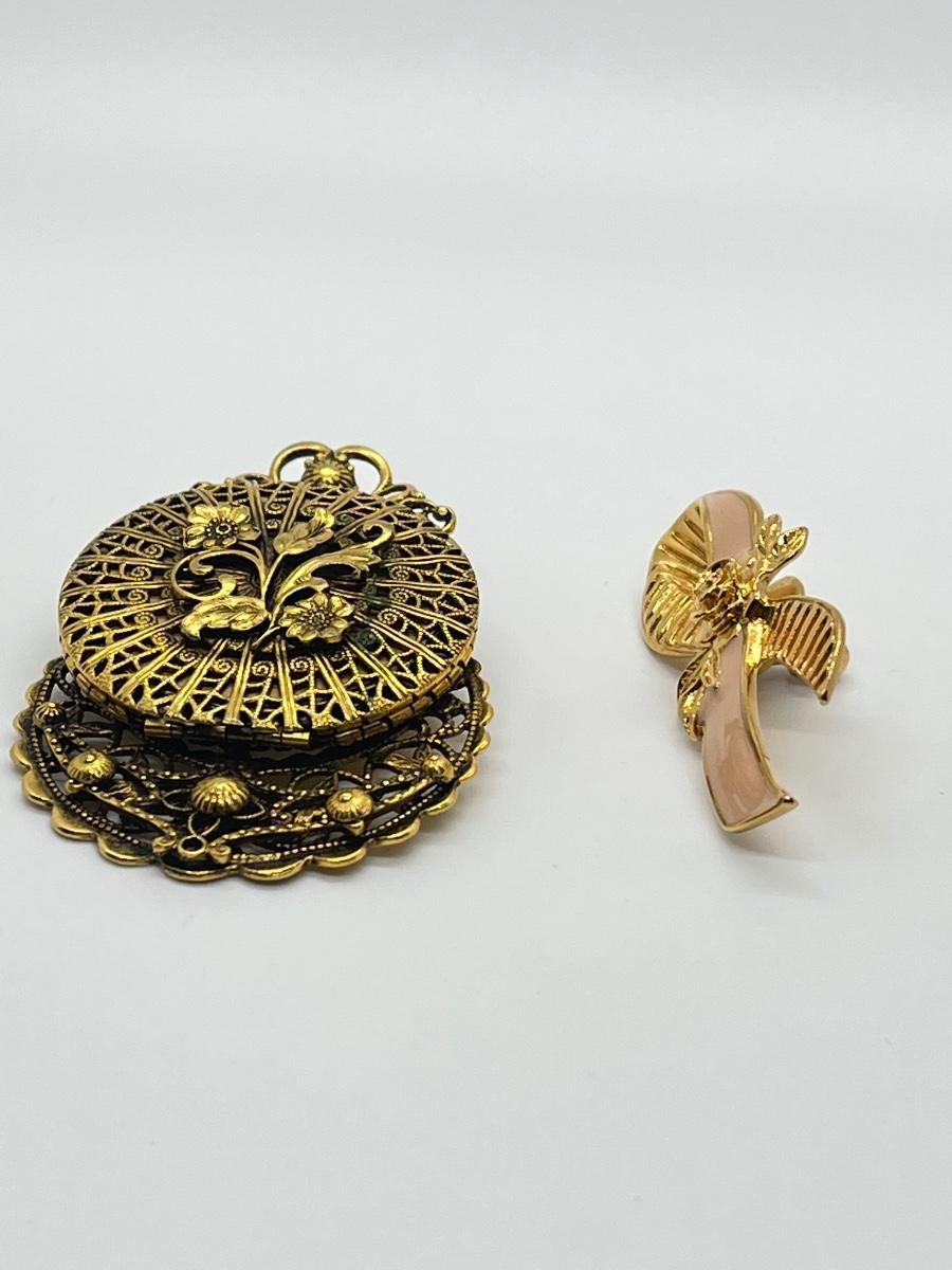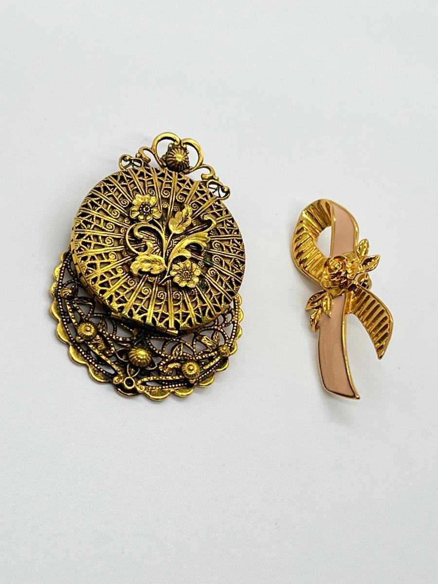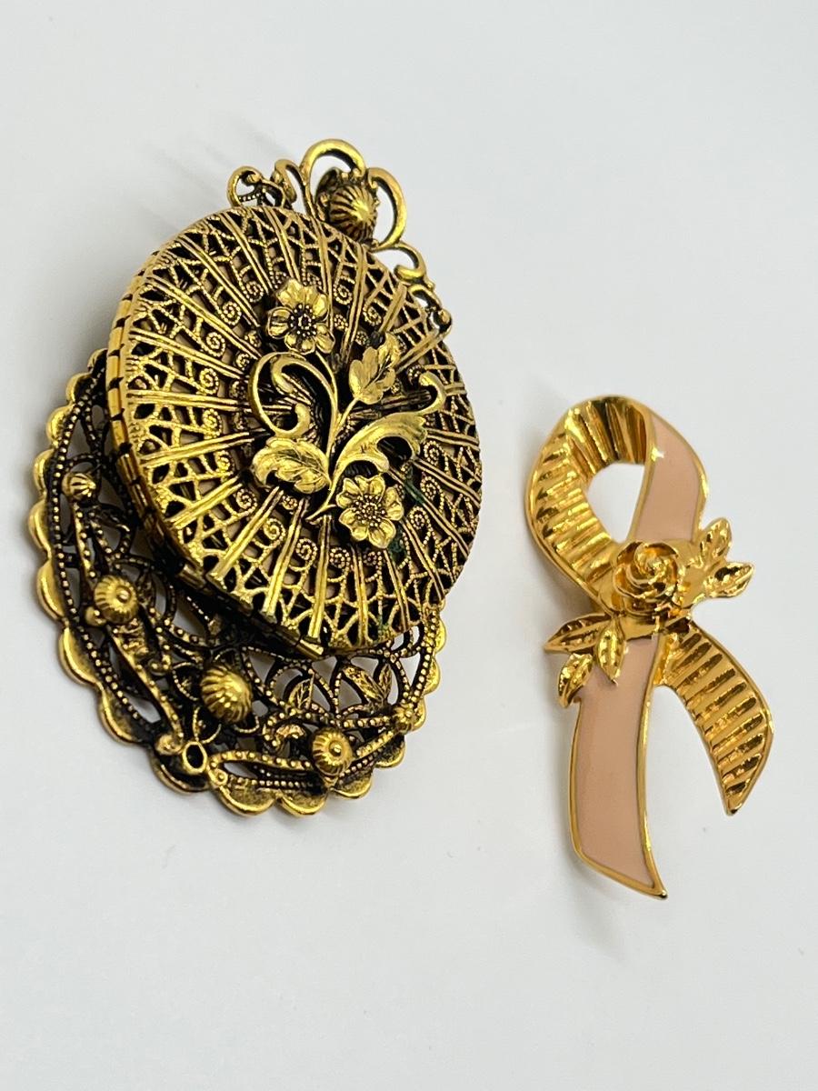LOT 90: Two Brooches -  Large Locket Pendant/Pin &Avon Pink Ribbon Breast Cancer