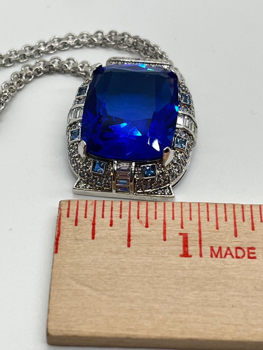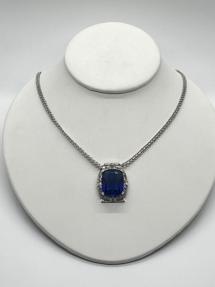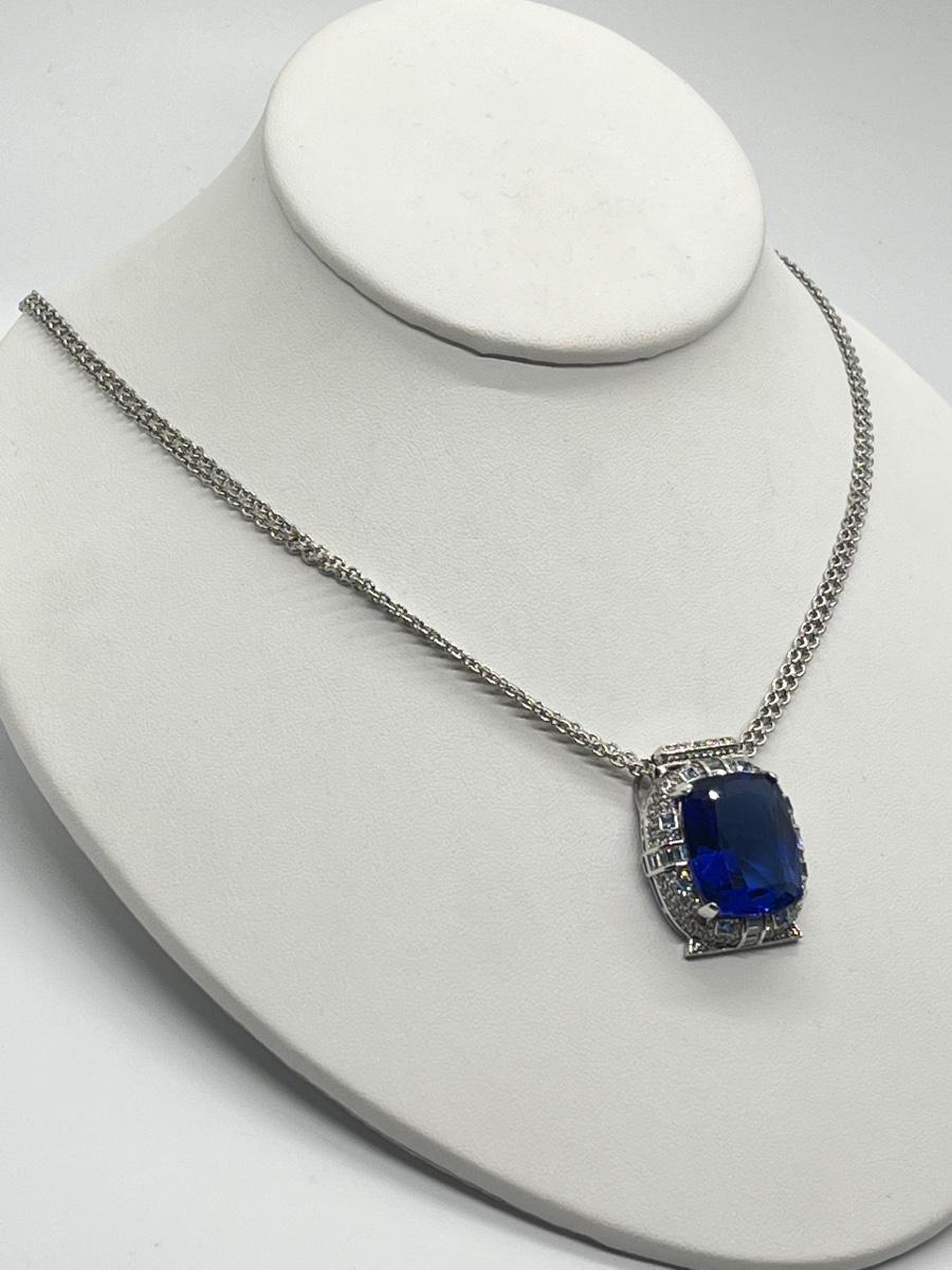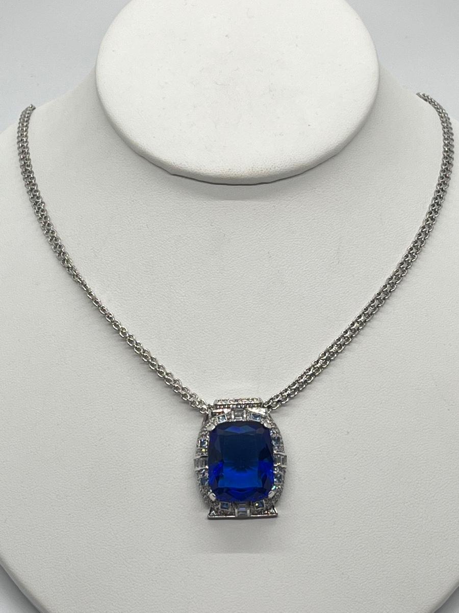 LOT 104: Art Deco Simulated Blue Sapphire & Crystal Rhinestone Silvertone Pendant on 18" Necklace