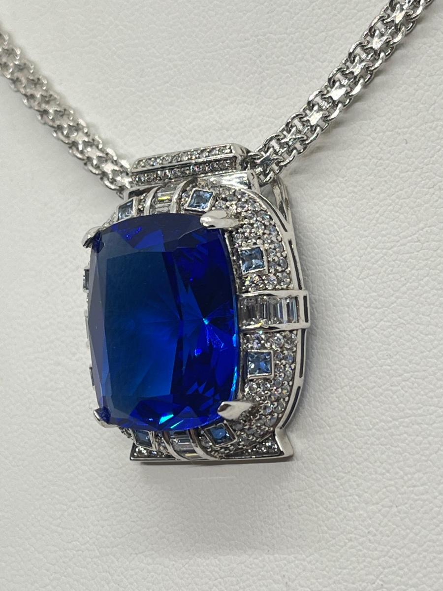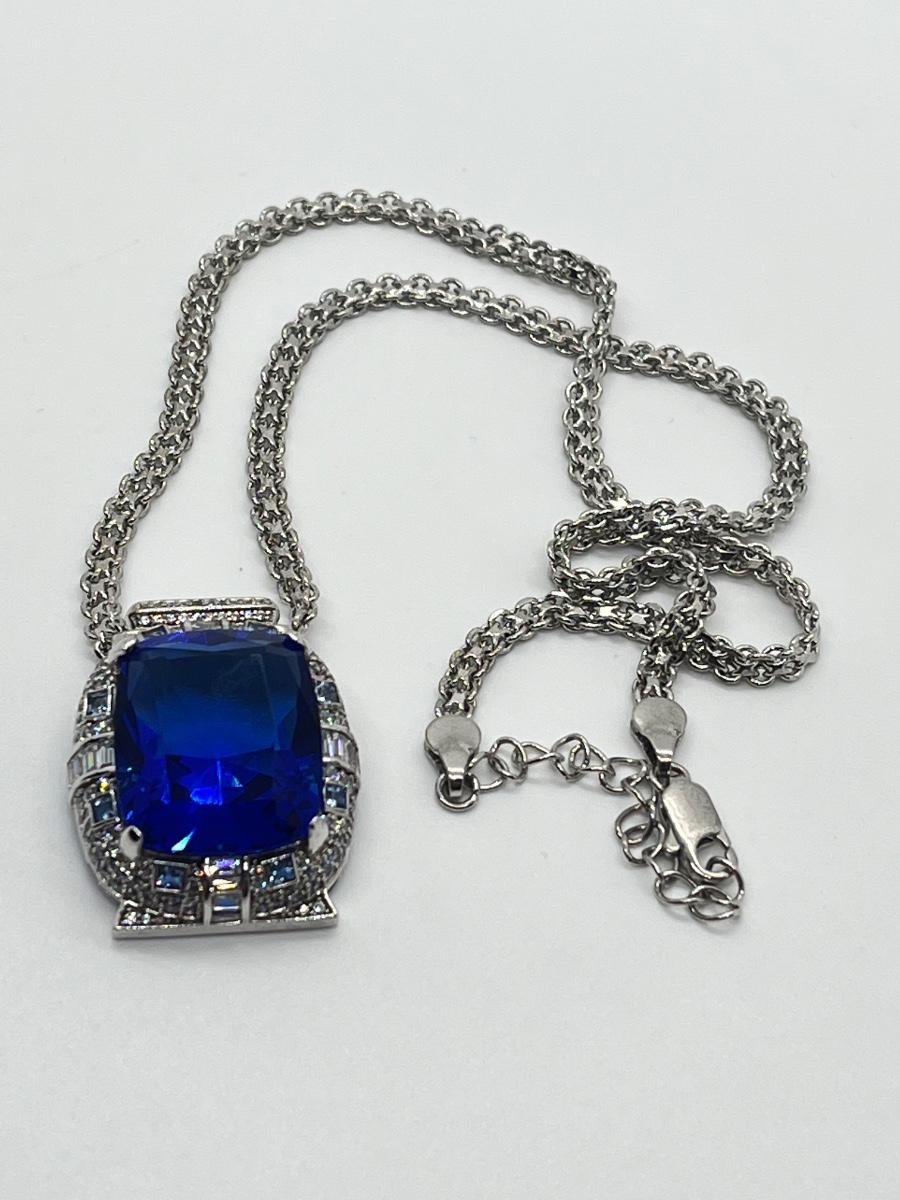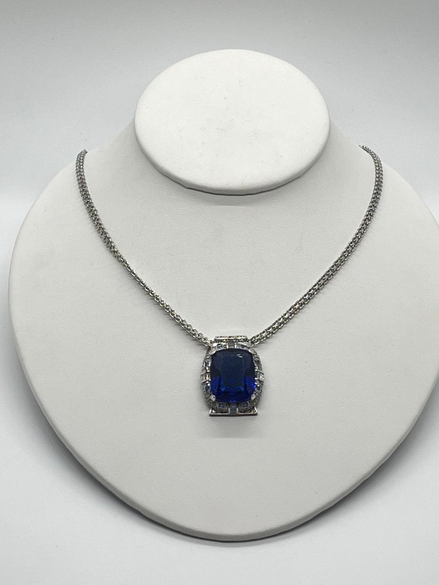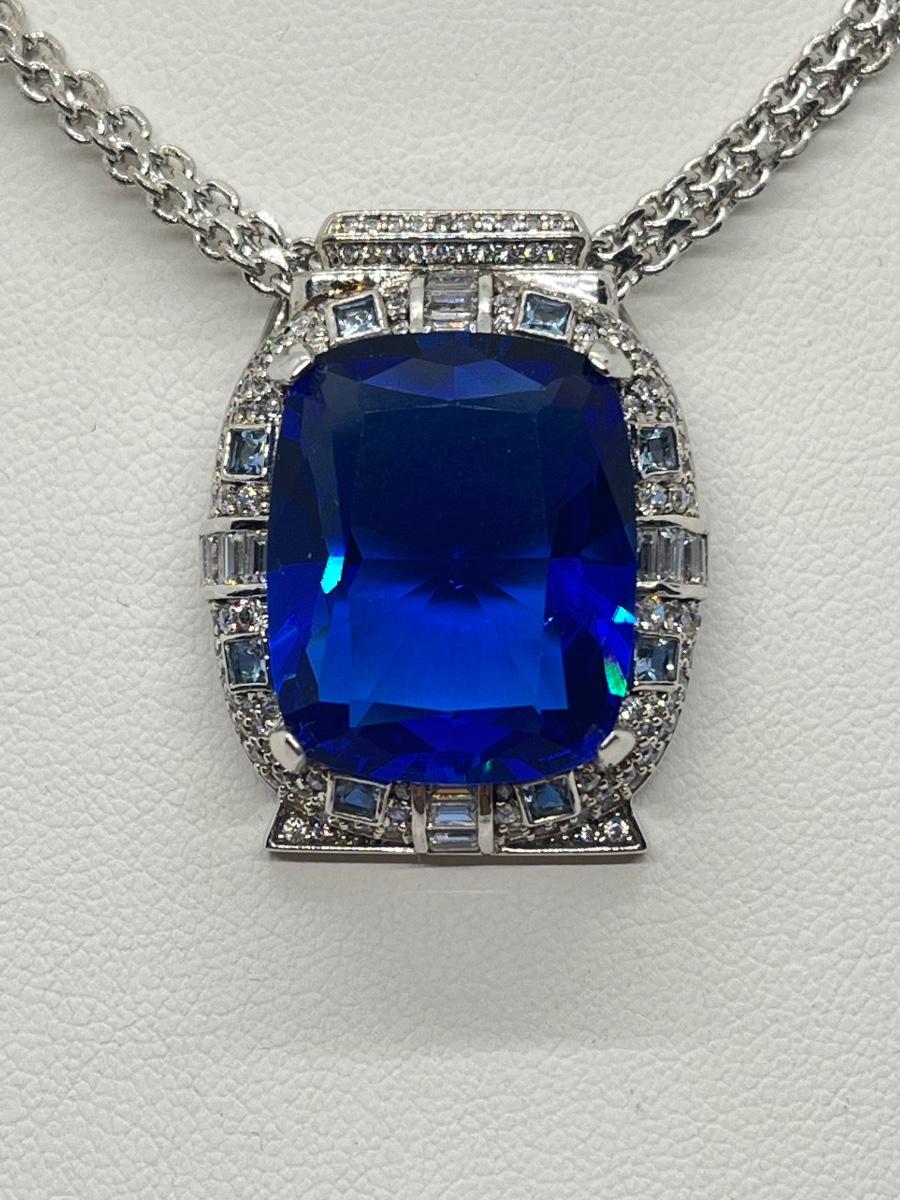 LOT 104: Art Deco Simulated Blue Sapphire & Crystal Rhinestone Silvertone Pendant on 18" Necklace