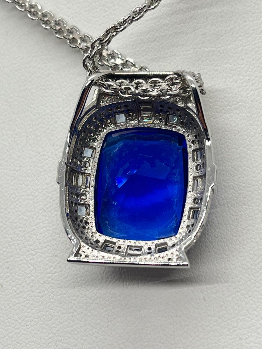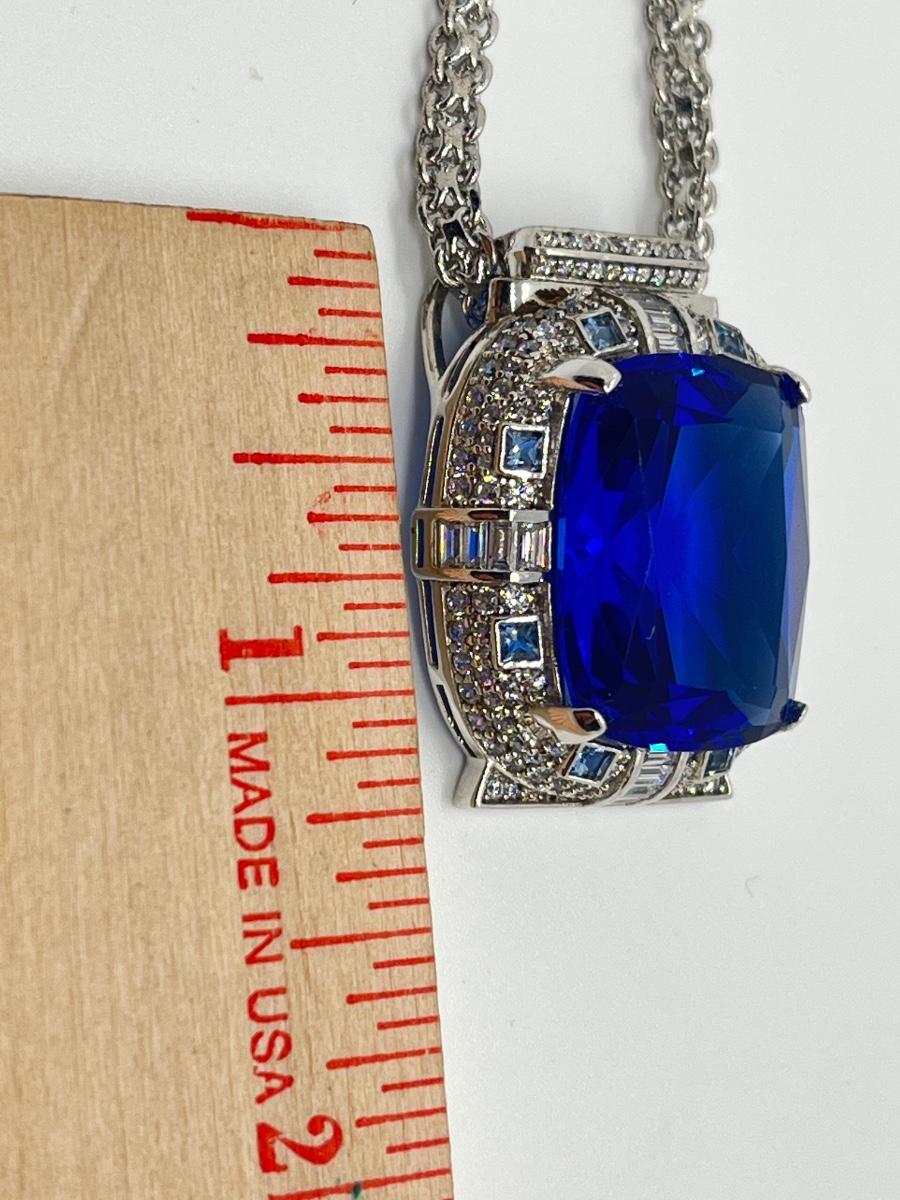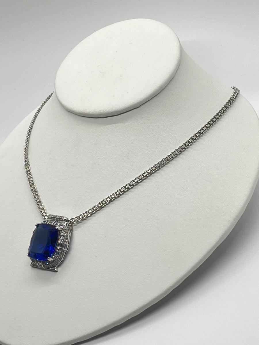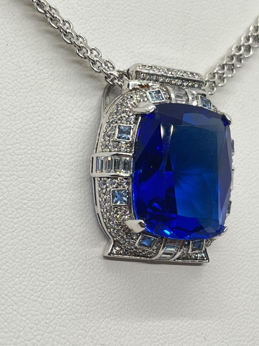 LOT 104: Art Deco Simulated Blue Sapphire & Crystal Rhinestone Silvertone Pendant on 18" Necklace