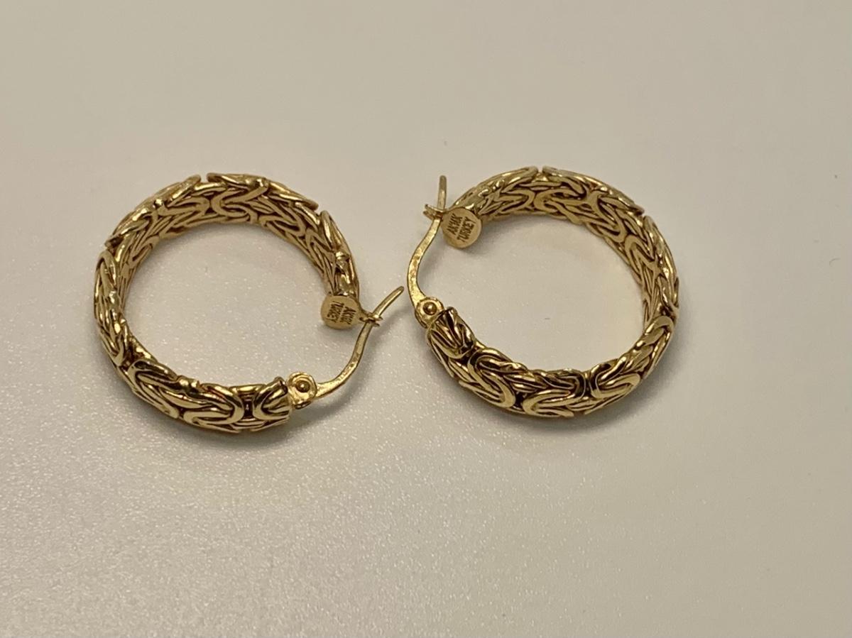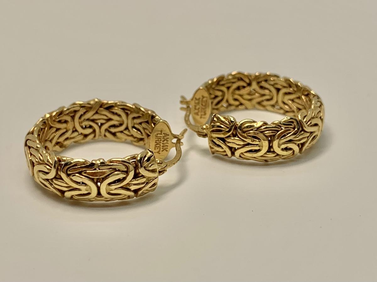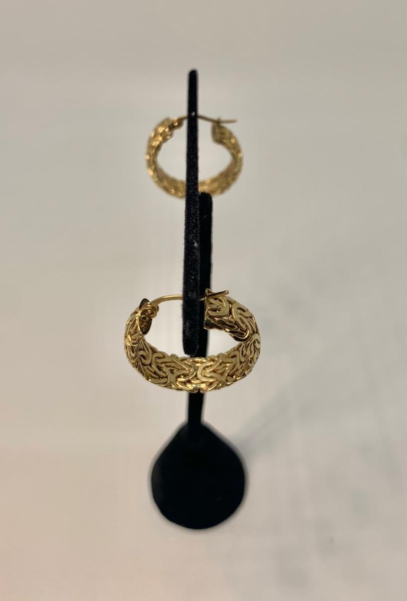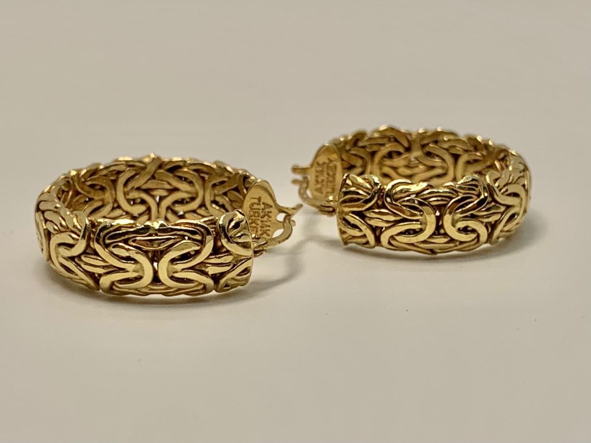 14k 5.14g Byzantine 1” wide pierced hoops The pictures show condition, measurements if taken, and what is included in the lot. All items unless noted, are pre-owned and may or may not have been worn. Unless noted in the pictures or description, there are no boxes for the jewelry. Shipping will be offered at the actual shipping cost to your zip-code plus $4.00 per lot for packing and handling. We can do combined shipping. Items over $50.00 will have an added insurance charge, and will be signature required for delivery at the buyers expense. For a shipping quote, please email with zip code and items (lot) numbers. Treasure Me Estate Sales offers shipping as a courtesy and in doing so, reserves the right to choose the shipping supplies including whether not to send in an envelope or box to protect the integrity of the item. When the auction closes, and all items have sold, you will receive an invoice with all of your winning items. If you need shipping, and there is not a shipping charge on the invoice, please email for a quote and new invoice will be sent with shipping charges and pay at that time. Paying through PayPal helps so we can generate a label with tracking, but is not required. Thank you and please email with any questions.