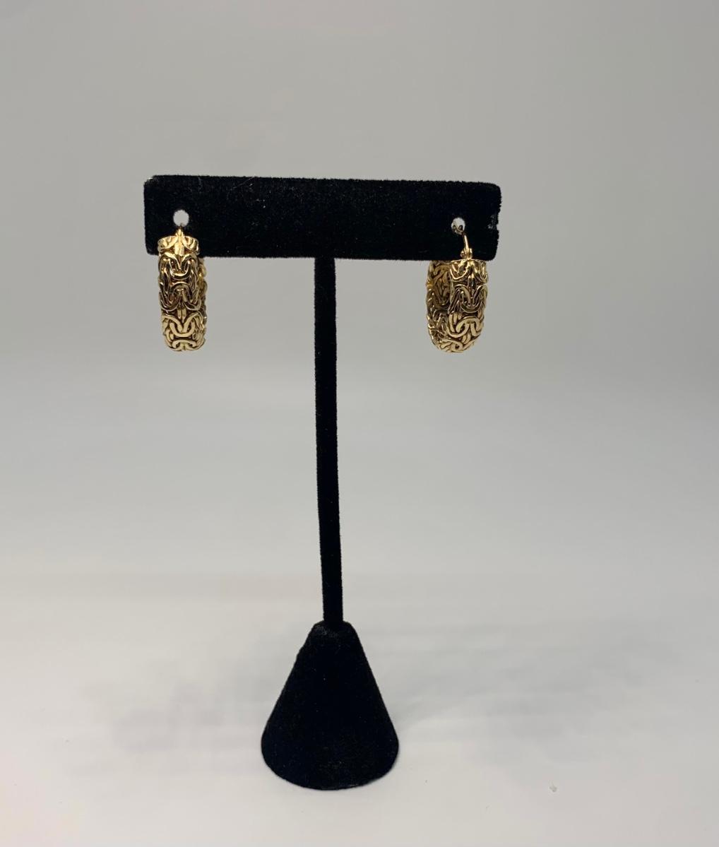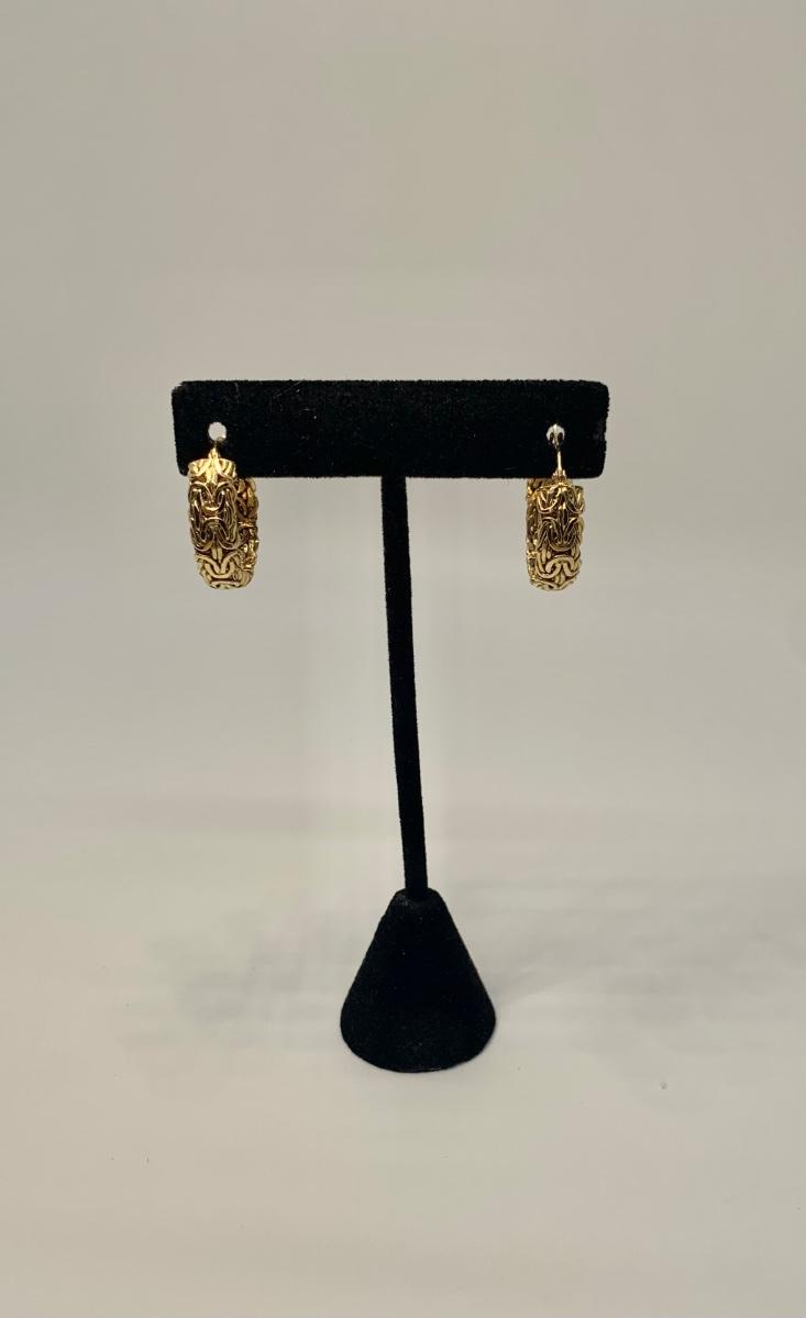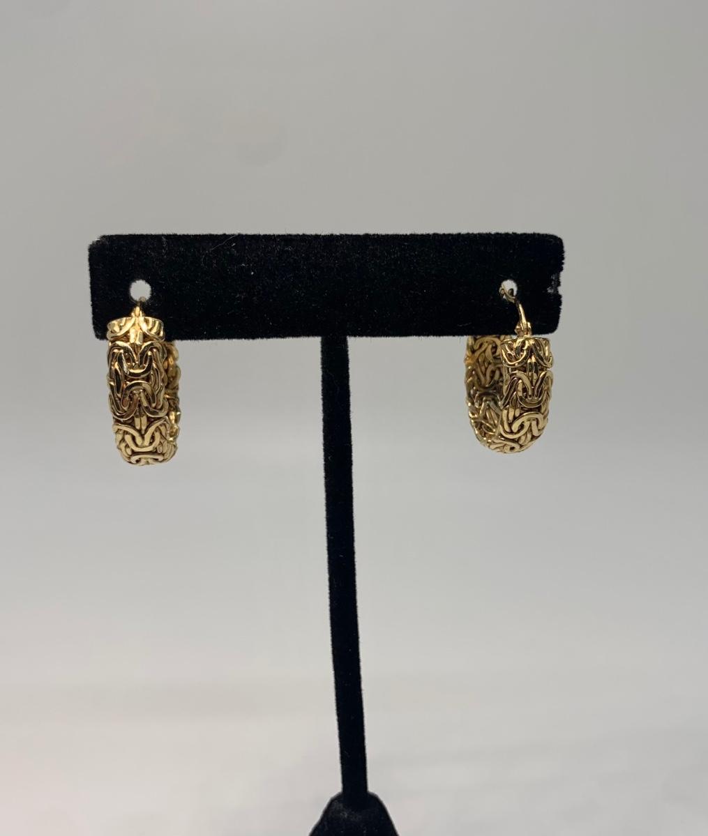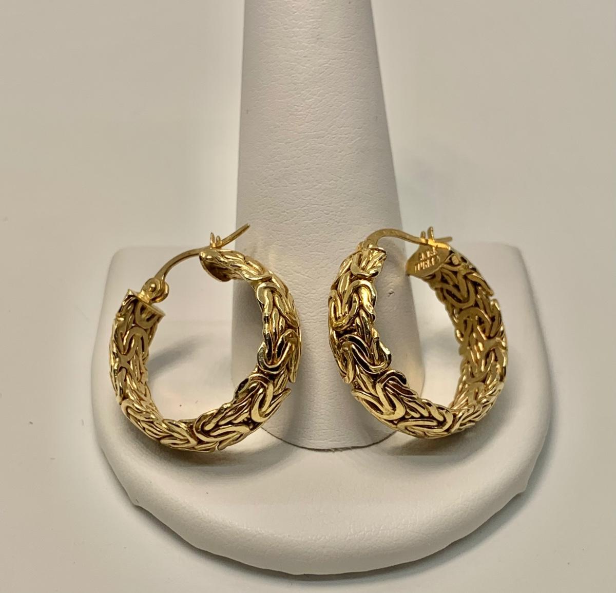 14k 5.14g Byzantine 1” wide pierced hoops The pictures show condition, measurements if taken, and what is included in the lot. All items unless noted, are pre-owned and may or may not have been worn. Unless noted in the pictures or description, there are no boxes for the jewelry. Shipping will be offered at the actual shipping cost to your zip-code plus $4.00 per lot for packing and handling. We can do combined shipping. Items over $50.00 will have an added insurance charge, and will be signature required for delivery at the buyers expense. For a shipping quote, please email with zip code and items (lot) numbers. Treasure Me Estate Sales offers shipping as a courtesy and in doing so, reserves the right to choose the shipping supplies including whether not to send in an envelope or box to protect the integrity of the item. When the auction closes, and all items have sold, you will receive an invoice with all of your winning items. If you need shipping, and there is not a shipping charge on the invoice, please email for a quote and new invoice will be sent with shipping charges and pay at that time. Paying through PayPal helps so we can generate a label with tracking, but is not required. Thank you and please email with any questions.