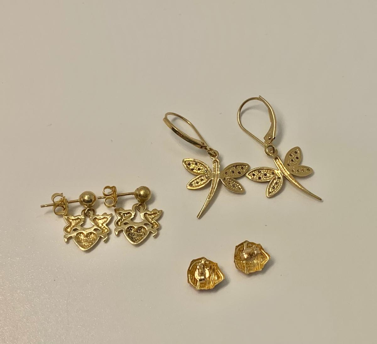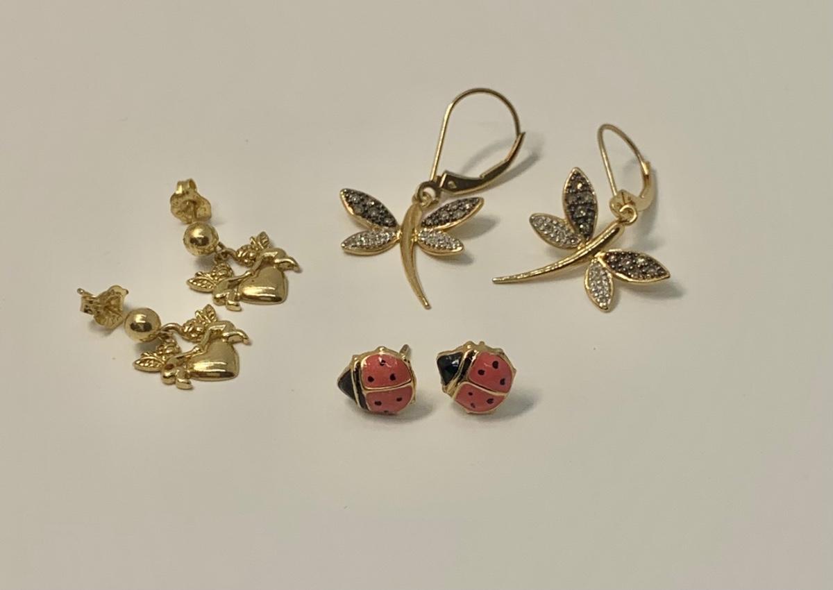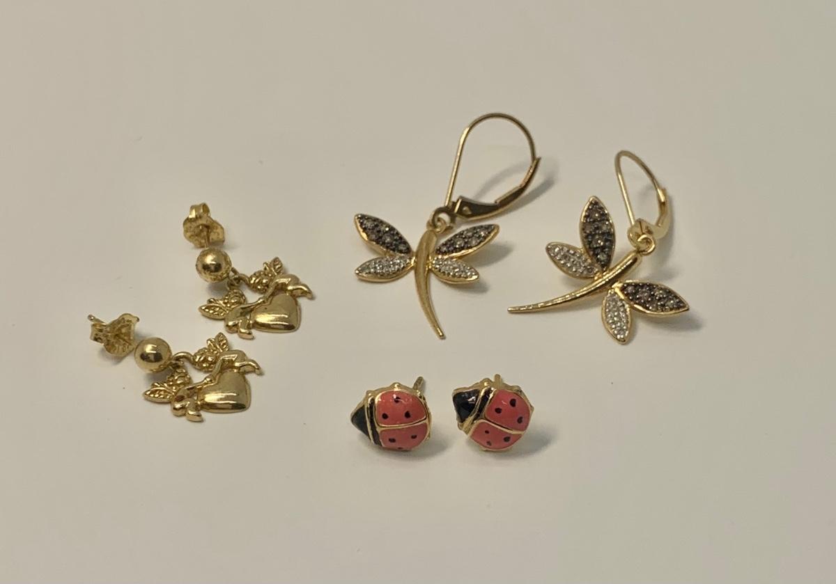 LOT 26: 4g tw 3 Pair Pierced Earrings - Dragonfly w/Diamond Chips, Ladybug & Cherub