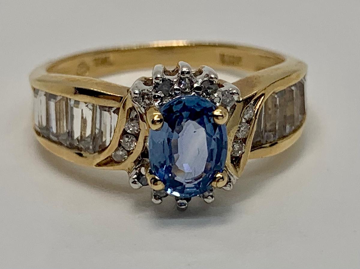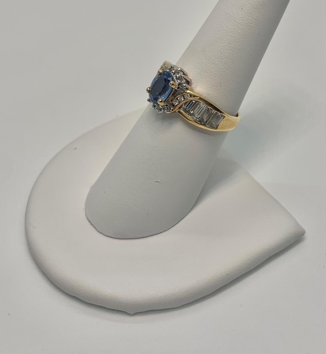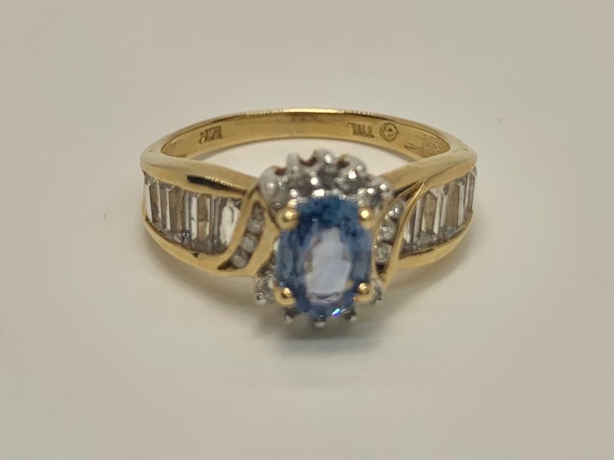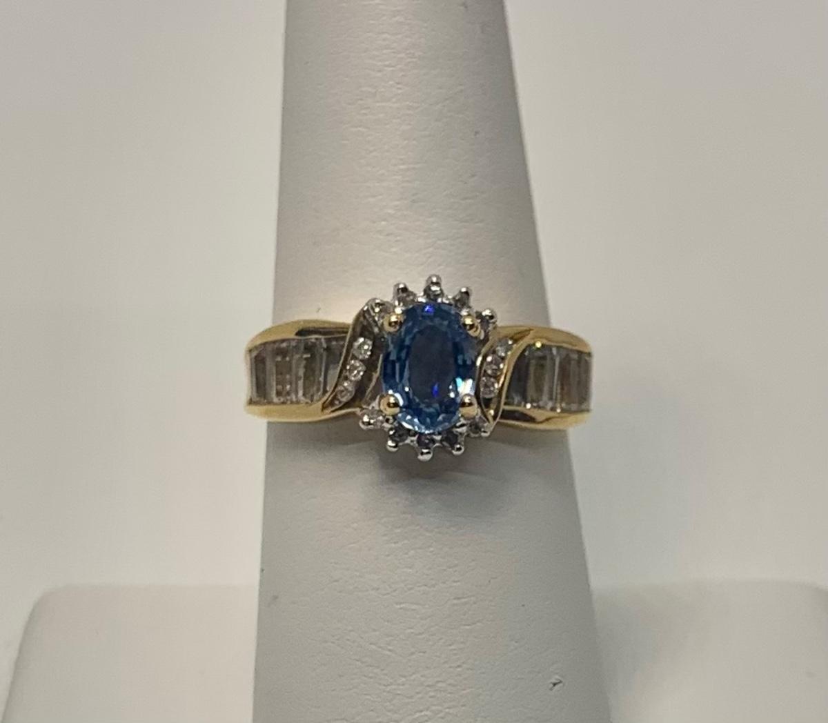 LOT 40: 14k 3.65g Sapphire Diamond Halo & Baguette's - Size 7.5