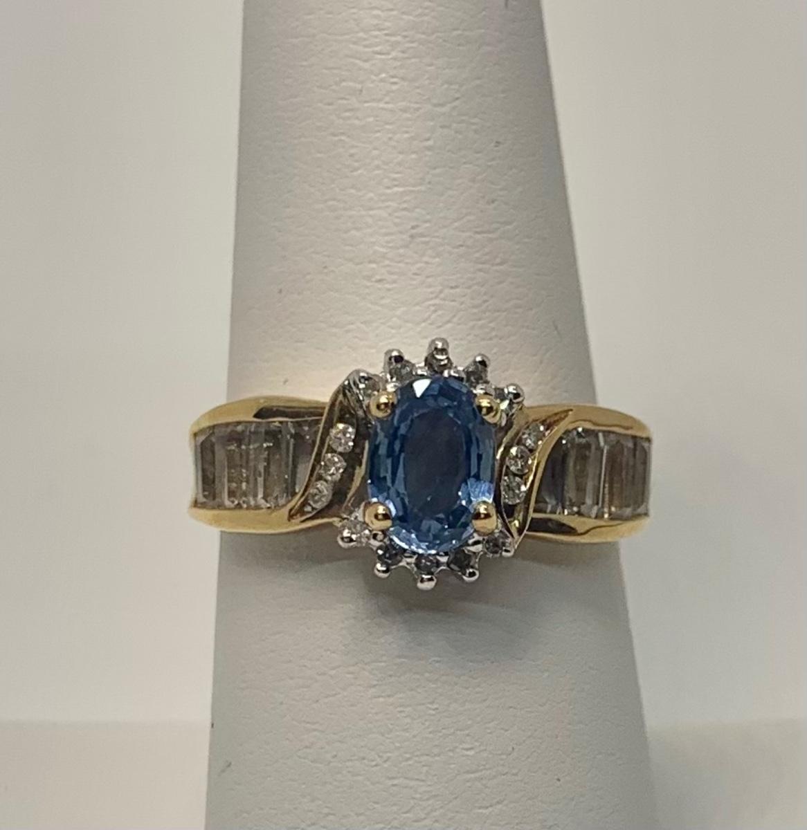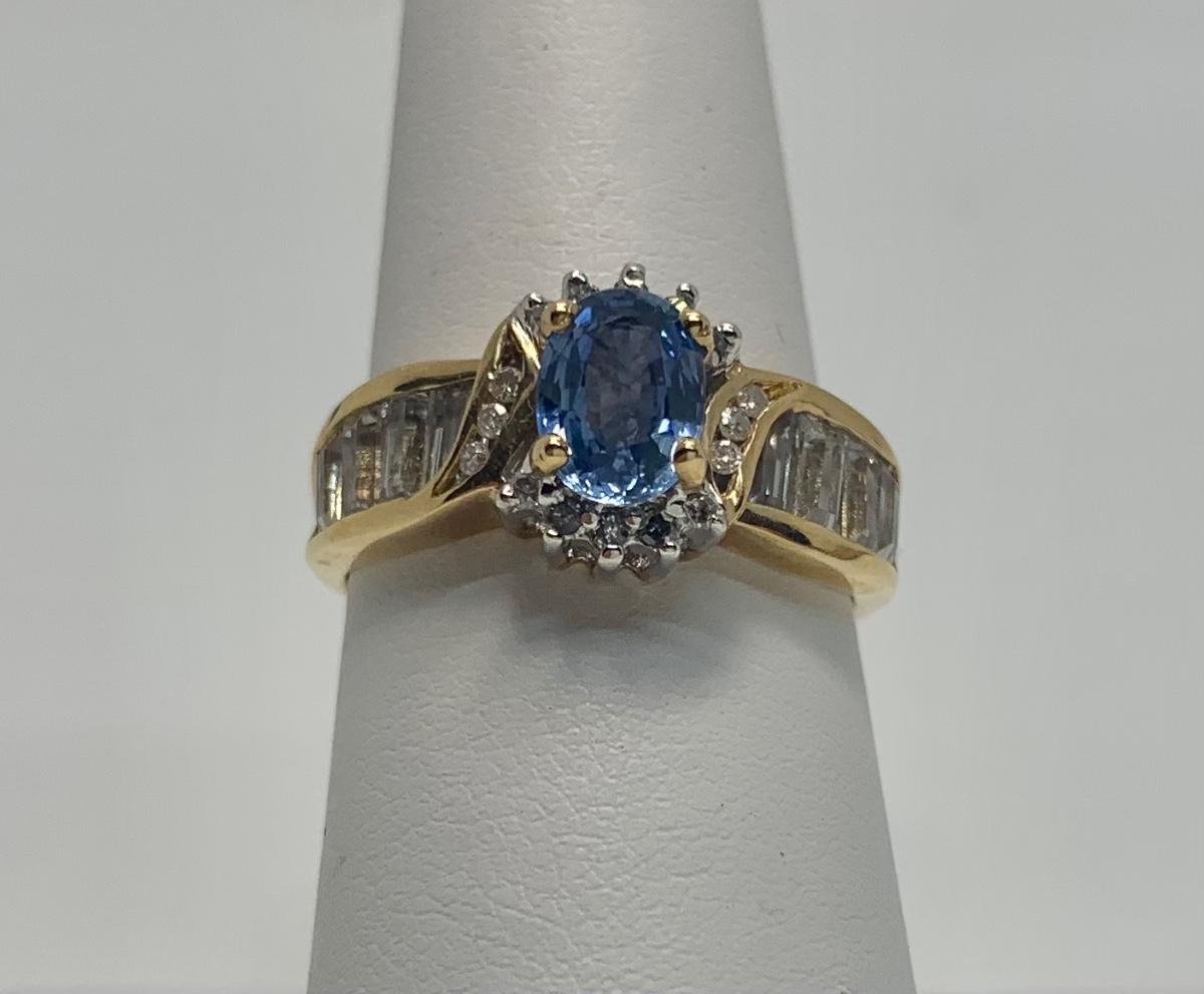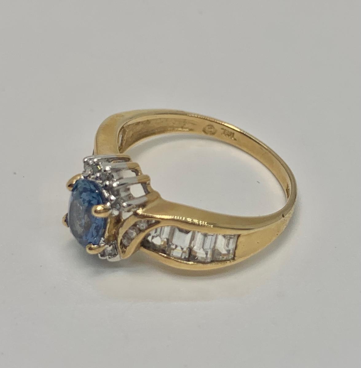 LOT 40: 14k 3.65g Sapphire Diamond Halo & Baguette's - Size 7.5