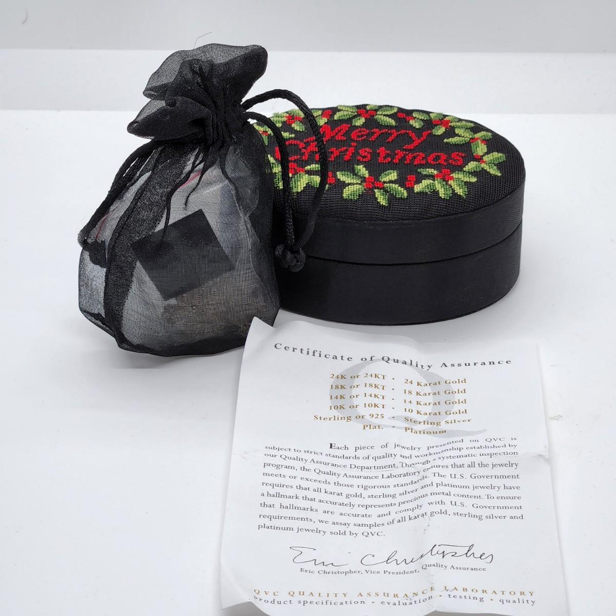 Originally purchased from QVC. Earrings come with this adorable petitepoint "Merry Christmas" gift box and are in great condition. If you love these, check out the matching necklace in lot #13! The pictures show condition, measurements if taken, and what is included in the lot. All items unless noted, are pre-owned and may or may not have been worn. Unless noted in the pictures or description, there are no boxes for the jewelry. Shipping will be offered at the actual shipping cost to your zip-code plus $4.00 per lot for packing and handling. We can do combined shipping. Items over $50.00 will have an added insurance charge, and will be signature required for delivery at the buyers expense. For a shipping quote, please email with zip code and items (lot) numbers. Treasure Me Estate Sales offers shipping as a courtesy and in doing so, reserves the right to choose the shipping supplies including whether not to send in an envelope or box to protect the integrity of the item. When the auction closes, and all items have sold, you will receive an invoice with all of your winning items. If you need shipping, and there is not a shipping charge on the invoice, please email for a quote and new invoice will be sent with shipping charges and pay at that time. Paying through PayPal helps so we can generate a label with tracking, but is not required. Thank you and please email with any questions.