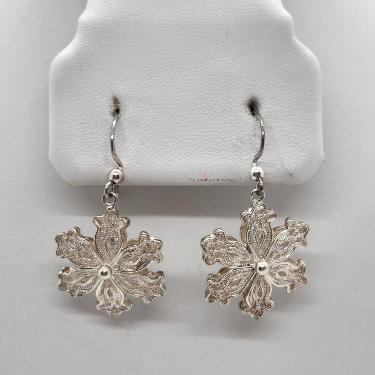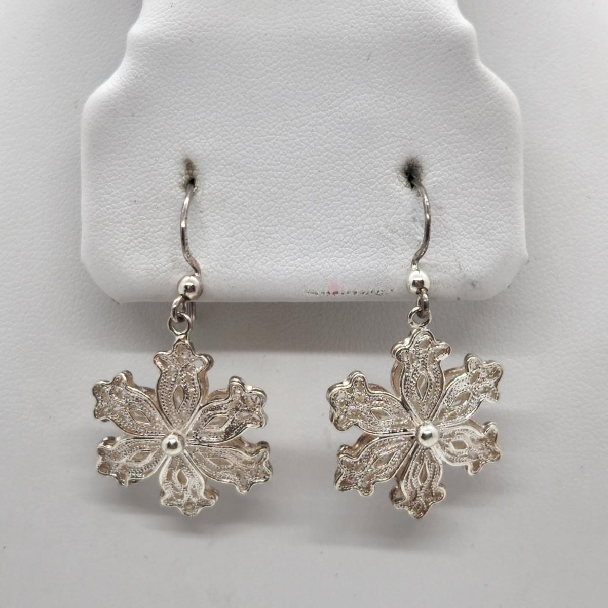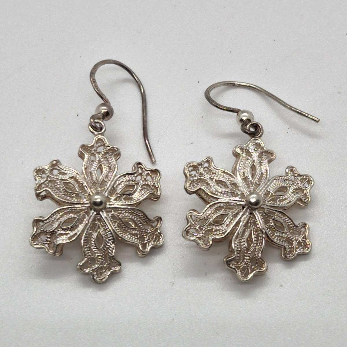 LOT 25RP: Vintage Artisan Crafted Sterling Silver Fillagree Snowflake Earrings w/ Petitepoint Gift Box