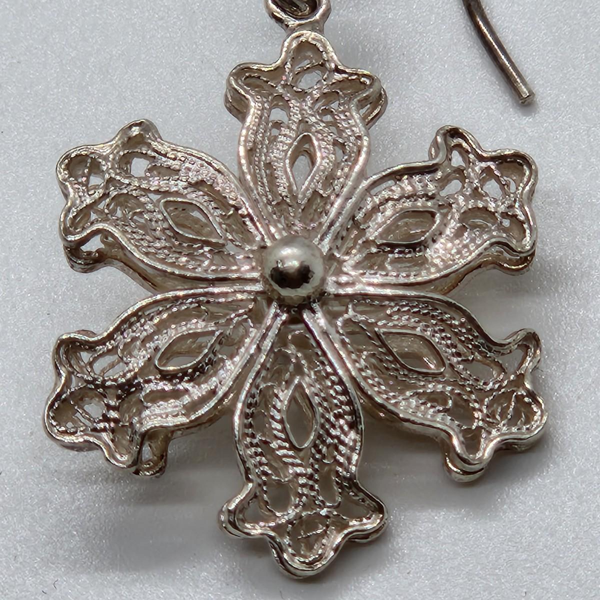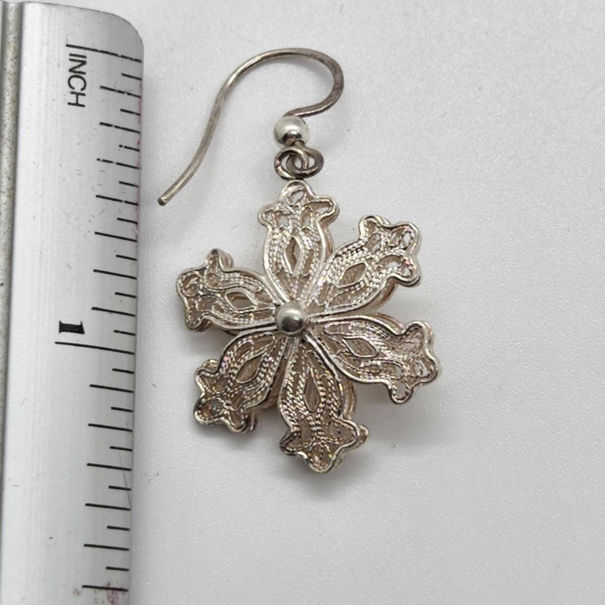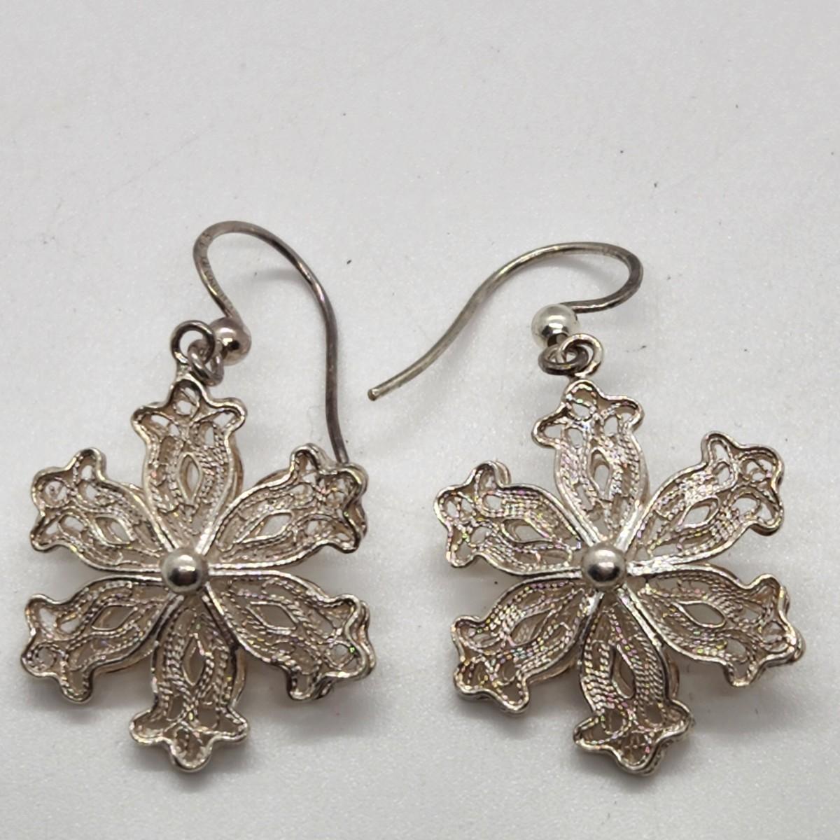 LOT 25RP: Vintage Artisan Crafted Sterling Silver Fillagree Snowflake Earrings w/ Petitepoint Gift Box