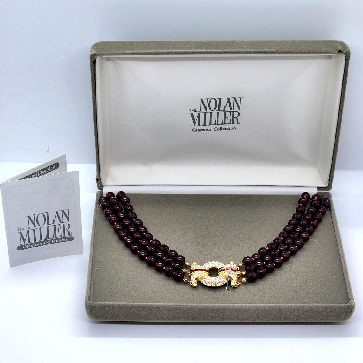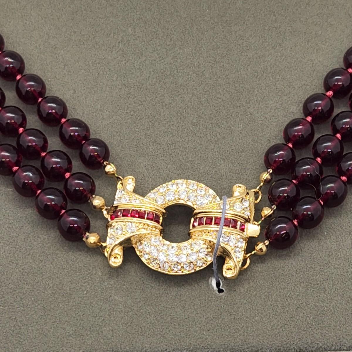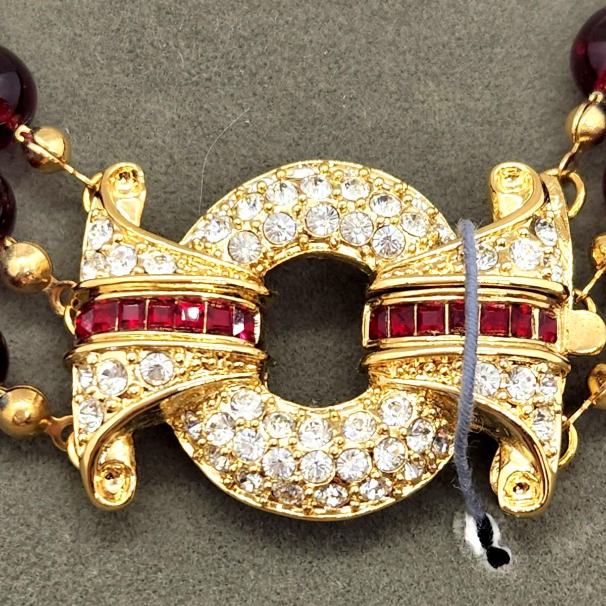 LOT 33RP: Vintage Nolan Miller Three Strand Synthetic Garnet Beaded & Rhinestone 31" Necklace