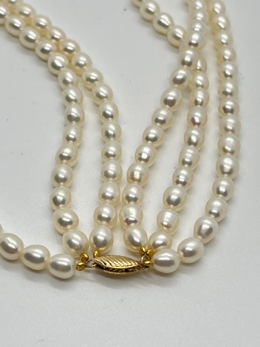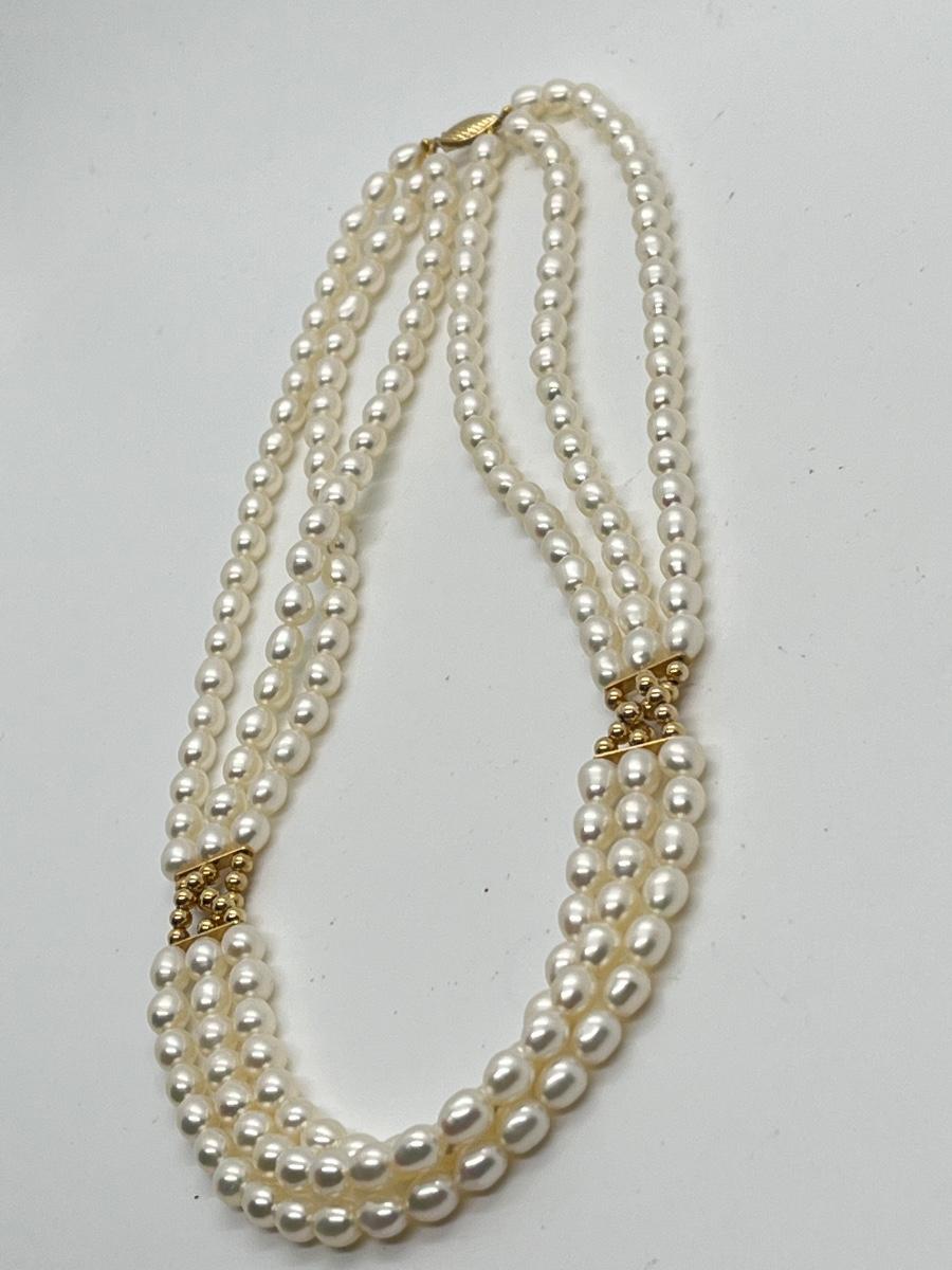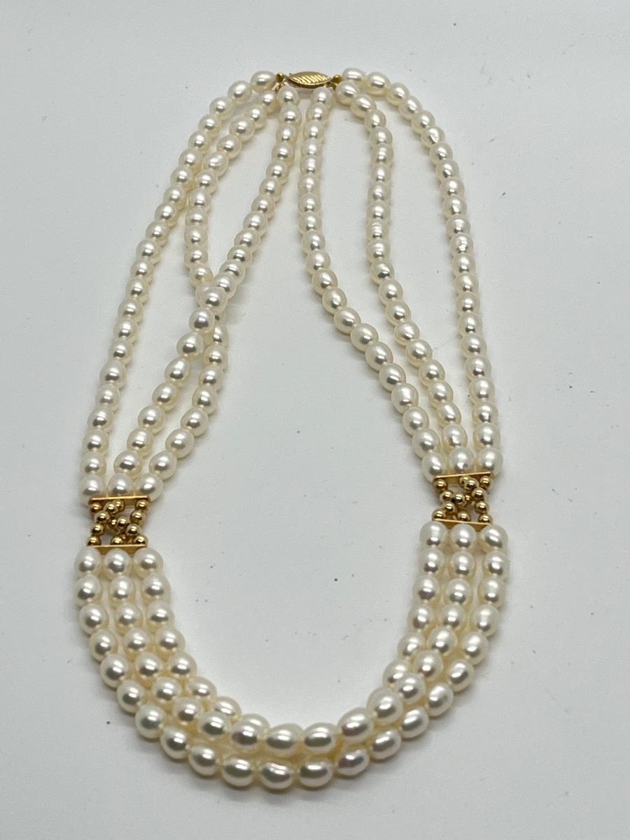 LOT 56: Honora Triple-Strand Cultured Freshwater Pearl & Gold Bead 16" Necklace - 14K on clasp