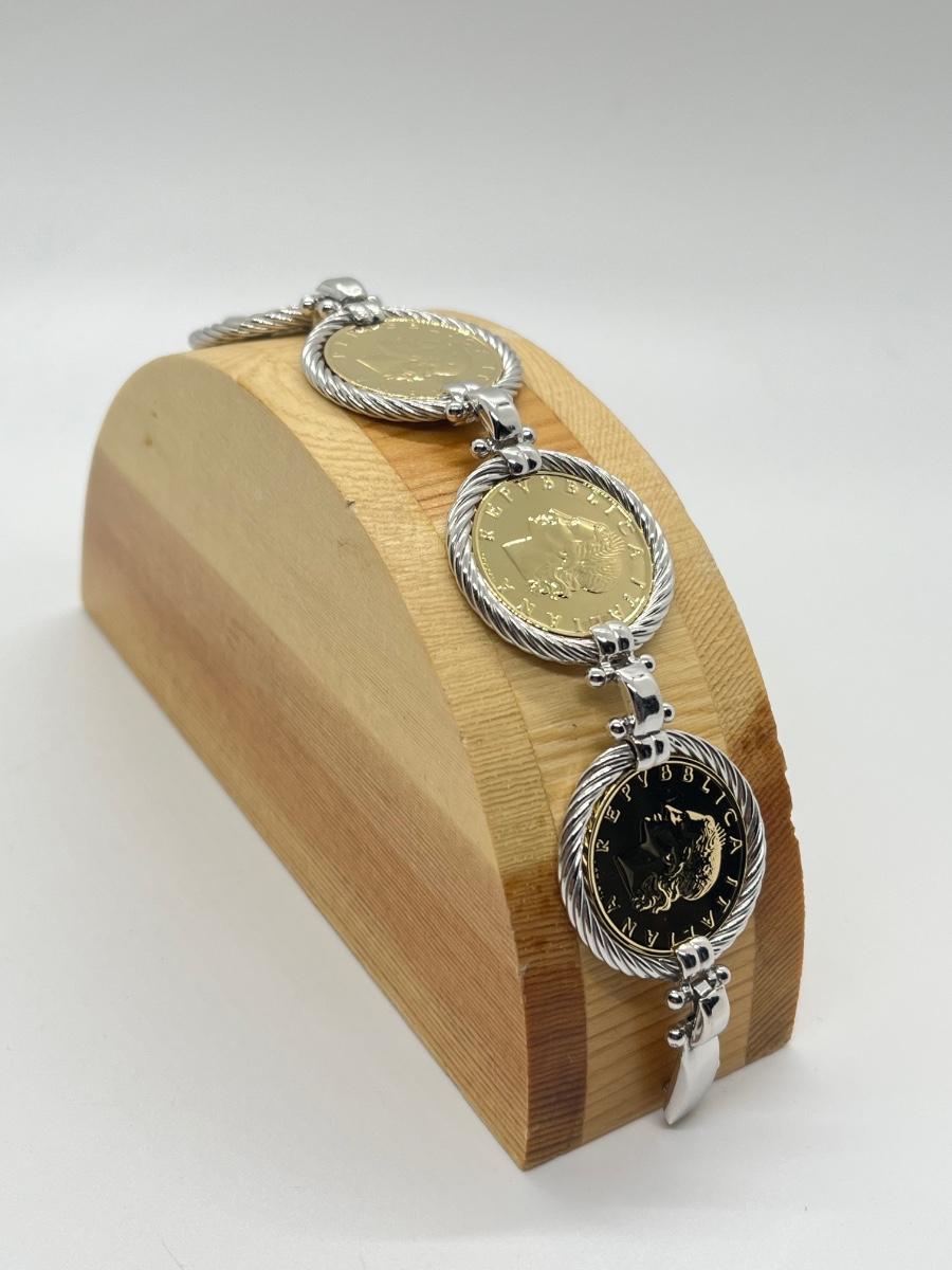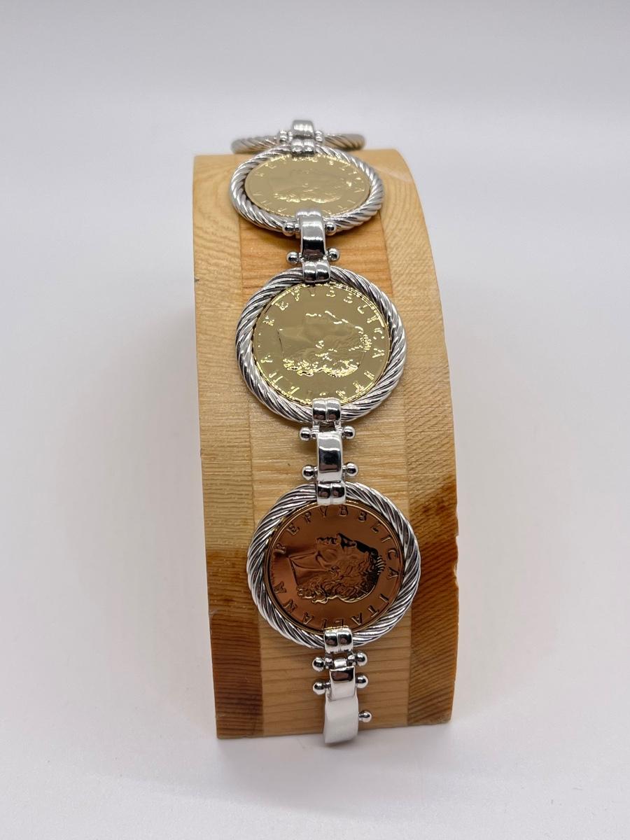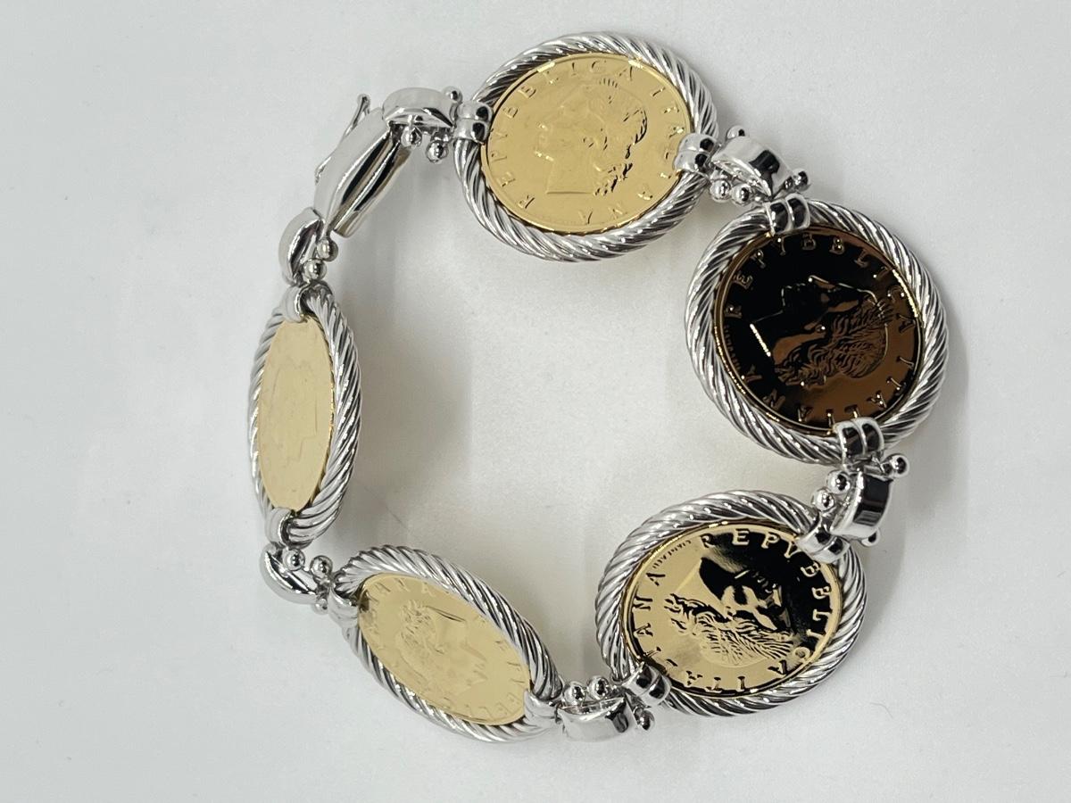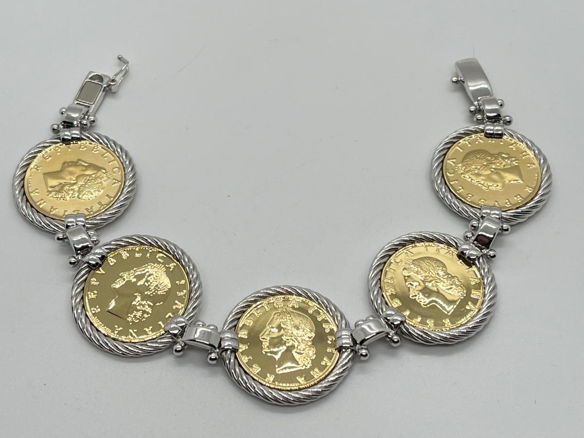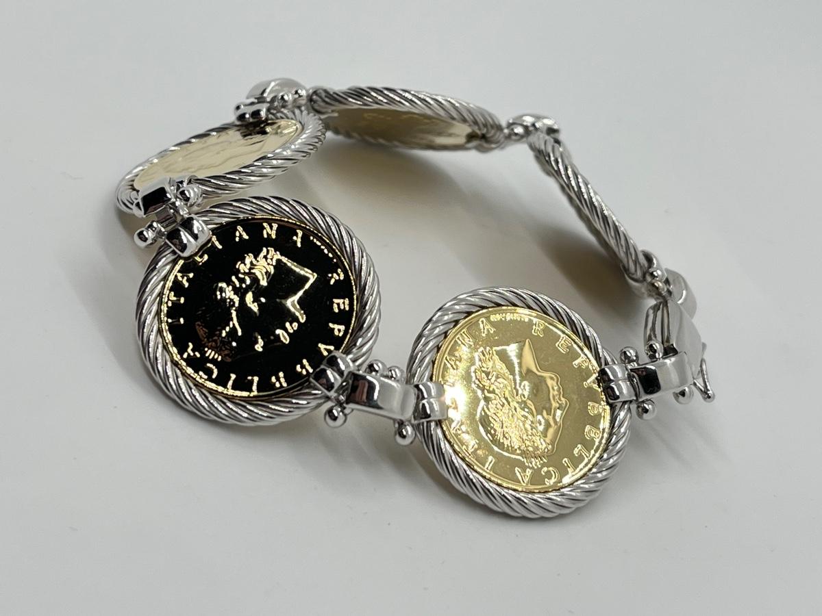 LOT 141J: Vicenza Sterling Silver Authentic Lire Two-Tone Coin Bracelet w/Magnetic Closure/Safety Clasp