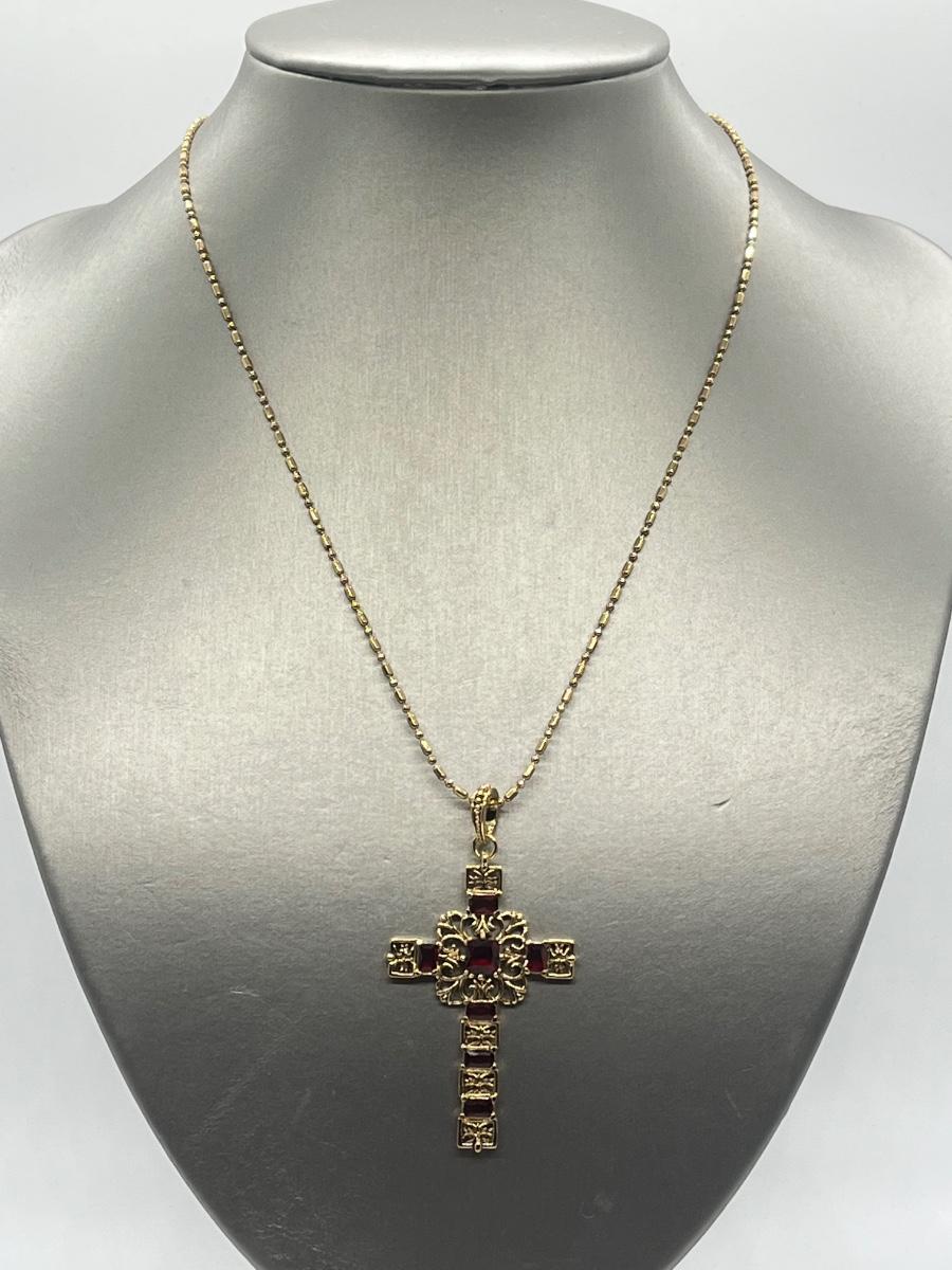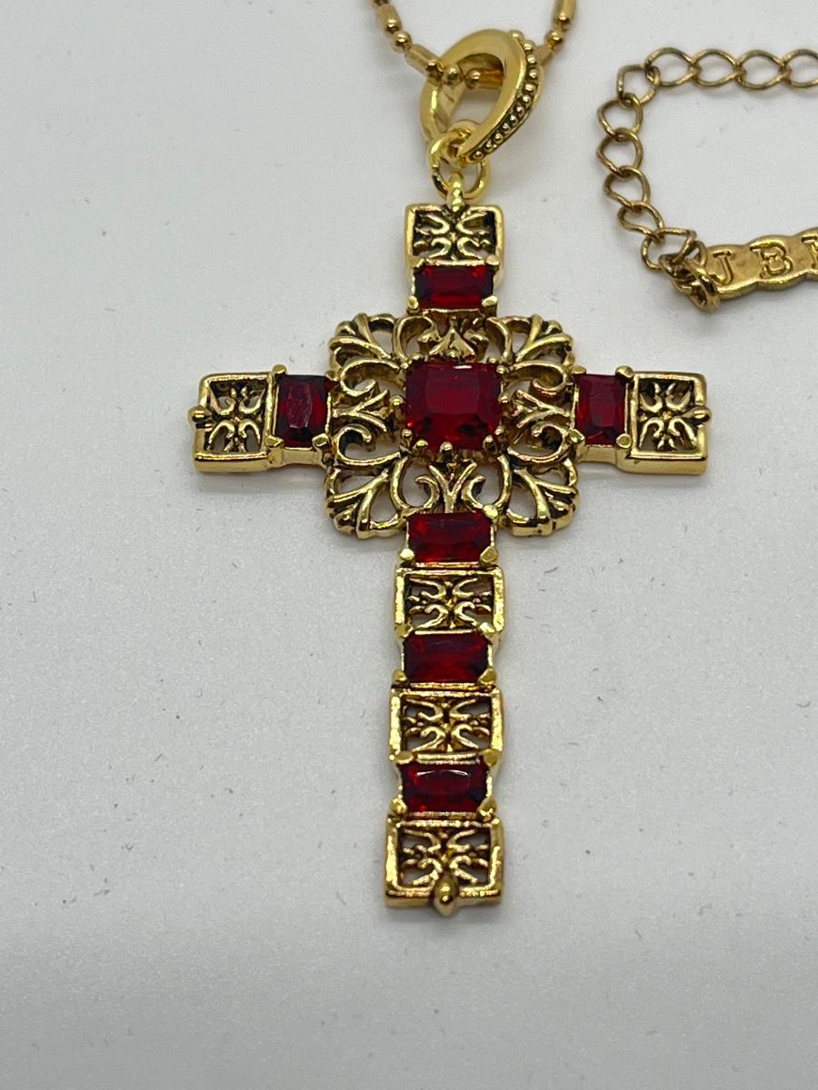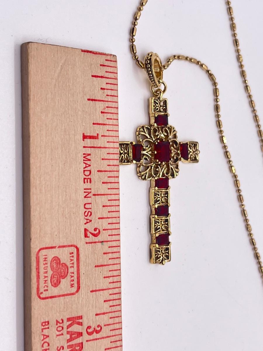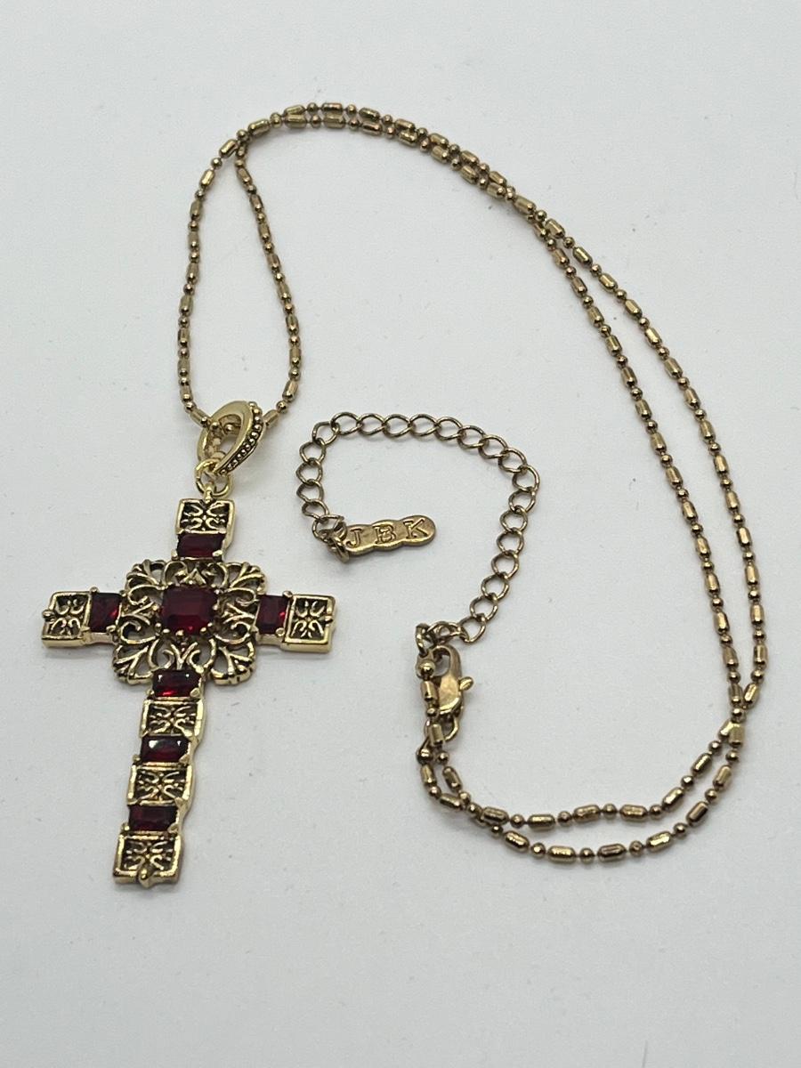 LOT 31: Jaqueline Kennedy Simulated Ruby Cross Pendant on Goldtone Chain - 19" + 3" ext.