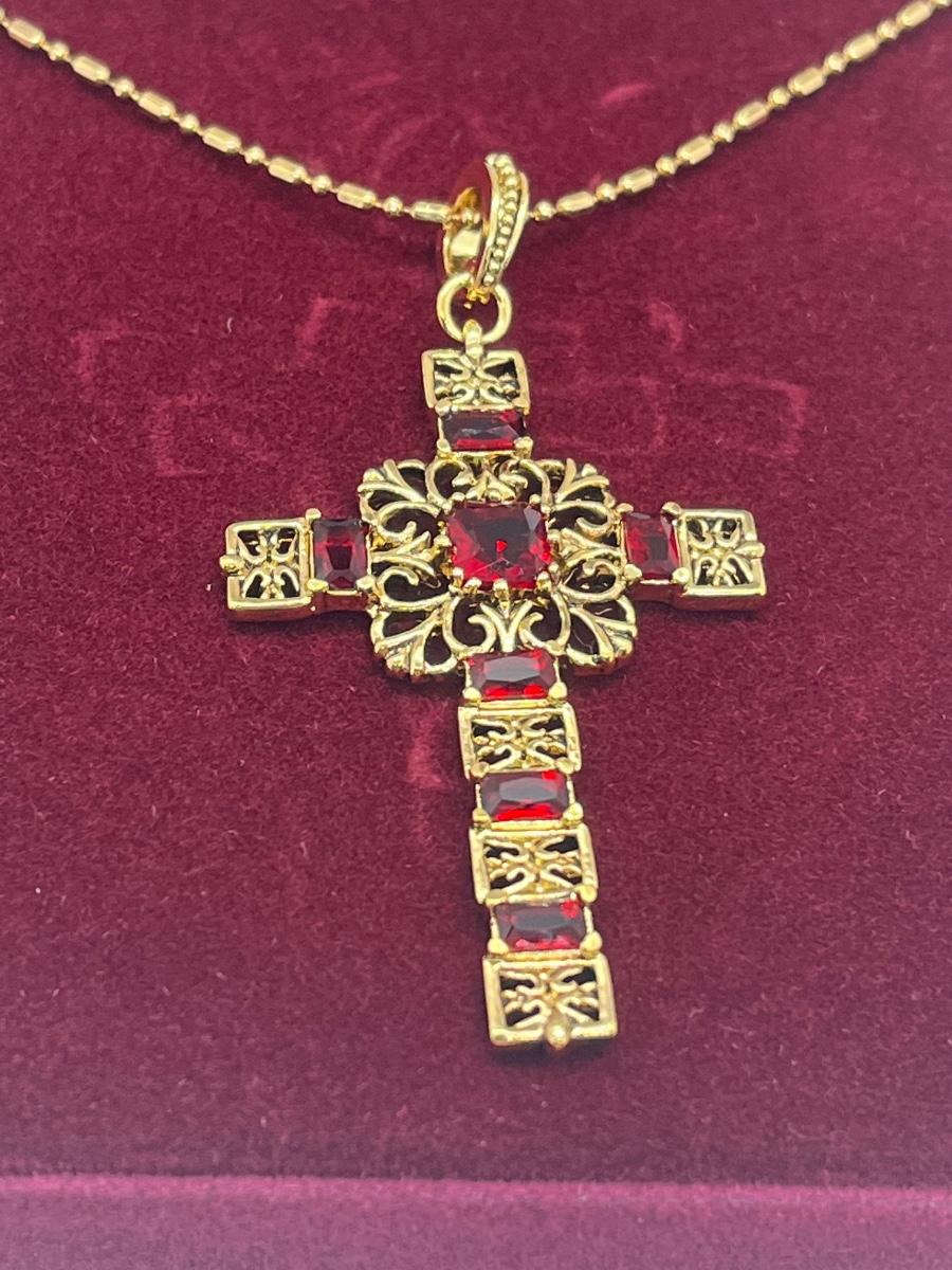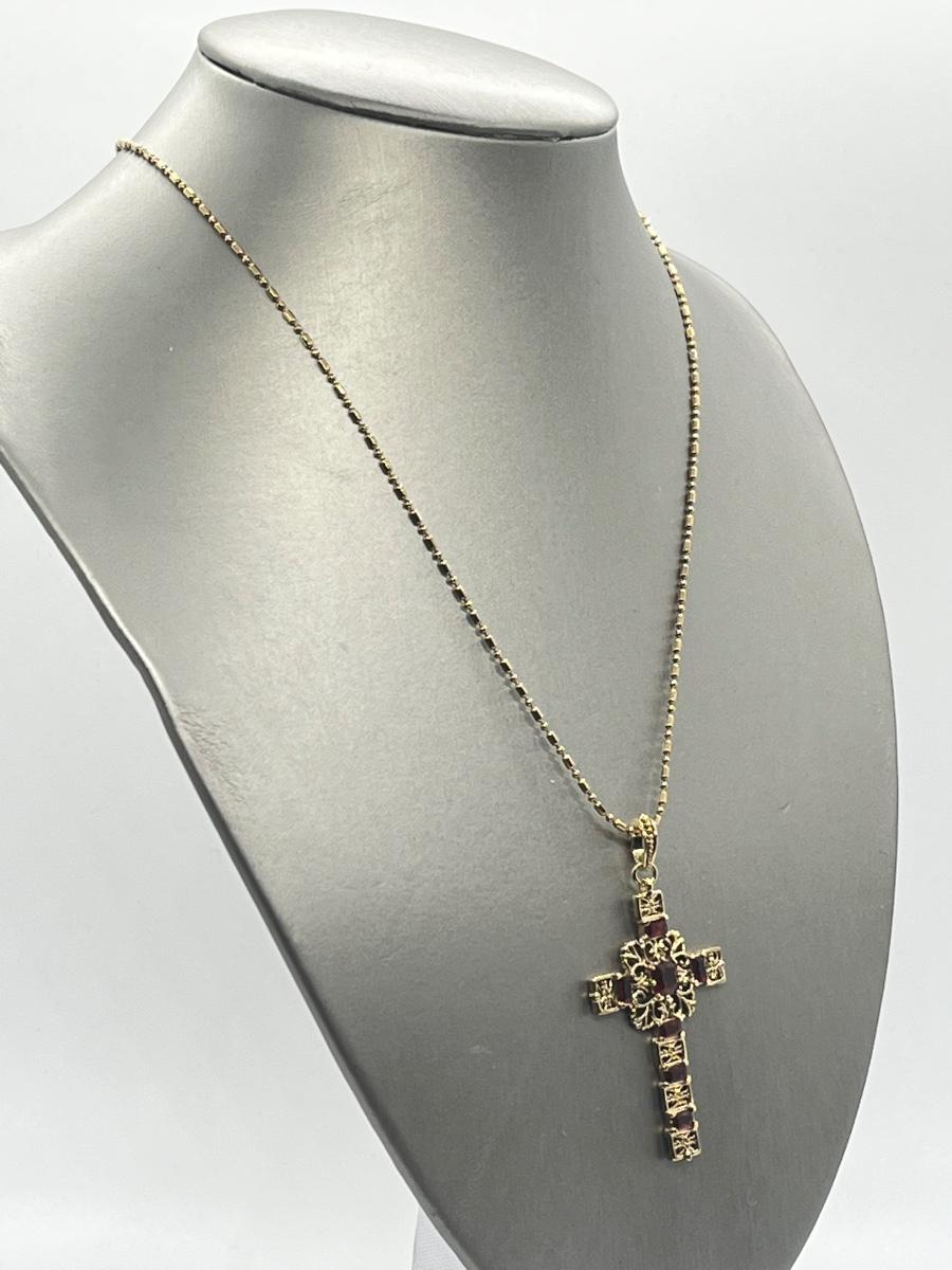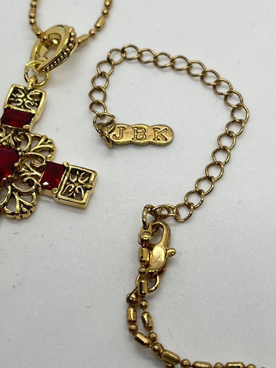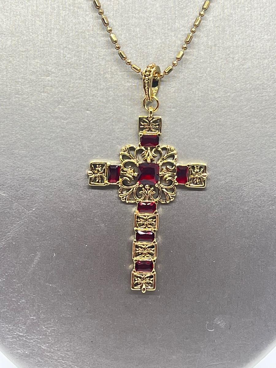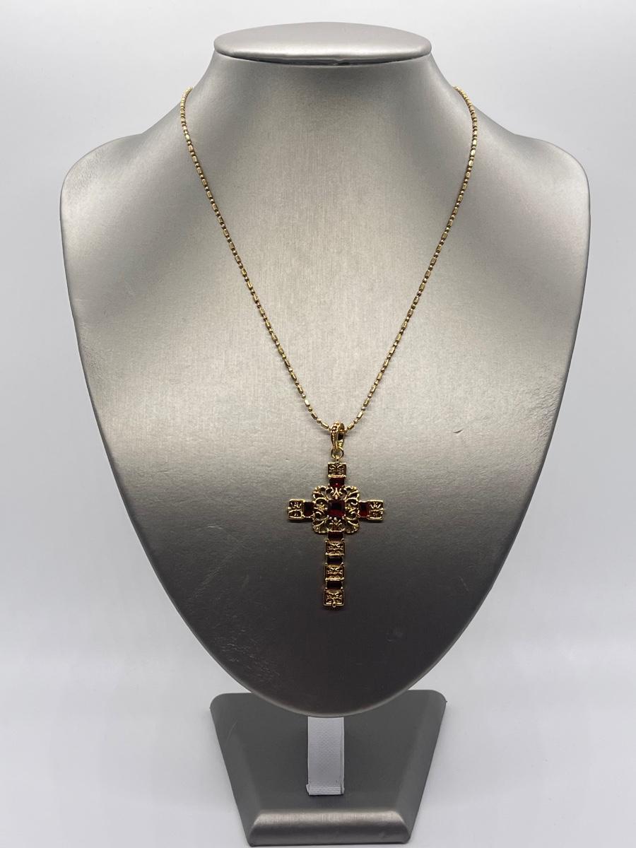 LOT 31: Jaqueline Kennedy Simulated Ruby Cross Pendant on Goldtone Chain - 19" + 3" ext.