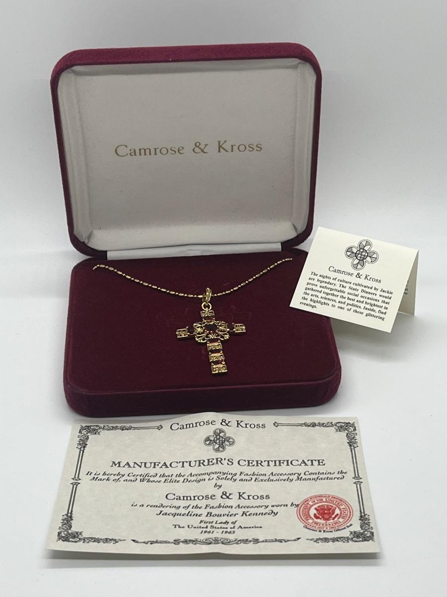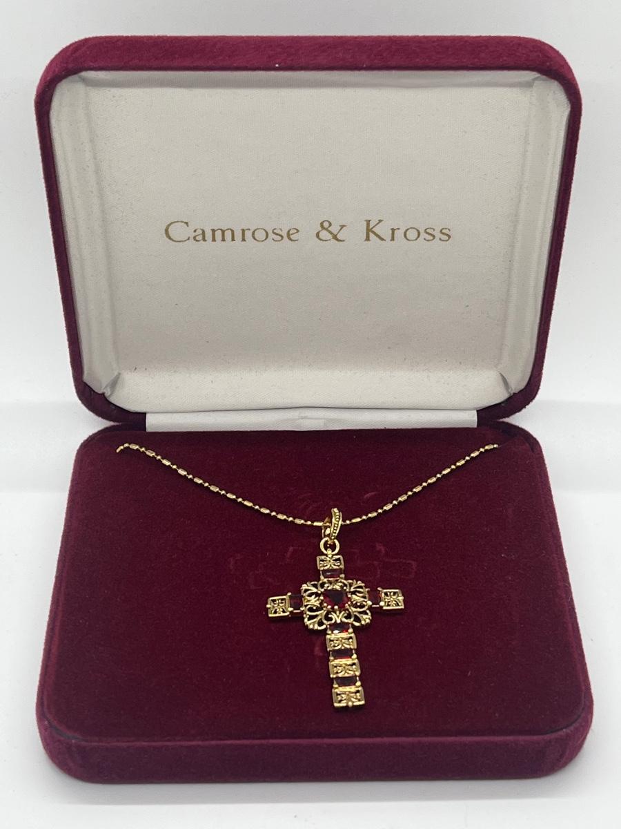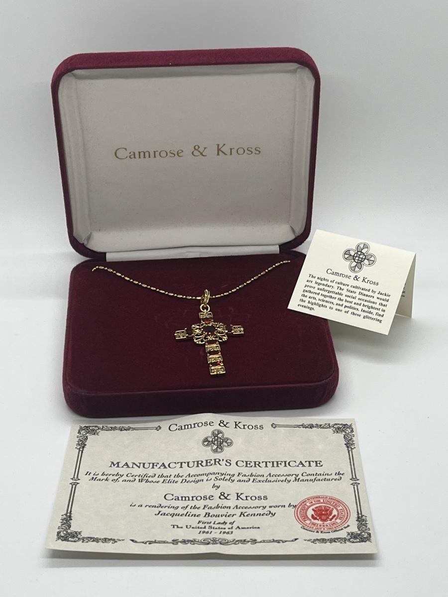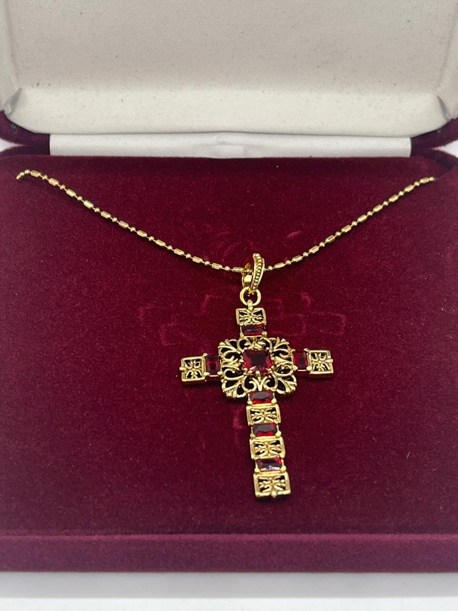 LOT 31: Jaqueline Kennedy Simulated Ruby Cross Pendant on Goldtone Chain - 19" + 3" ext.
