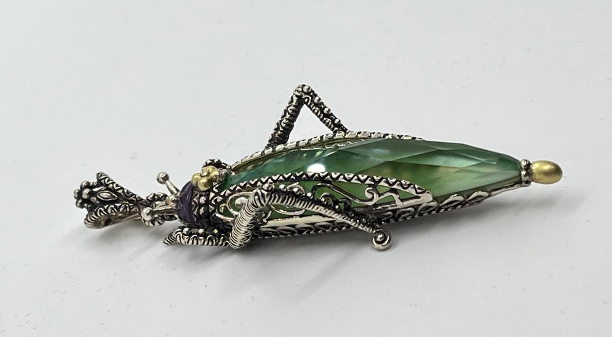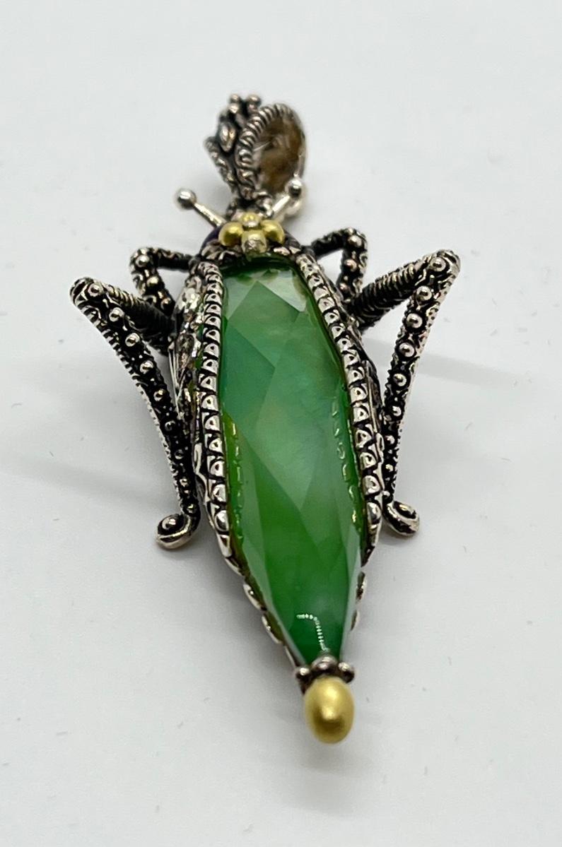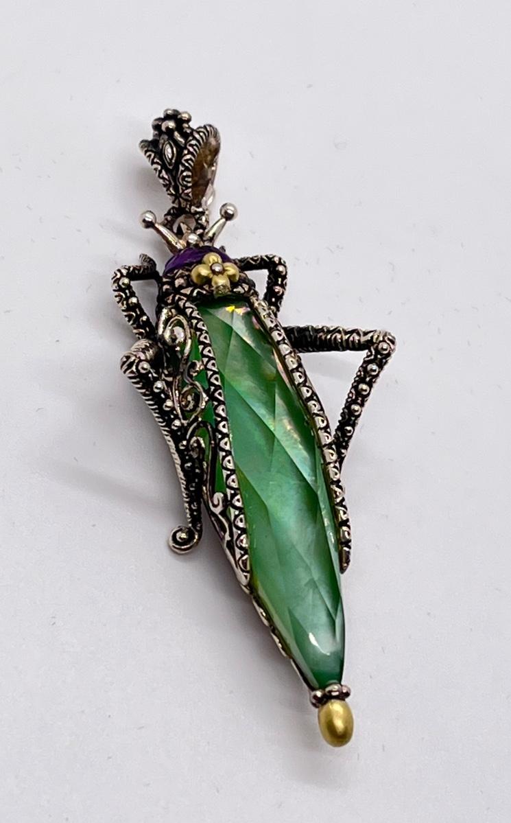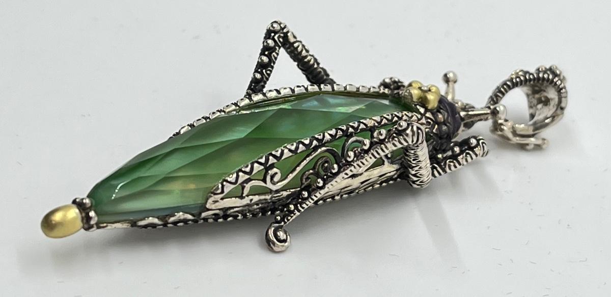LOT 36: Barbara Bixby Sterling Silver & 18K Gold Gemstone Grasshopper Pendant