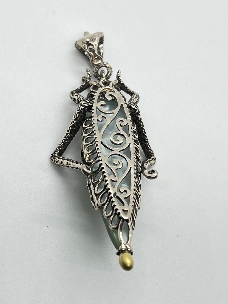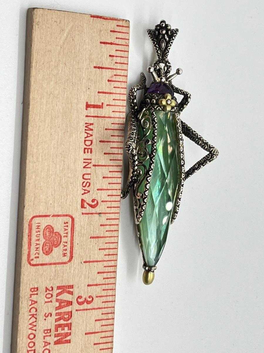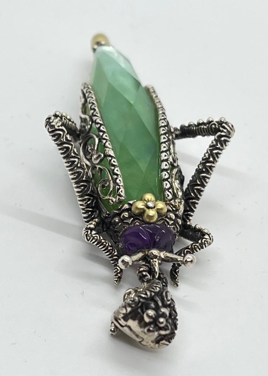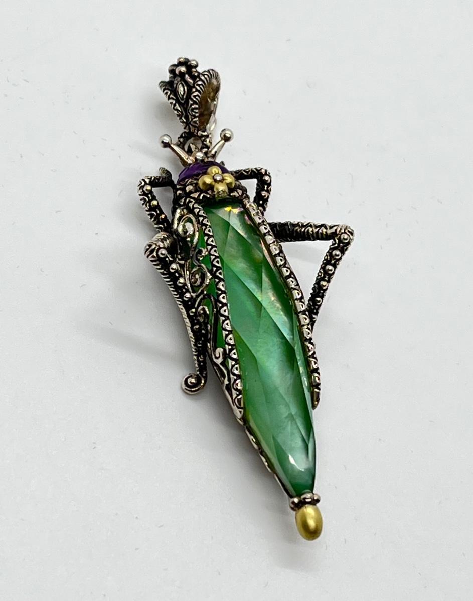 LOT 36: Barbara Bixby Sterling Silver & 18K Gold Gemstone Grasshopper Pendant