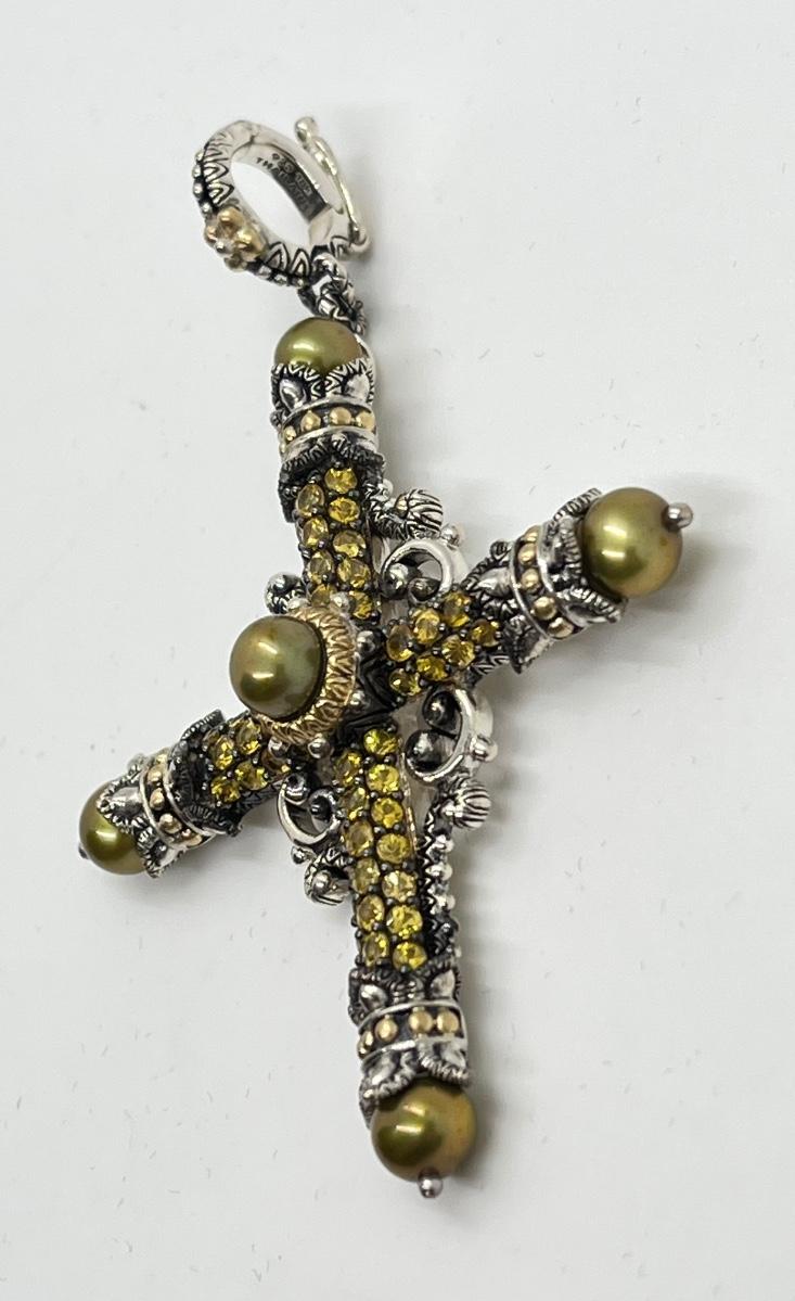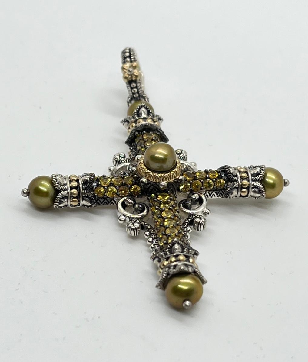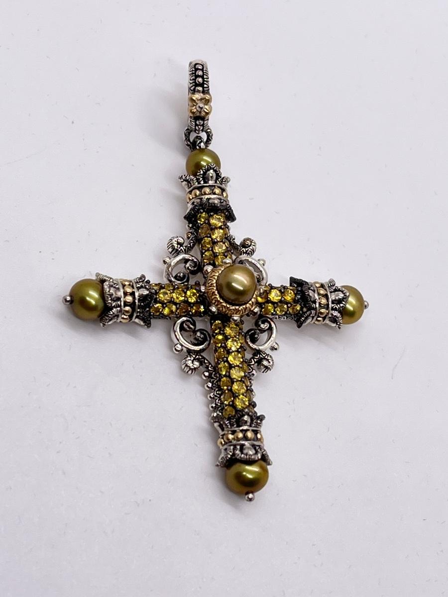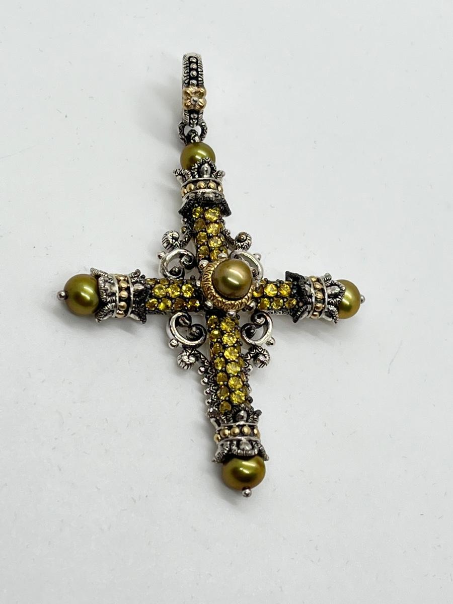LOT 41: Barbara Bixby Sterling Silver & 18K Gold 2 ct tw Pave Gemstone Cross - Yellow Sapphire