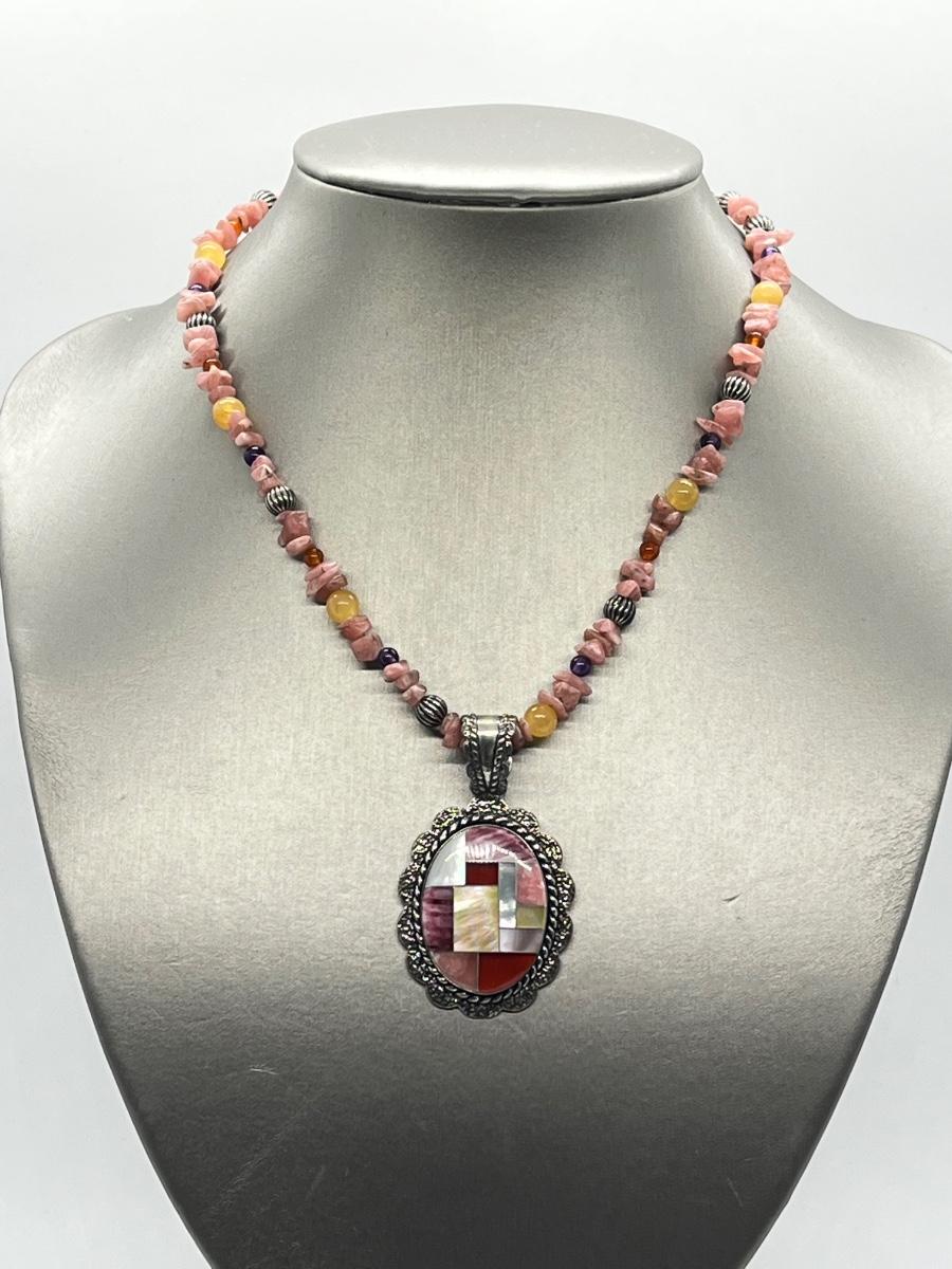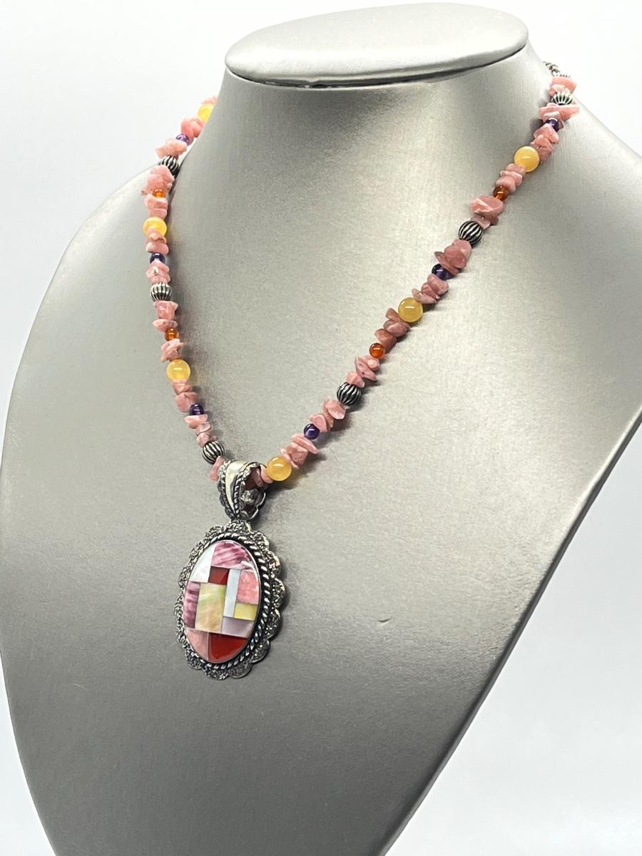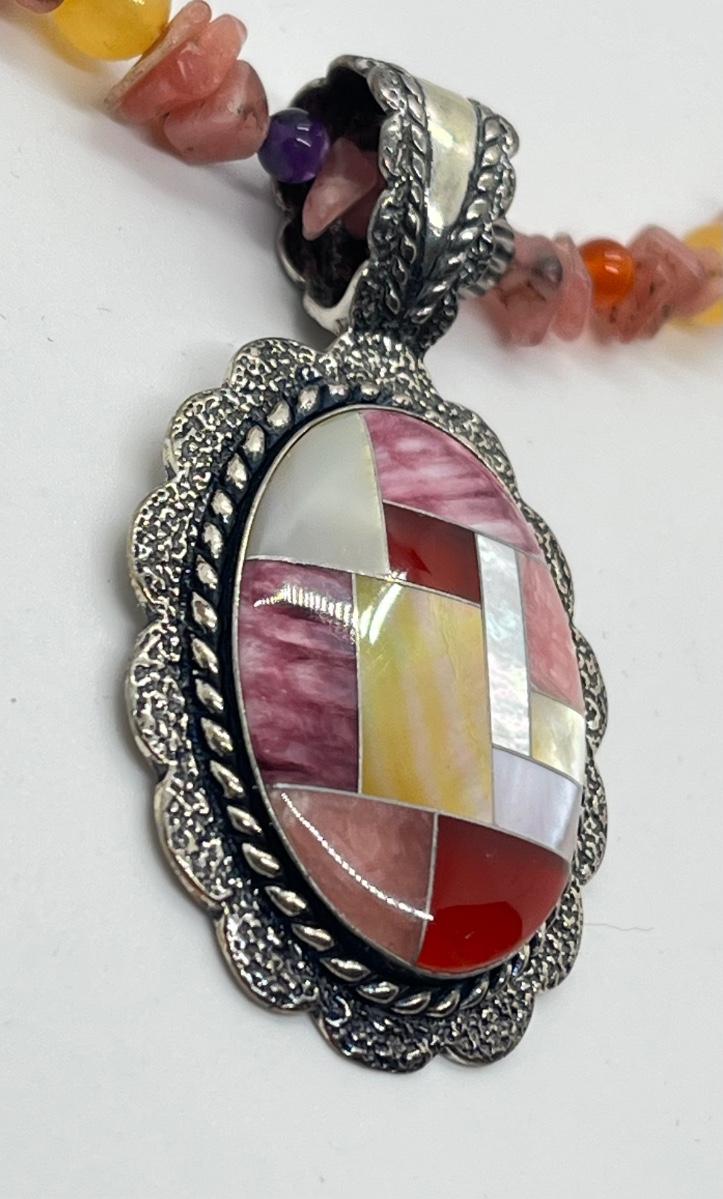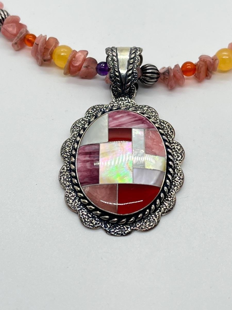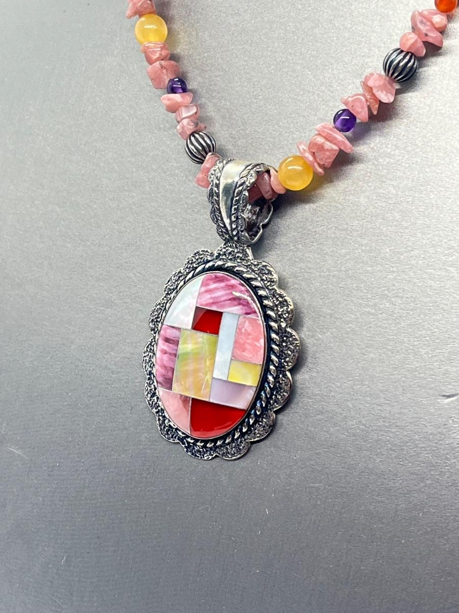 LOT 78: Southwestern Citrus Berry Inlay Pendant on 16" Beaded Necklace with 4" Ext.
