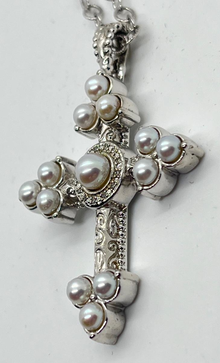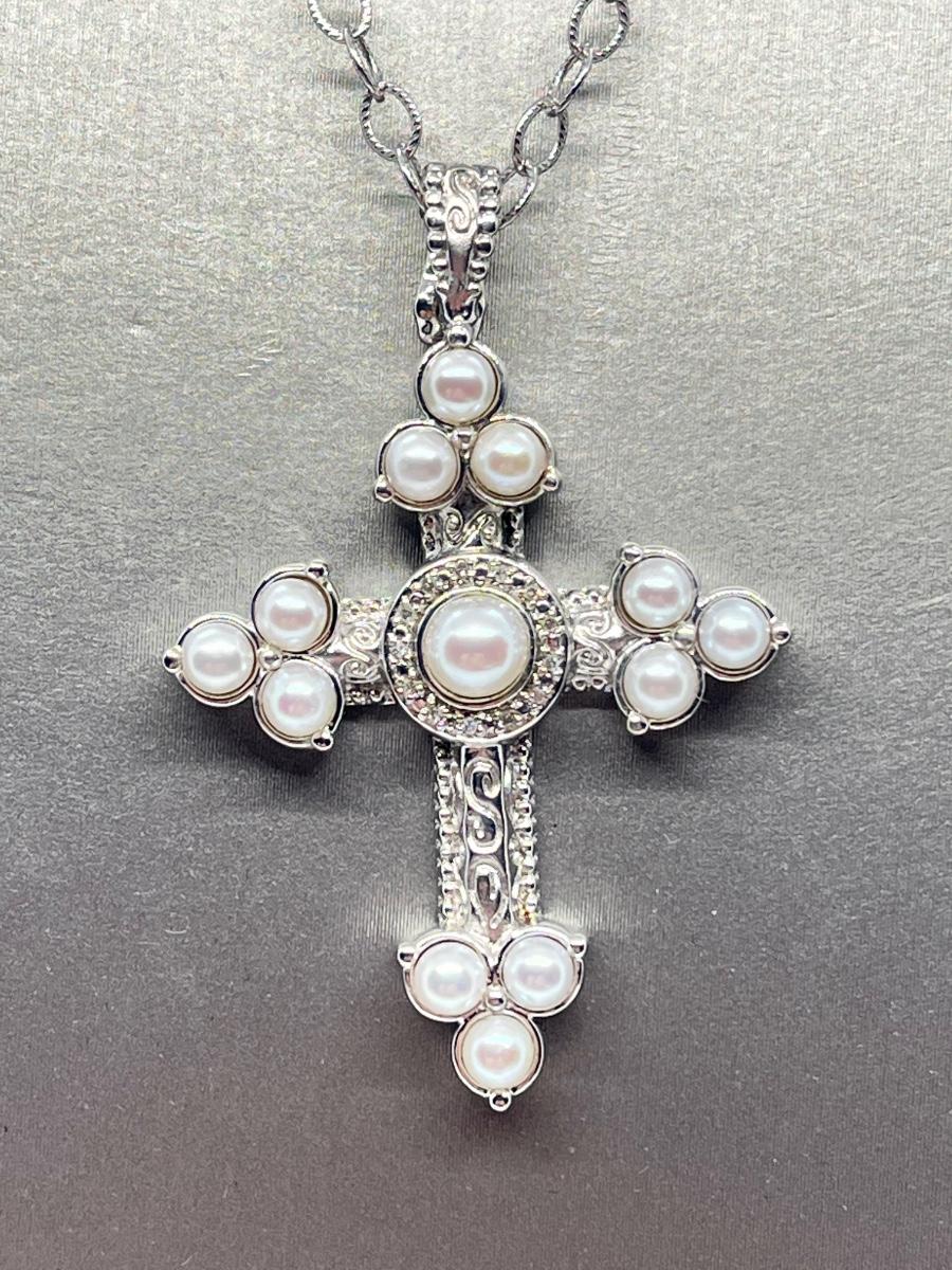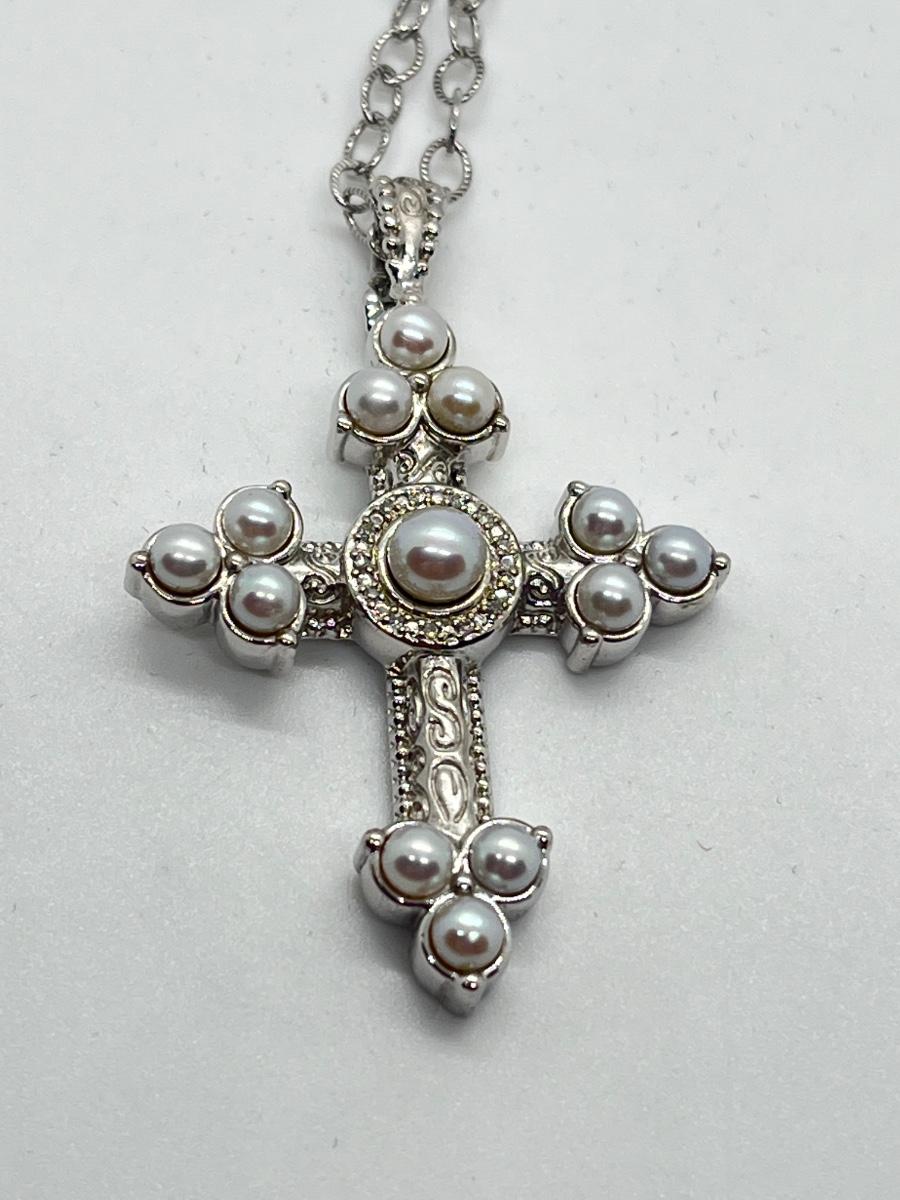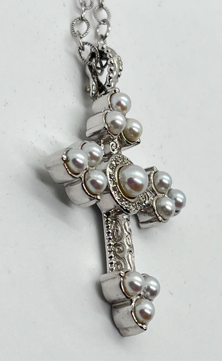 LOT 94: Legacy Naomi Sterling Silver & Cultured Pearl Cross on 17" Chain
