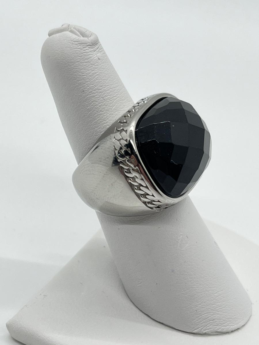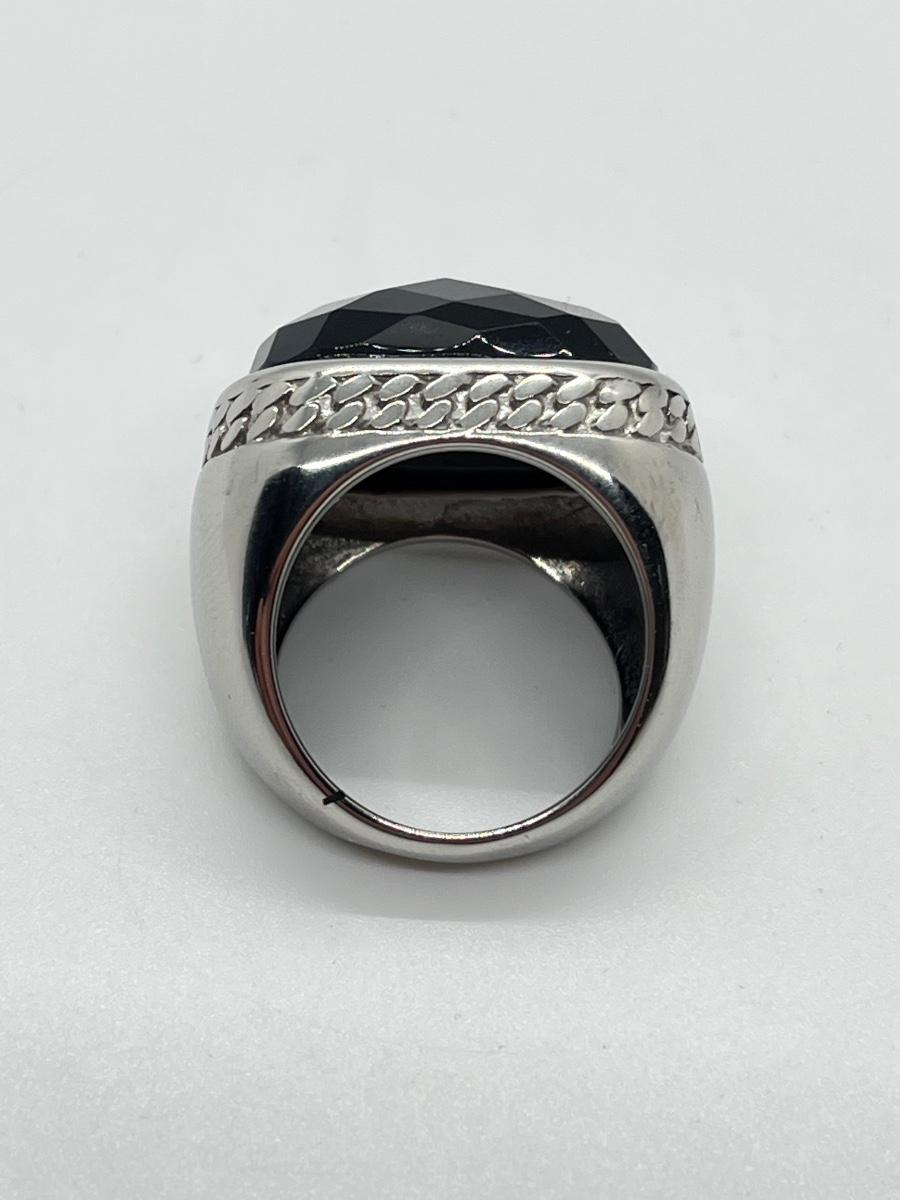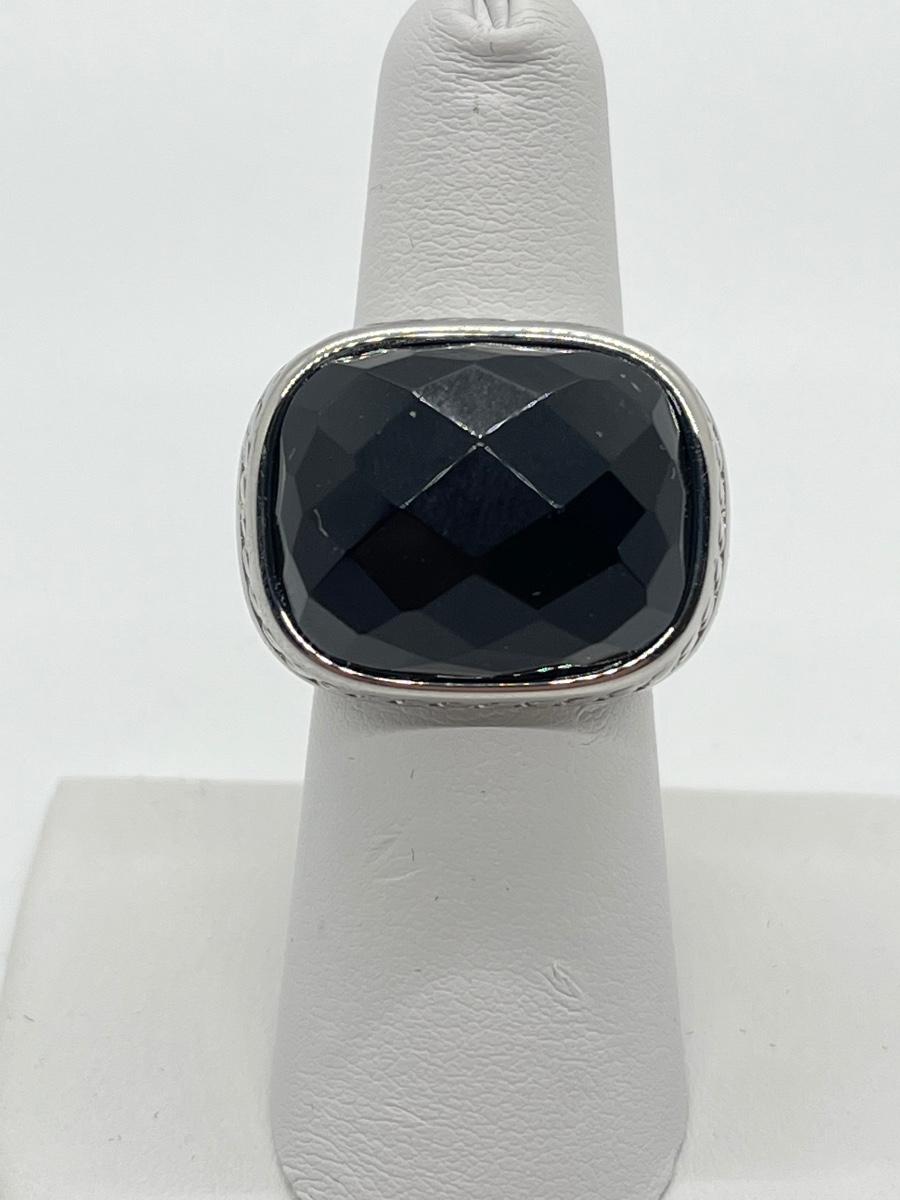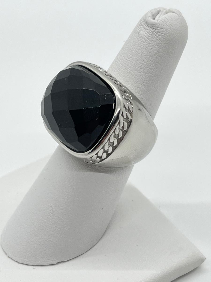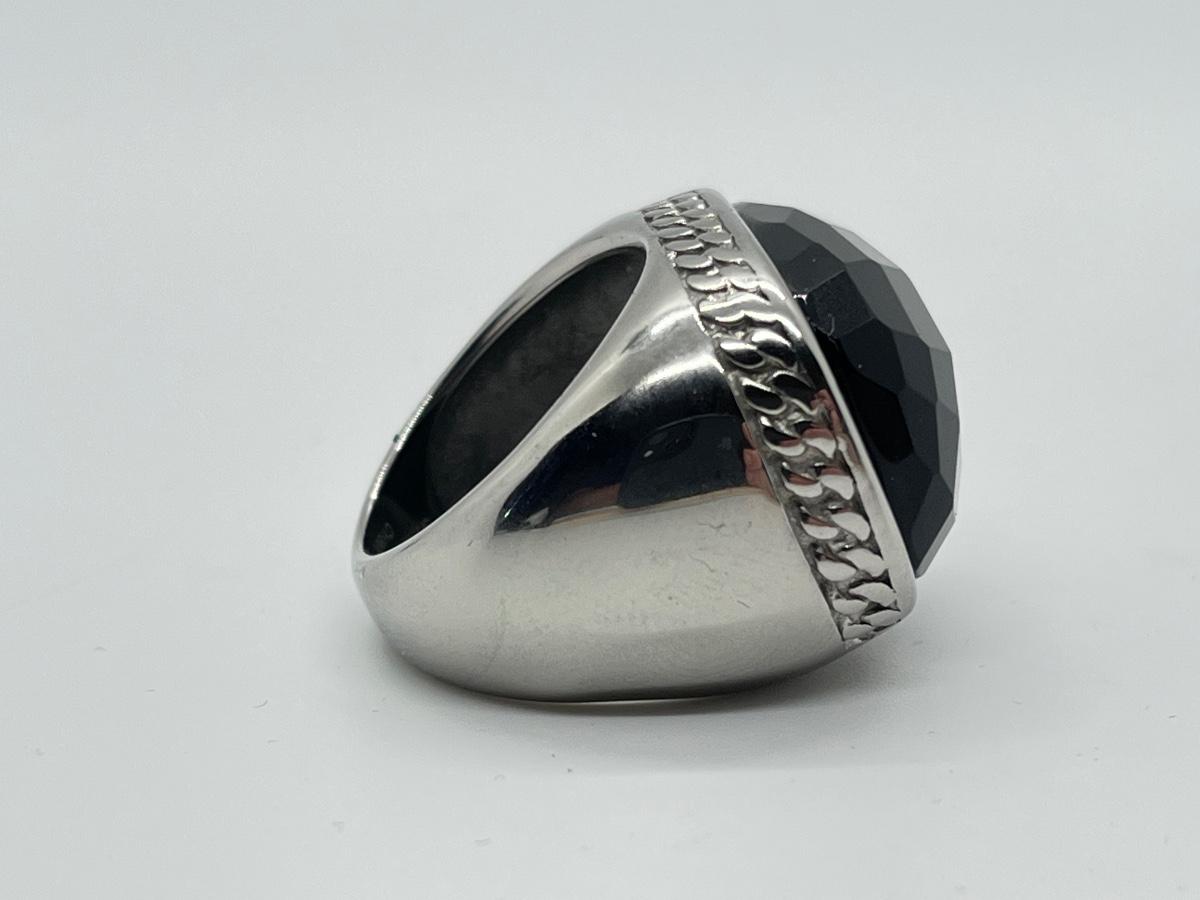 LOT 106: Steel By Design Stainless Steel & Faceted Onyx Gemstone Rectangle Ring - Size 6